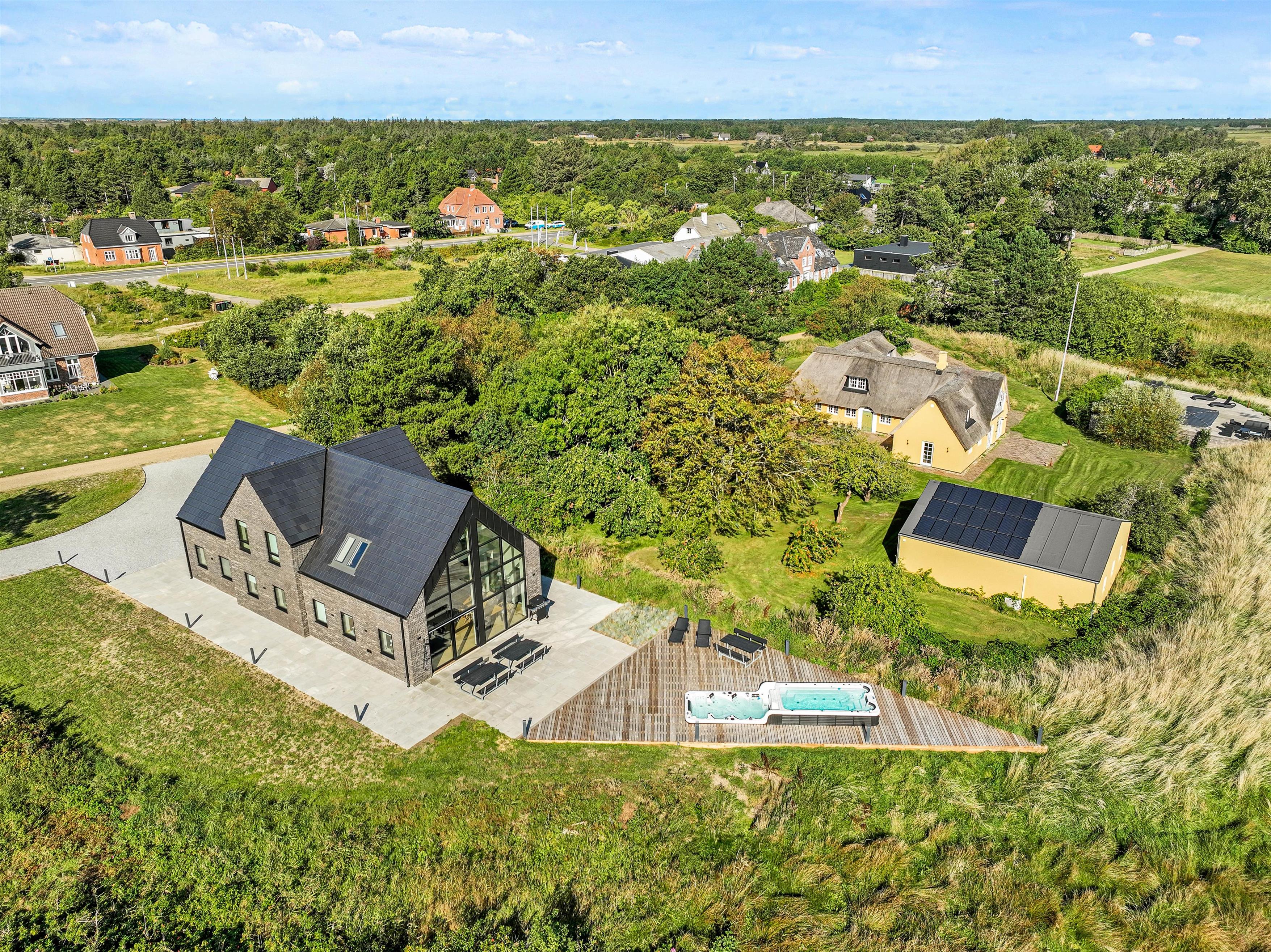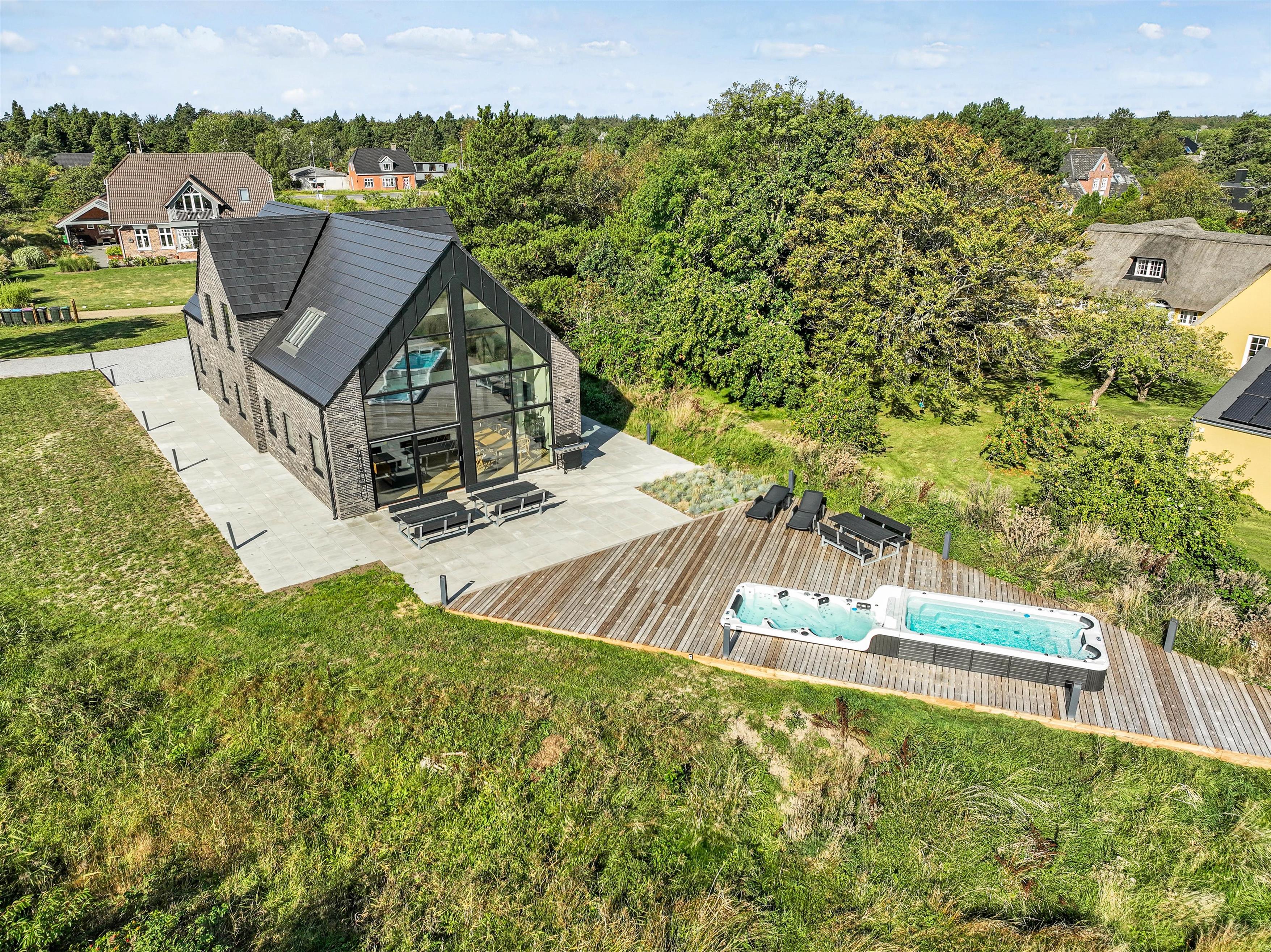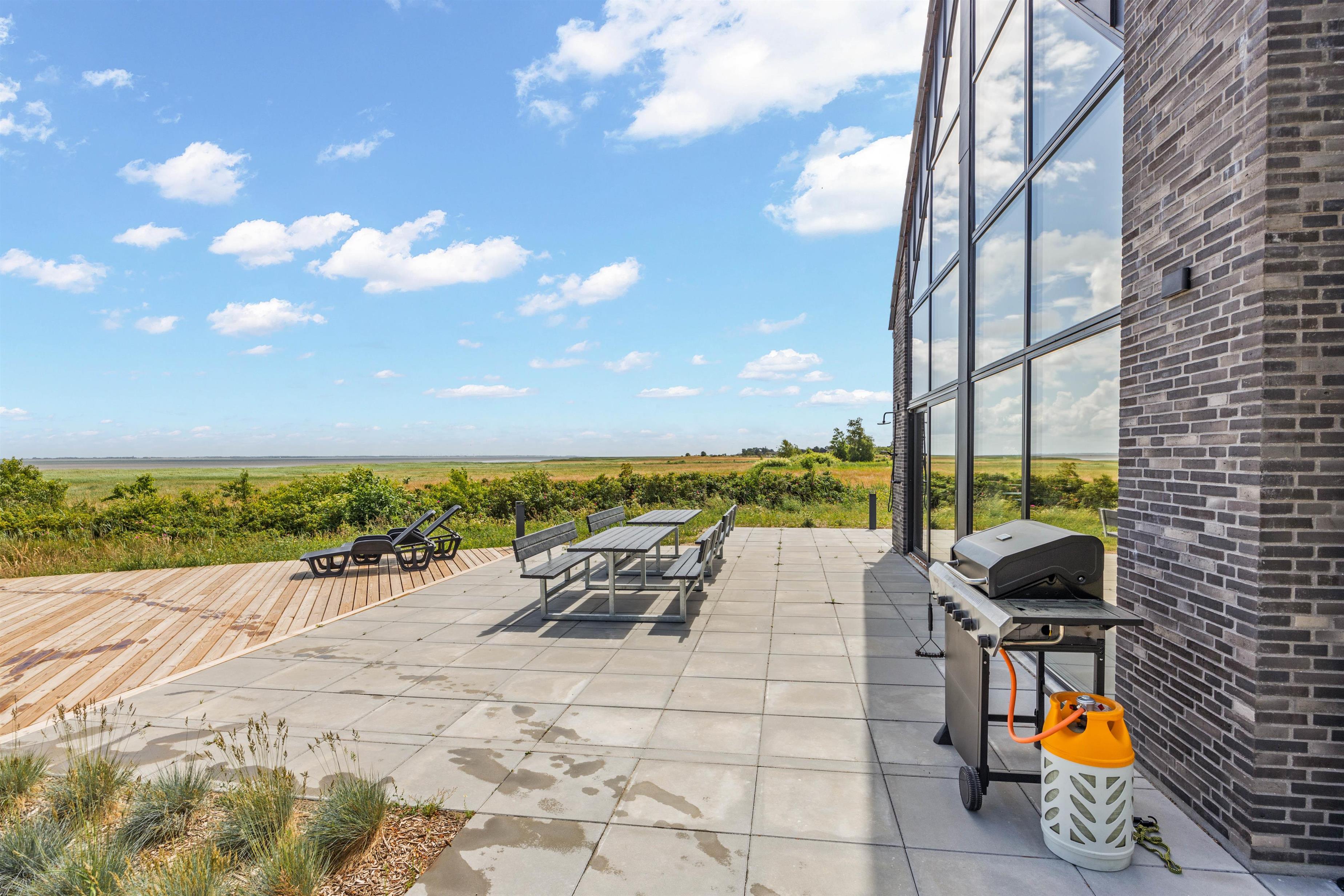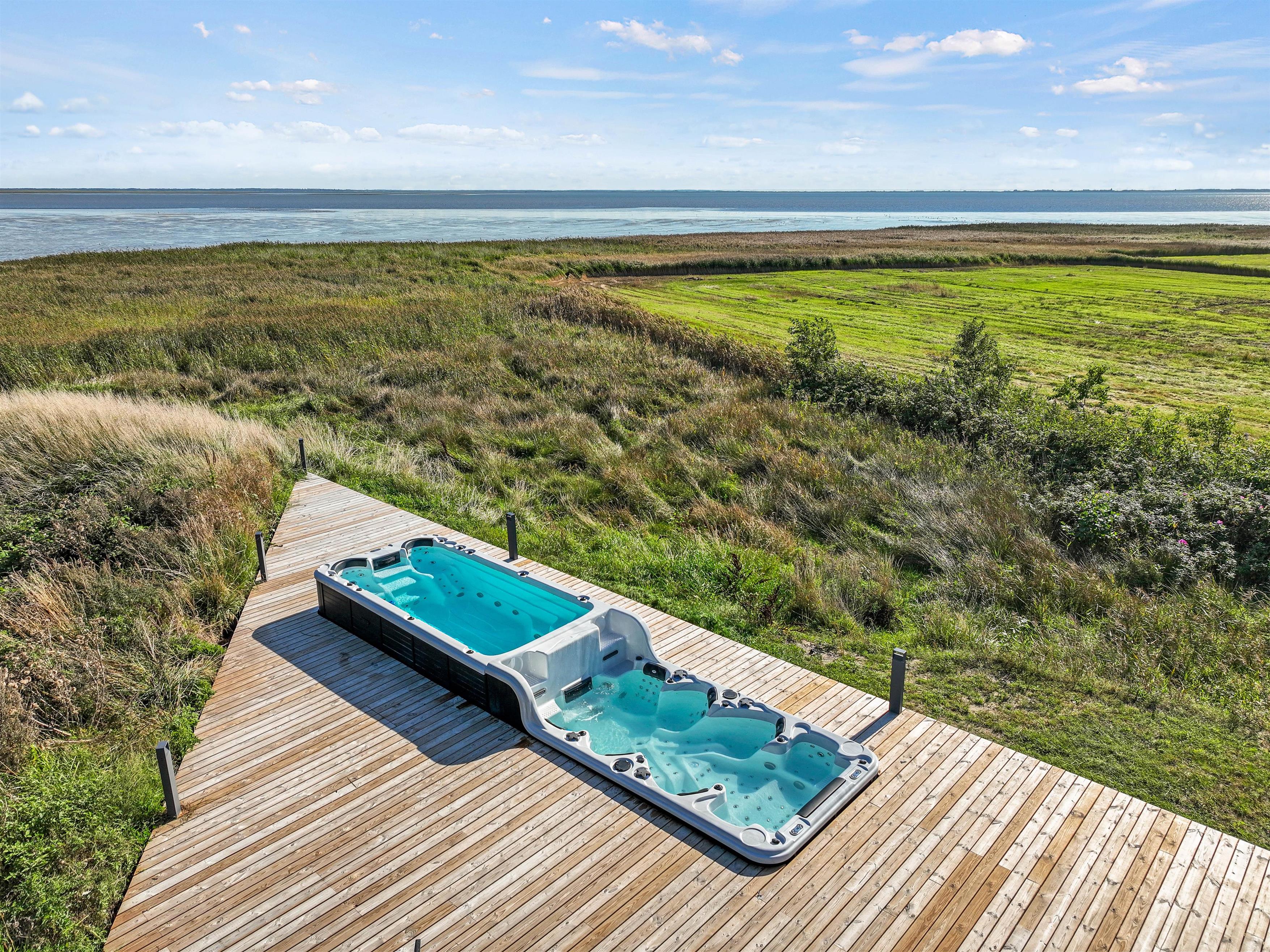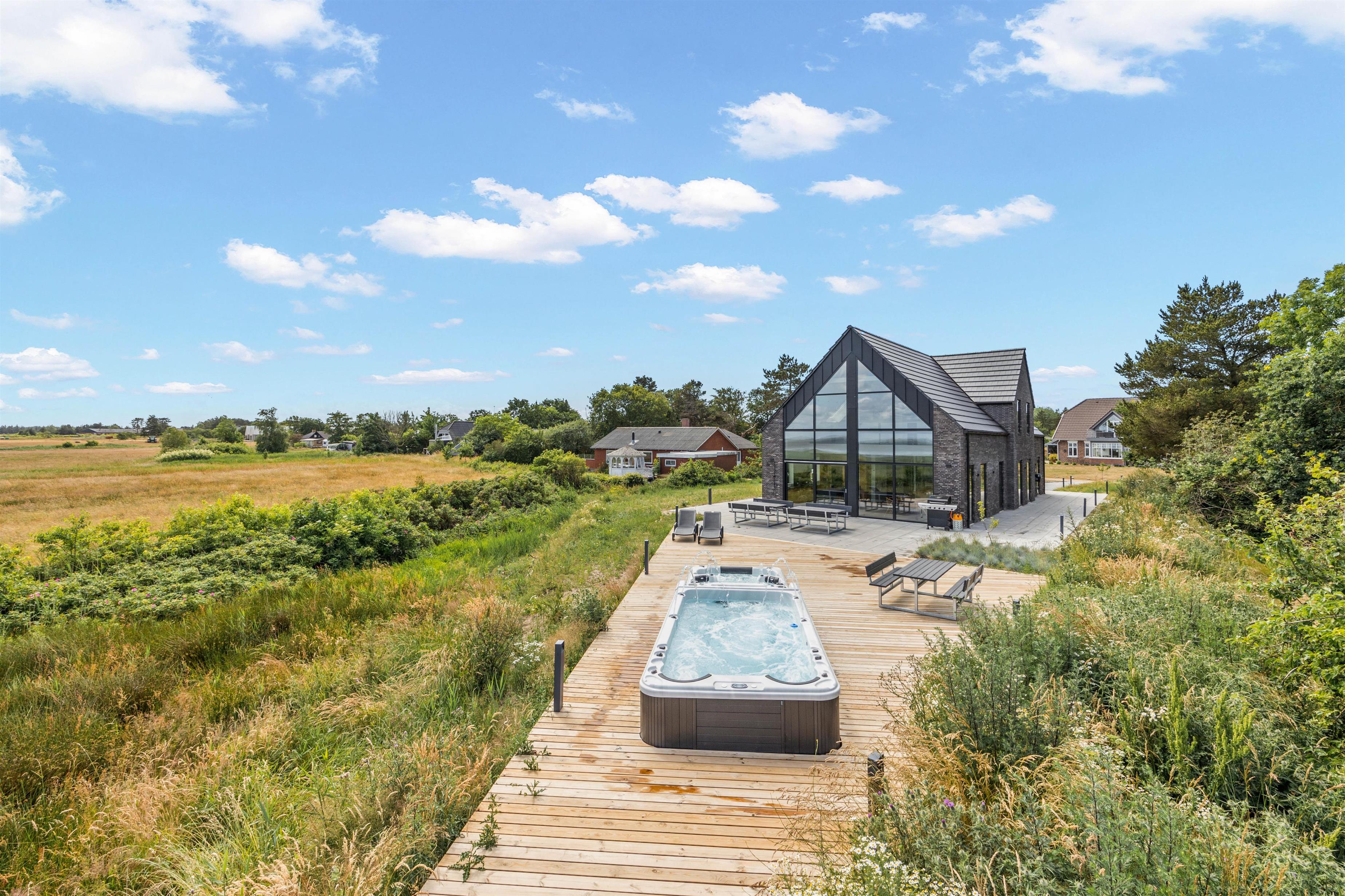 På den åbne terrasse kan I nyde solen og vesterhavsluften i de komfortable havemøbler og solvogne, imens I nyder udsigten til det glitrende vadehav. Hvis I har hund med, kan I tage den med på gåture langs stranden. Og I kan afholde en grillaften og derefter slappe af i udespaen. Som noget helt specielt har dette hus en svømmejacuzzi i forbindelse med udendørs 8 personers spabad - så der er både mulighed for ren afslapning og være aktiv i vandet. Feriehuset har også ladestik til din el-bil.