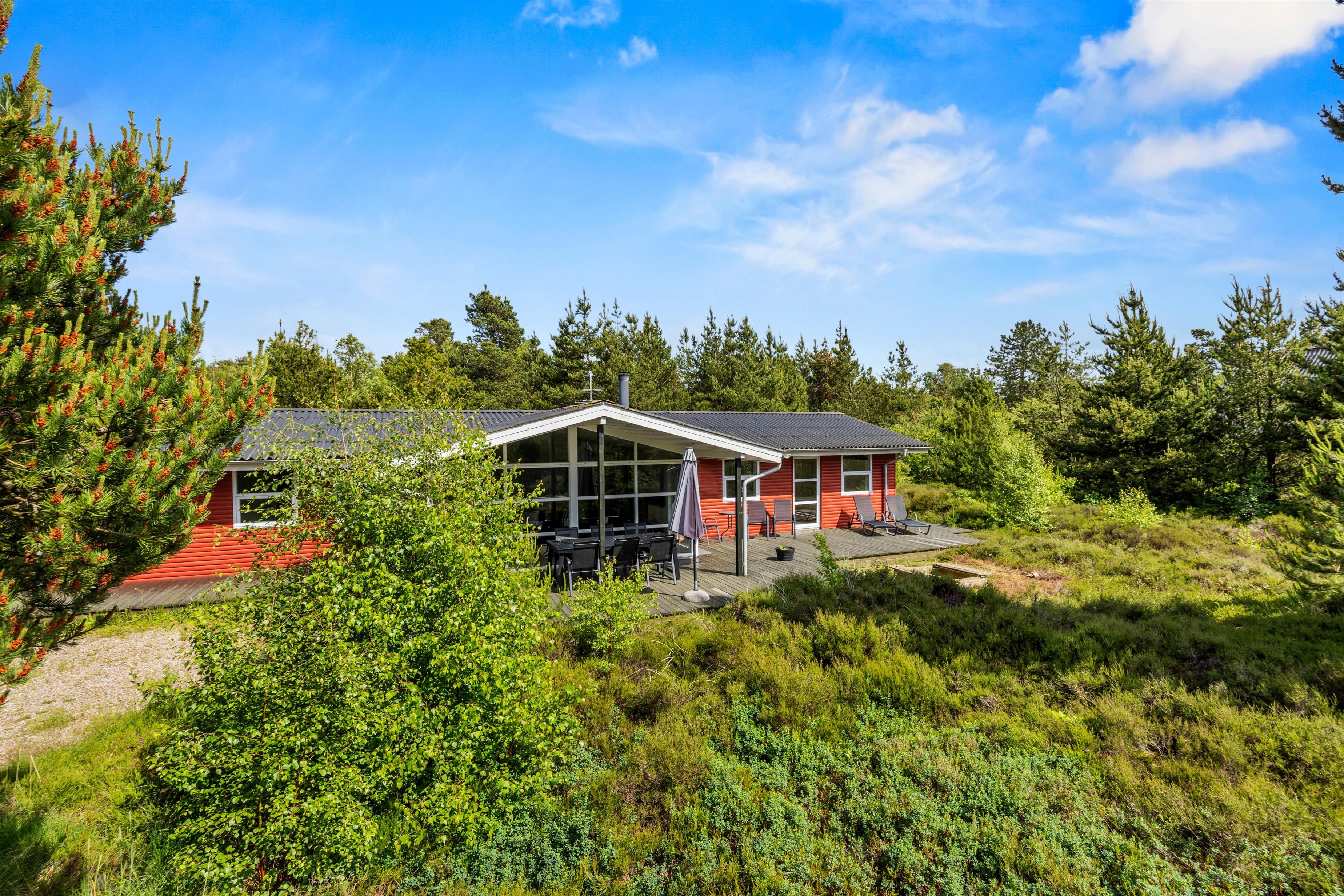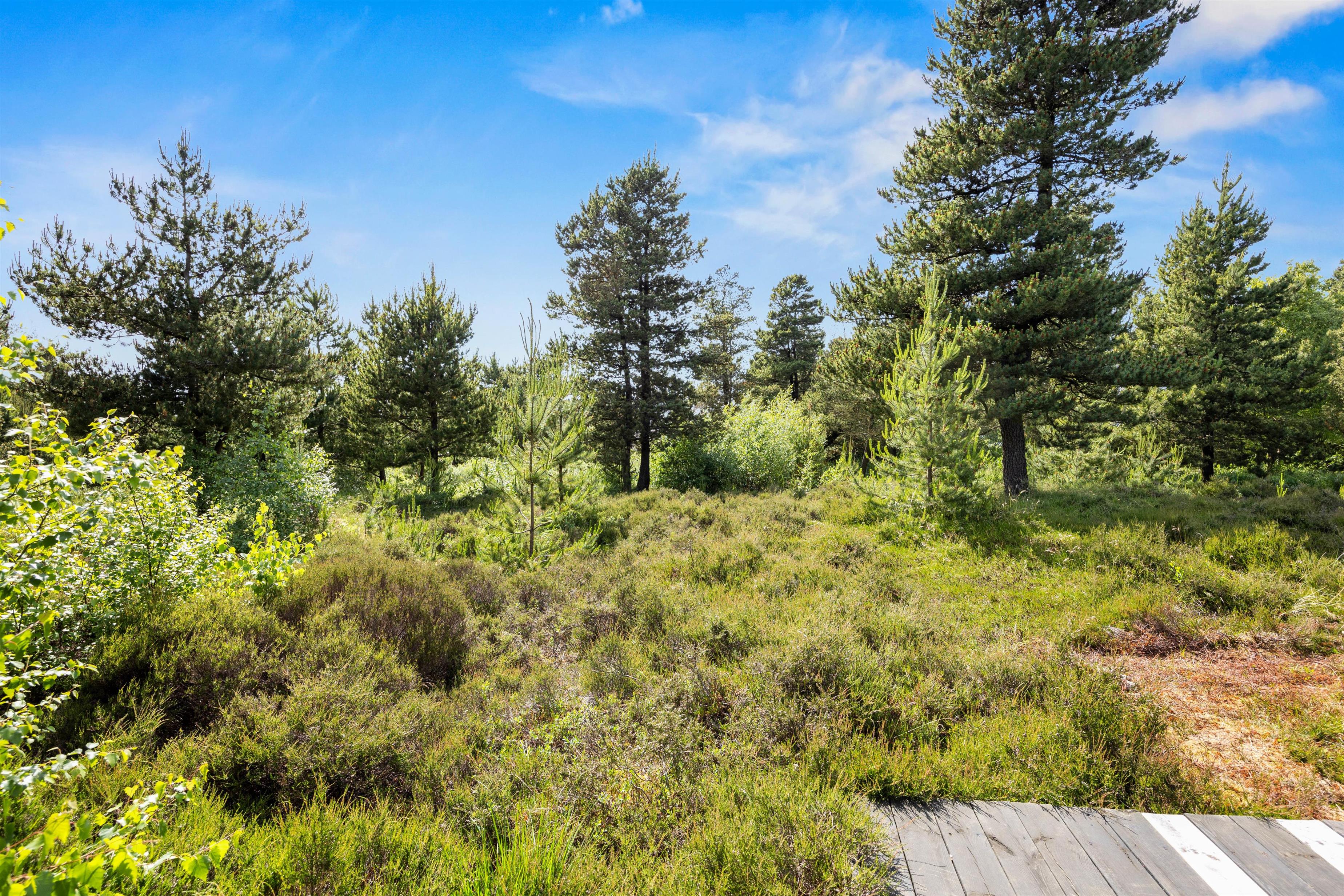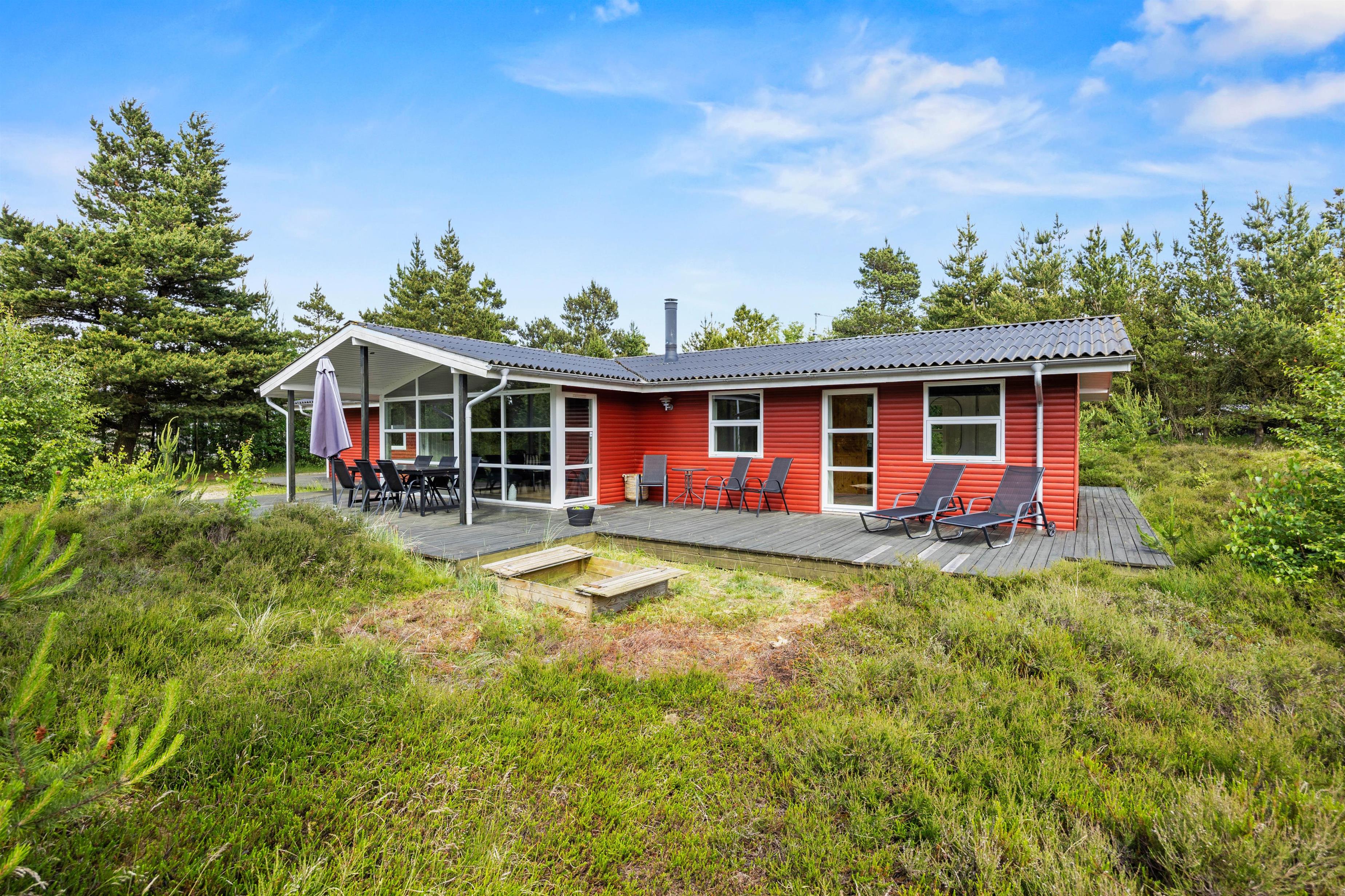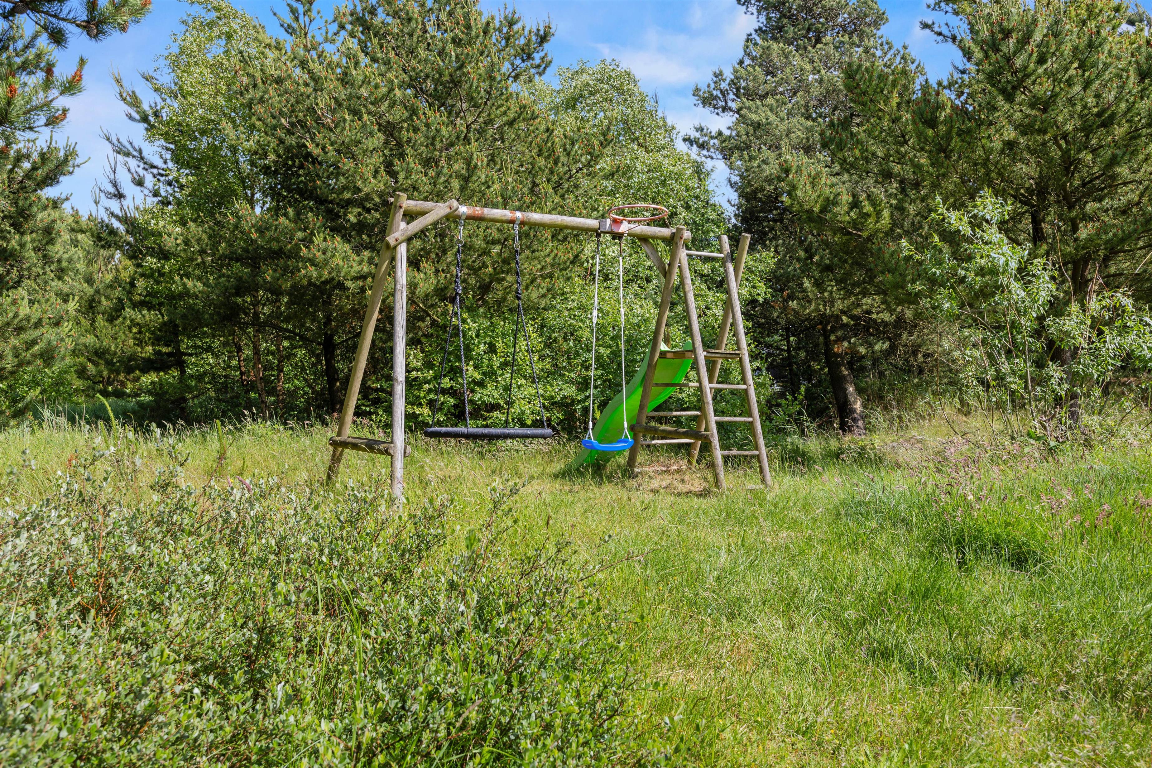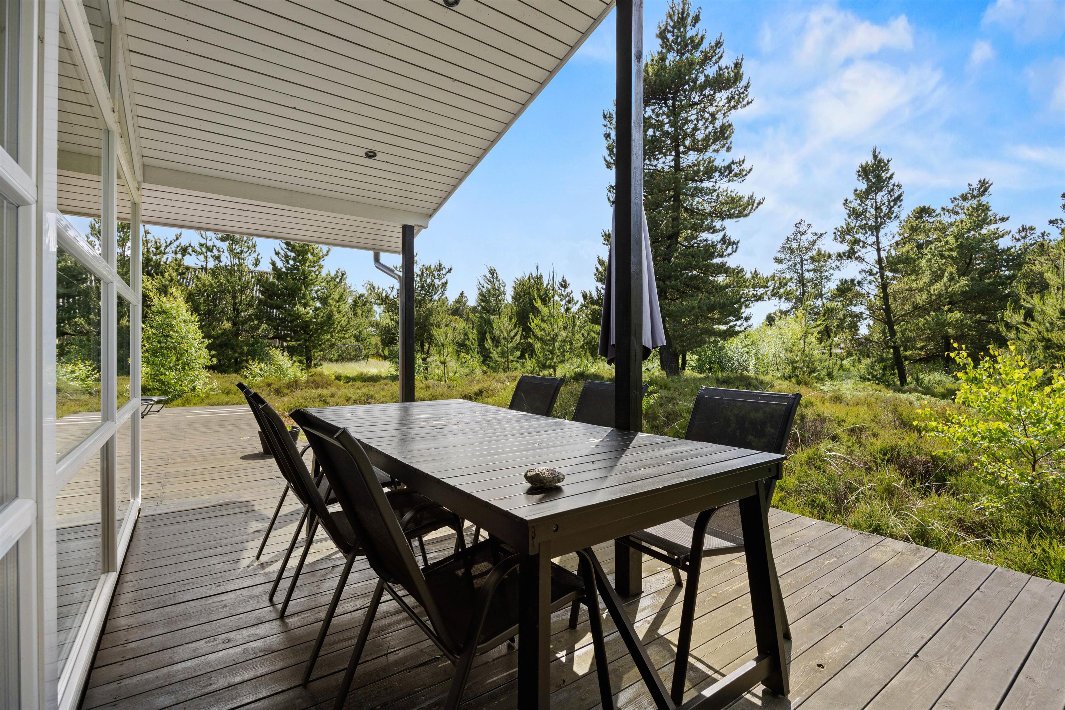 På terrassen kan I flytte rundt efter solens placering på himlen, og I vil altid kunne finde en god plet at trække jer tilbage på med en god bog og en kop te. Tag solbad i de komfortable liggestole eller træk ind på den overdækkede del af terrassen til en kølig drink eller snack. Børnene kan gå på opdagelse på naturgrunden, og skal de brænde energi af, er der også trampolin, gyngestativ med rutsjebane og sandkasse til dem. Den opvoksede beplantning omkring sommerhuset gør, at I kan føle jer private og tæt på naturen.