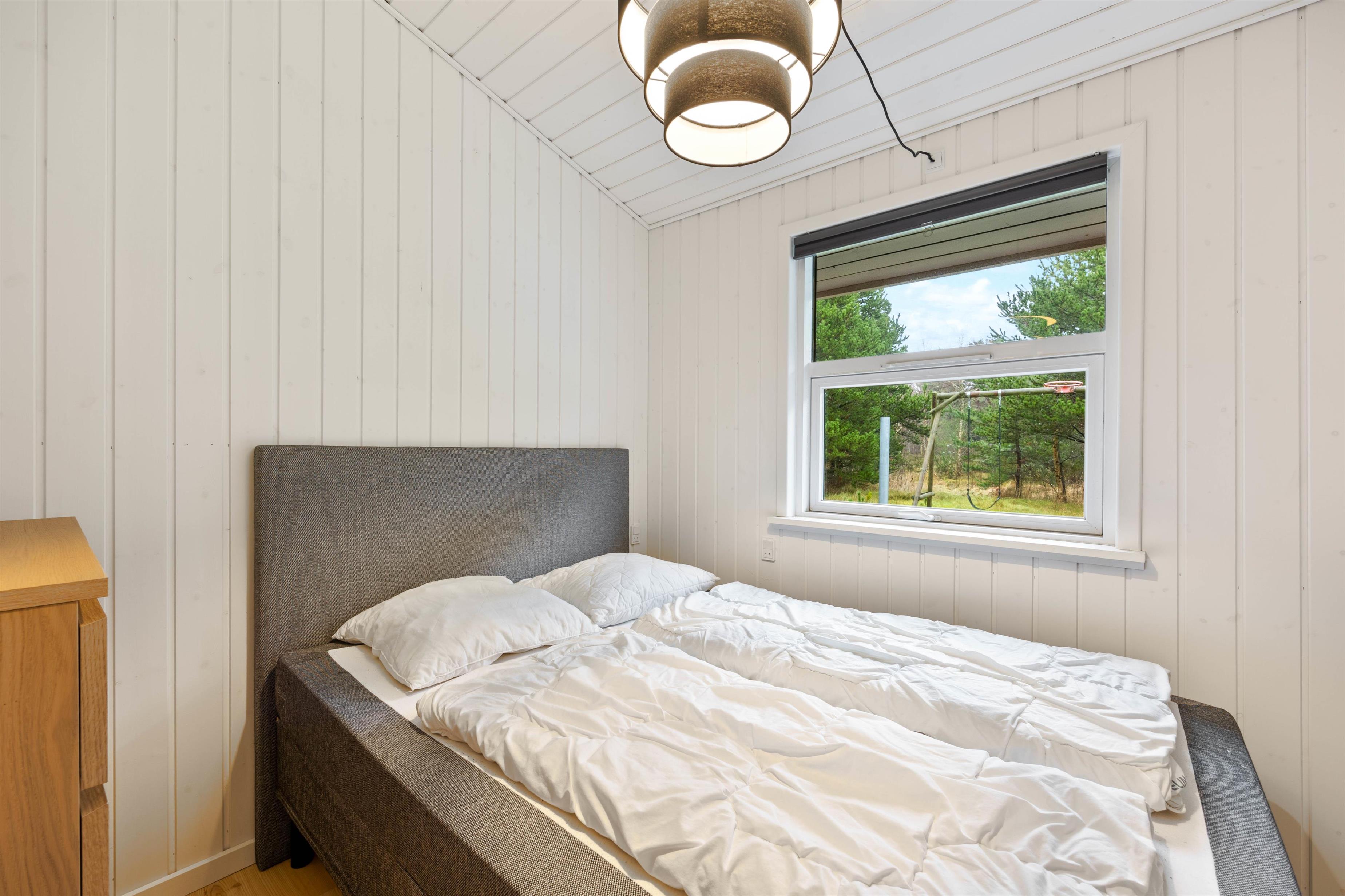 Der er 2 badeværelser med gulvvarme i sommerhuset – i forbindelse med det store badeværelse er også spabad og sauna, så her kan I arrangere jeres egen lille wellnessaften. Soveværelsernes placering tager hensyn til, at I kan få en uforstyrret nattesøvn i den friske vesterhavsluft. Der er 8 komfortable sengepladser fordelt på 5 soveværelser – 2 værelser med dobbeltsenge, 1 værelse med 2 enkeltsenge skubbet sammen til en dobbeltseng og 2 værelser med hver 1 enkeltseng, så I har mulighed for at arrangere jer, som det passer jer bedst. Der er en energibesparende varmepumpe til rådighed for jer på ferien.