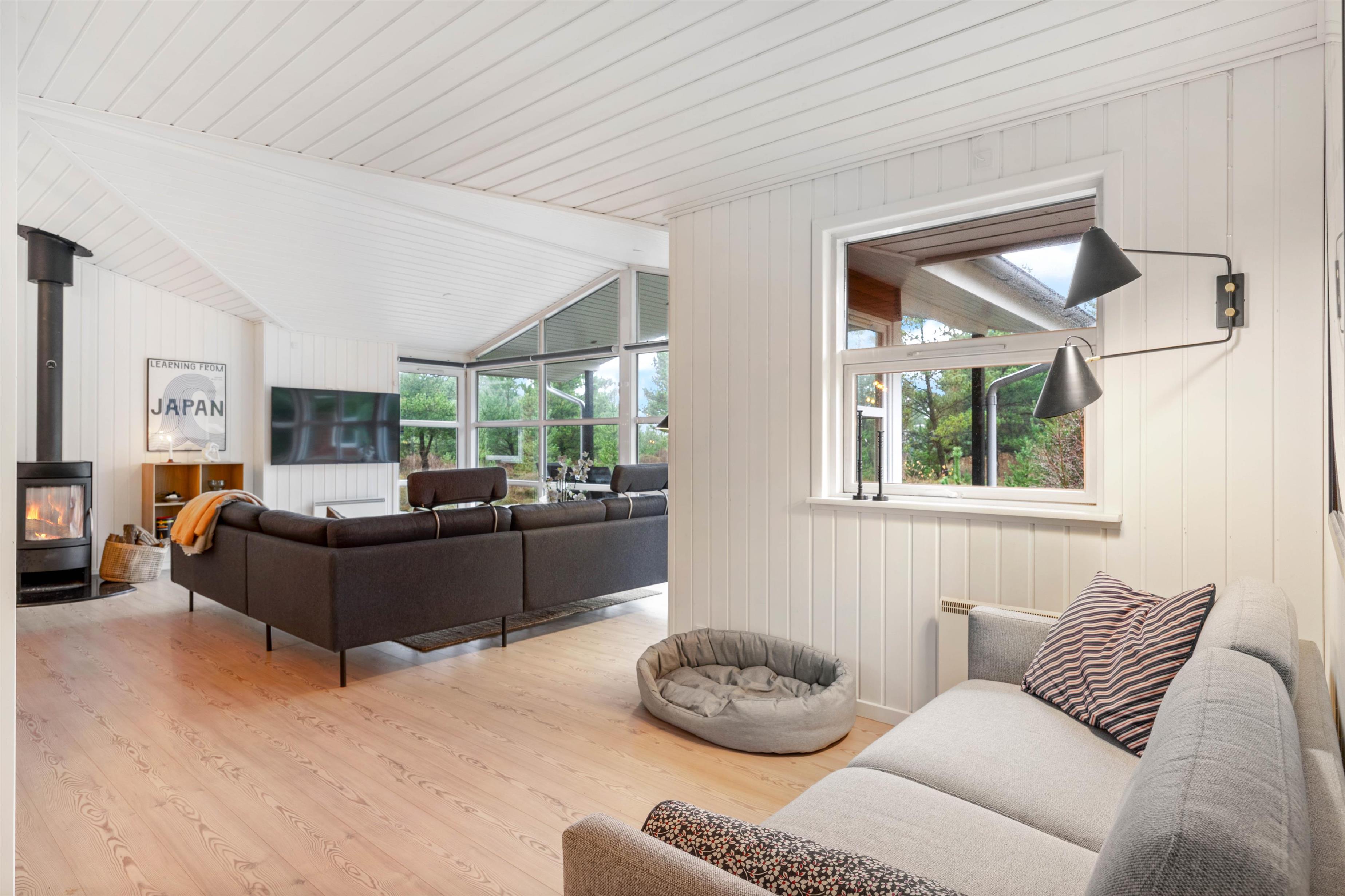 På Ejnar Mikkelsensvej 20 føler I jer hjemme straks, I træder ind ad døren. I bydes velkommen af en lys, luftig og dejlig feriestemning via de lyse trælaminatgulve, hvidmalede træbeklædte vægge og lofter op i kip. I stuen kan I slappe af i sofaen ved varmen fra ilden i brændeovnen, imens I nyder udsigten over naturgrunden og det fine lysindfald fra det brede vindues- og dørparti ud imod terrassen. Det åbne køkken i forbindelse med stuen indeholder alt, hvad I behøver for at forkæle hinanden med lækre hjemmelavede måltider.