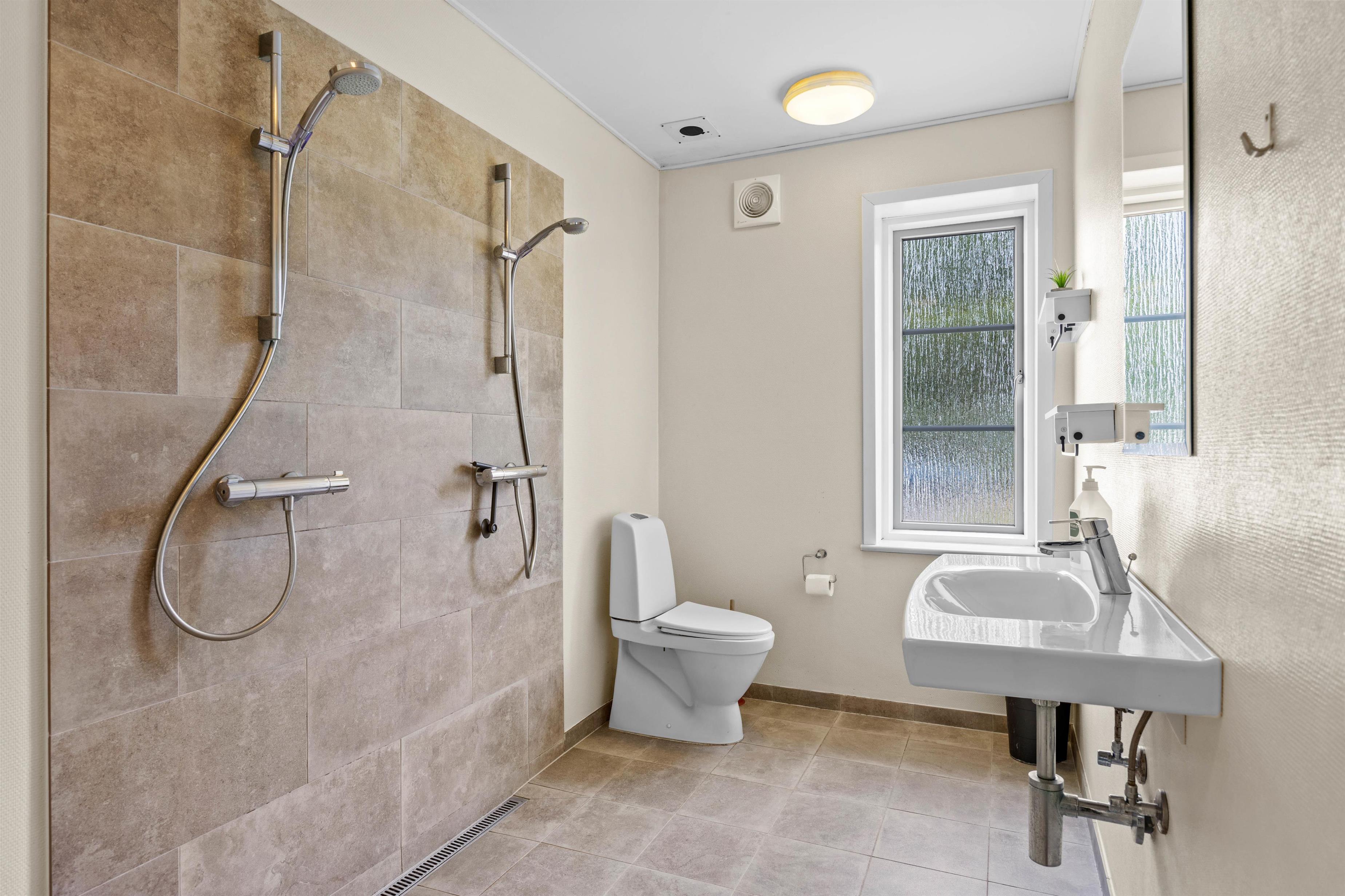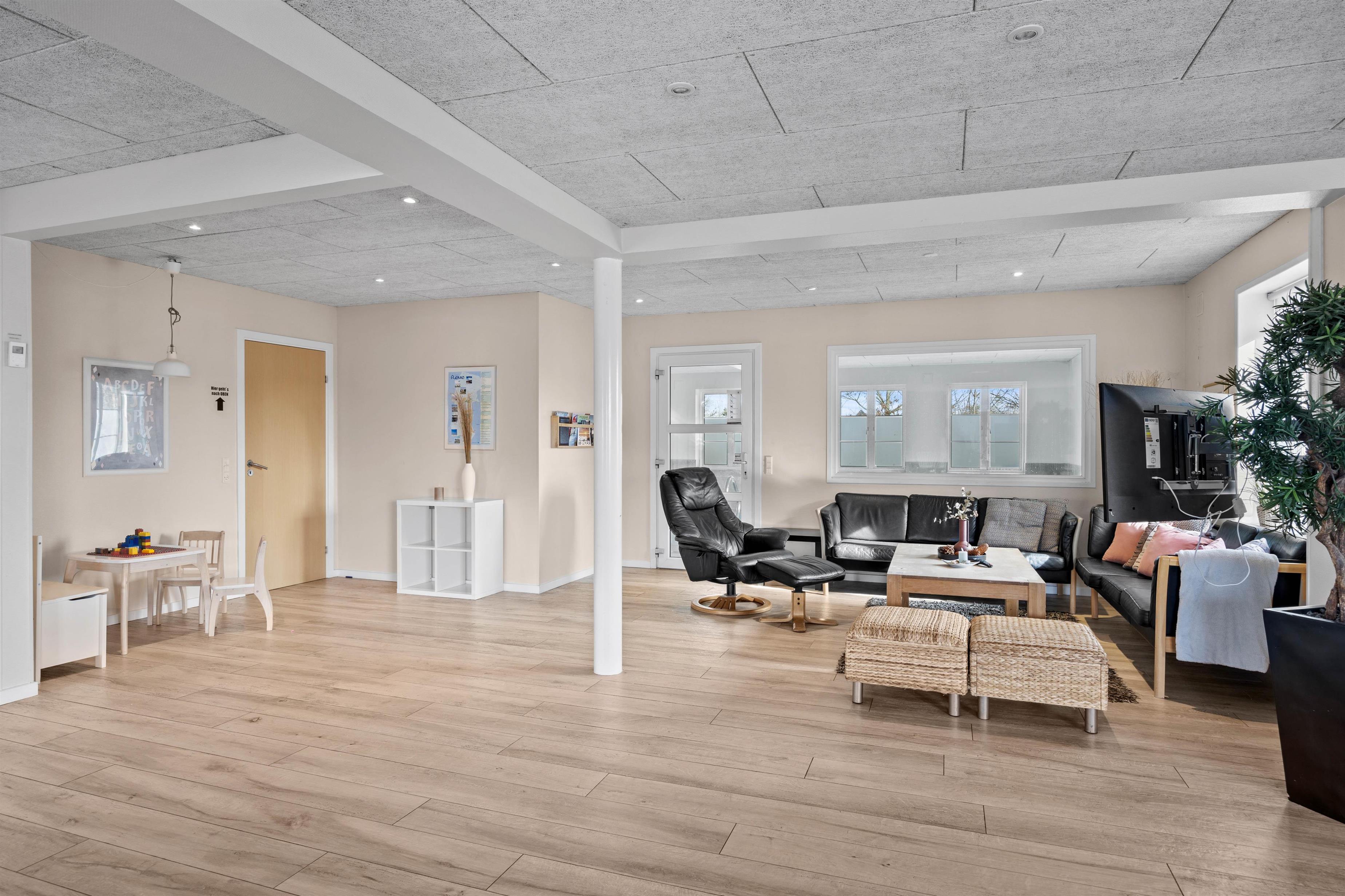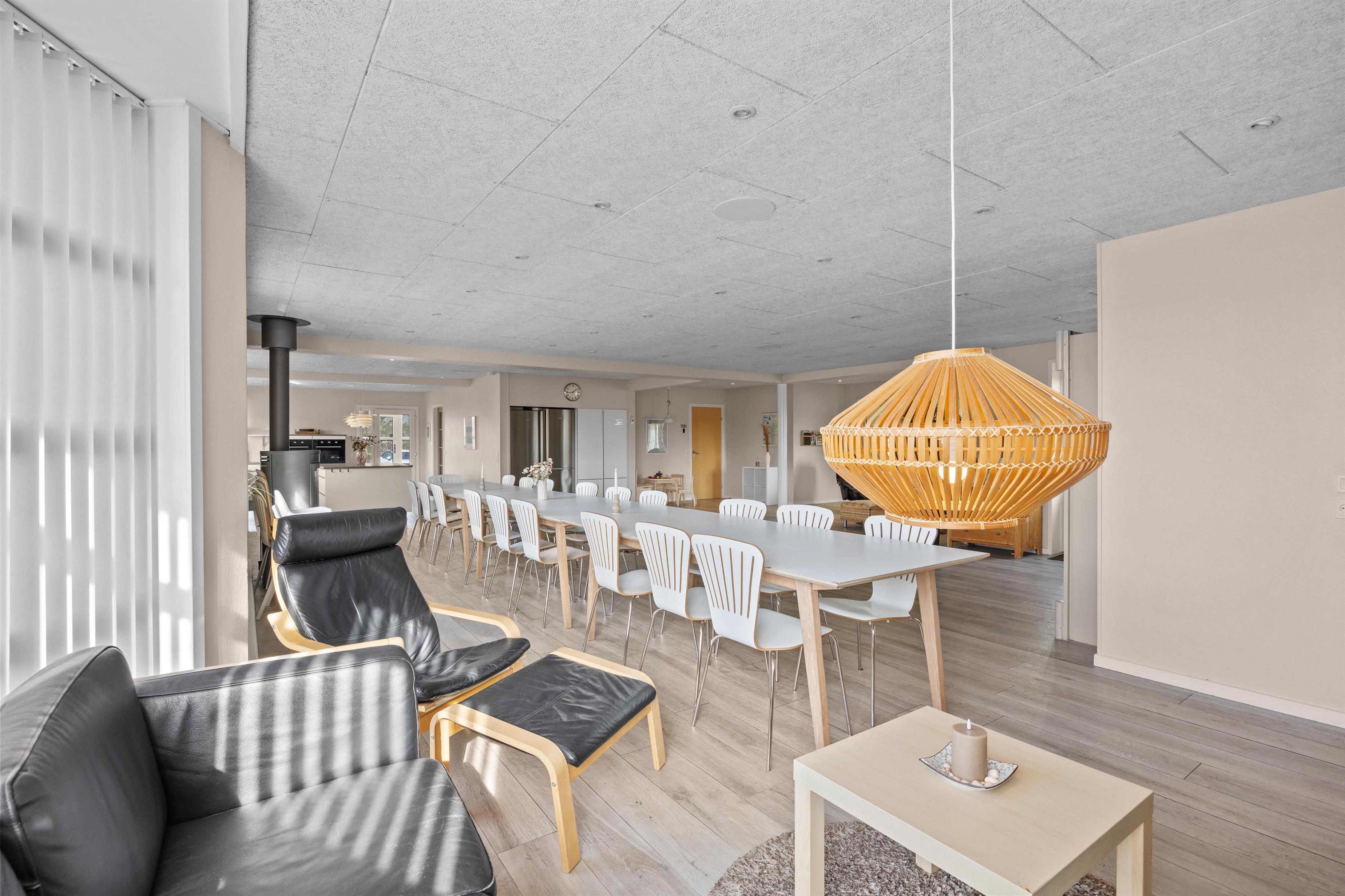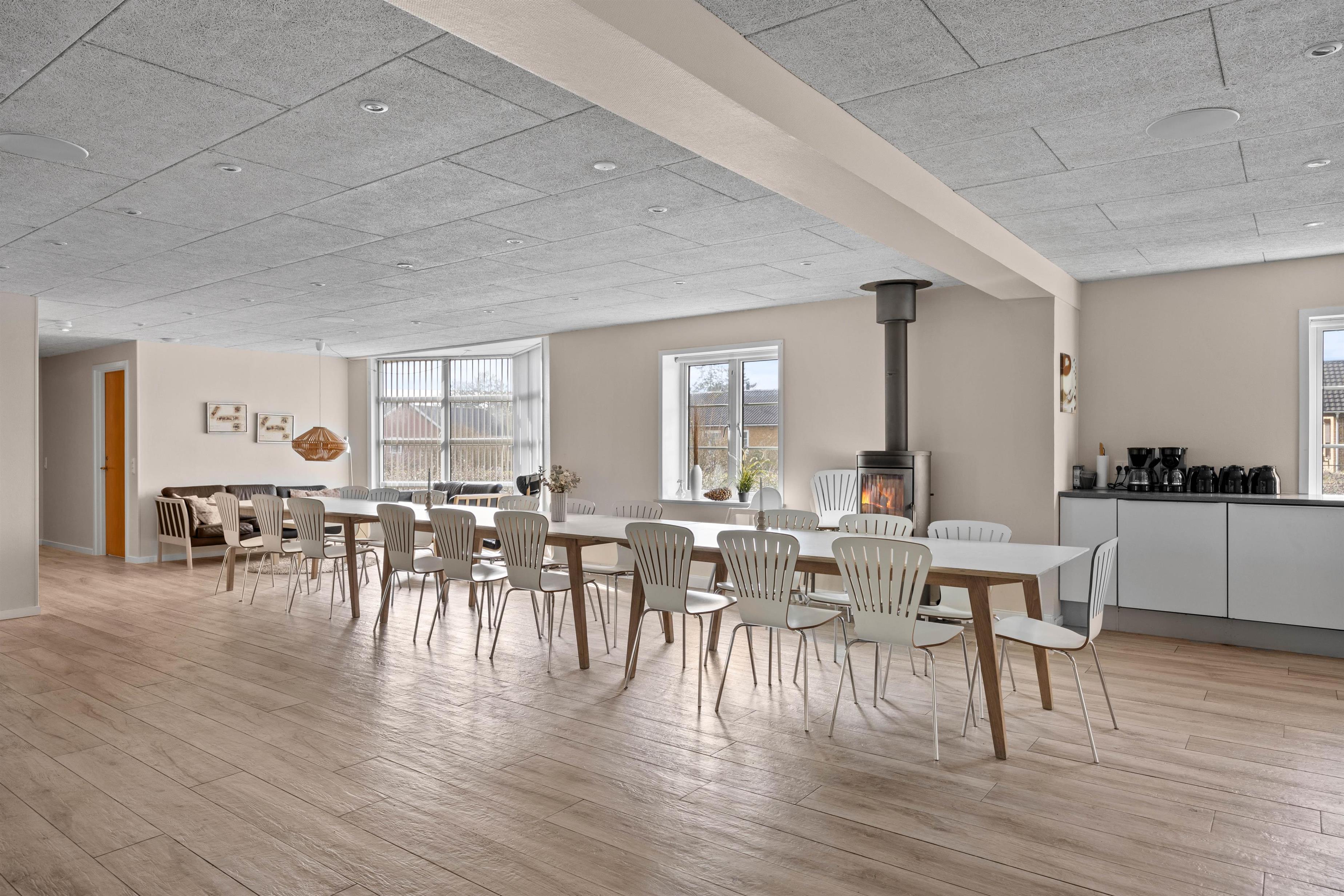 Den rummelige opholdsstue med flere siddegrupper indbyder til hygge, mens brændeovnen skaber en varm og behagelig atmosfære. Praktiske faciliteter som opvaskemaskine, vaskemaskine og tørretumbler samt 3 badeværelser og 2 gæstetoiletter sikrer, at alle får en behagelig oplevelse.