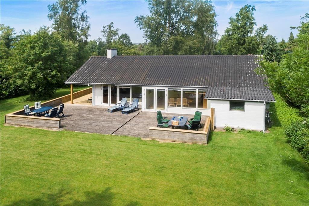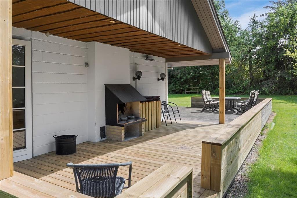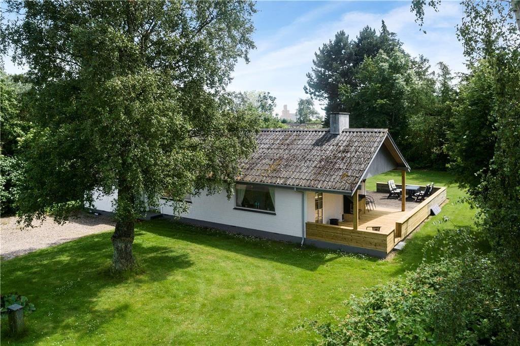 Beliggende på en dejlig grund, med flotte buske og træer hele vejen rundt, samt masser af græsplæne til boldspil og leg, og ikke mindst den store lækre træterrasse, som byder på havemøbler og en udendørs pejs.