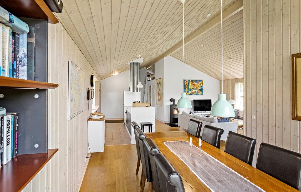 Hyggeligt feriehus i Kongsnæs med åben stue, brændeovn og tæt på stranden.
