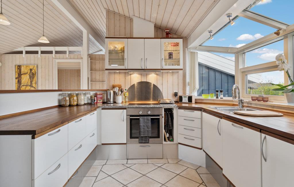 Dette smagfulde hus byder jer velkommen i anden række til vandet. Takket være gavlvinduer, de store panoramavinduer og flere mindre vinduer er rummene gennemstrømmet af naturligt lys, hvilket bidrager til den hyggelige og komfortable atmosfære. Den åbne planløsning giver jer mulighed for at deltage i andres samtaler, mens I hakker løs i køkkenet eller læner jer tilbage i sofaen. I bestemmer selv, hvilket terrasseområde I vil gå ud på med jeres morgenkaffe, for her kan I både vælge mellem den overdækkede terrasse, solterrassen eller træterrassen med udsigt over Grønsund. Når børnene har leget på græsplænen, kan I gå til vandet med strandtaske og fiskestang. Hop i vandet fra badebroen eller kast snøren ud om aftenen.