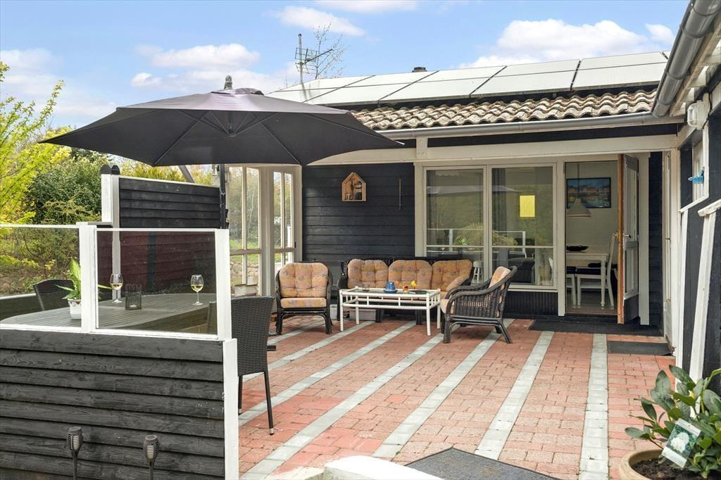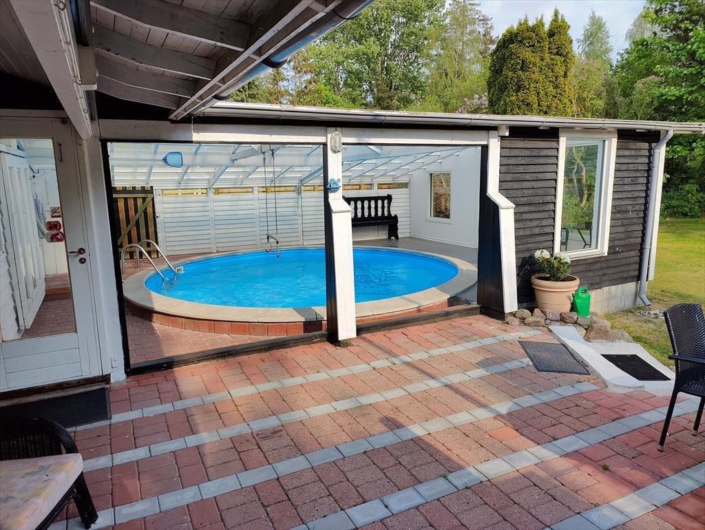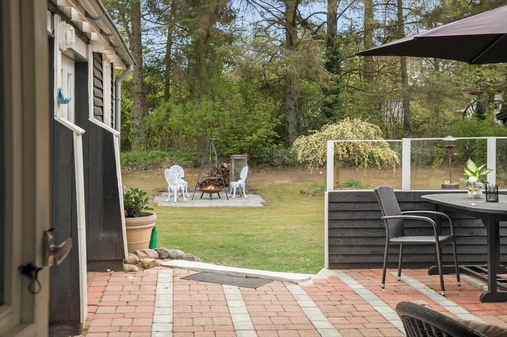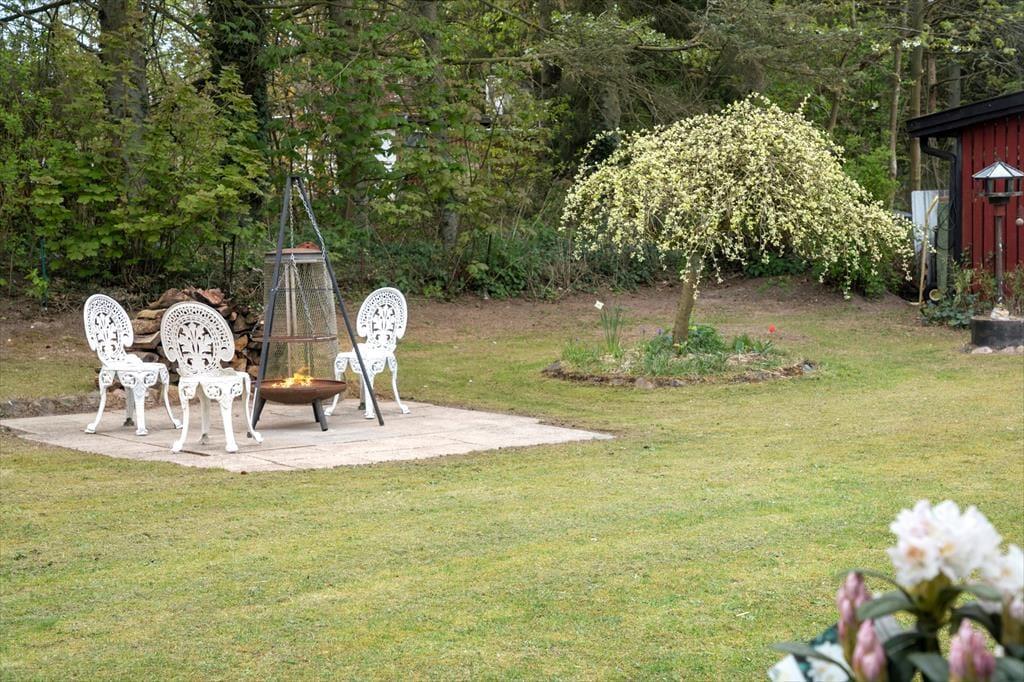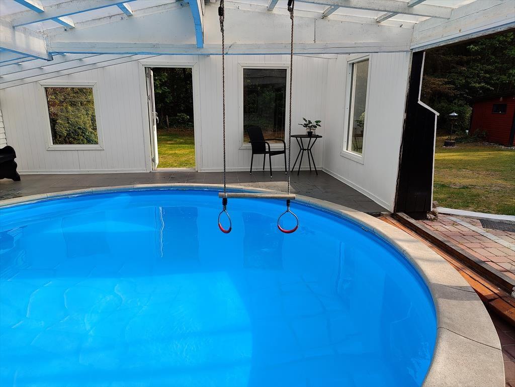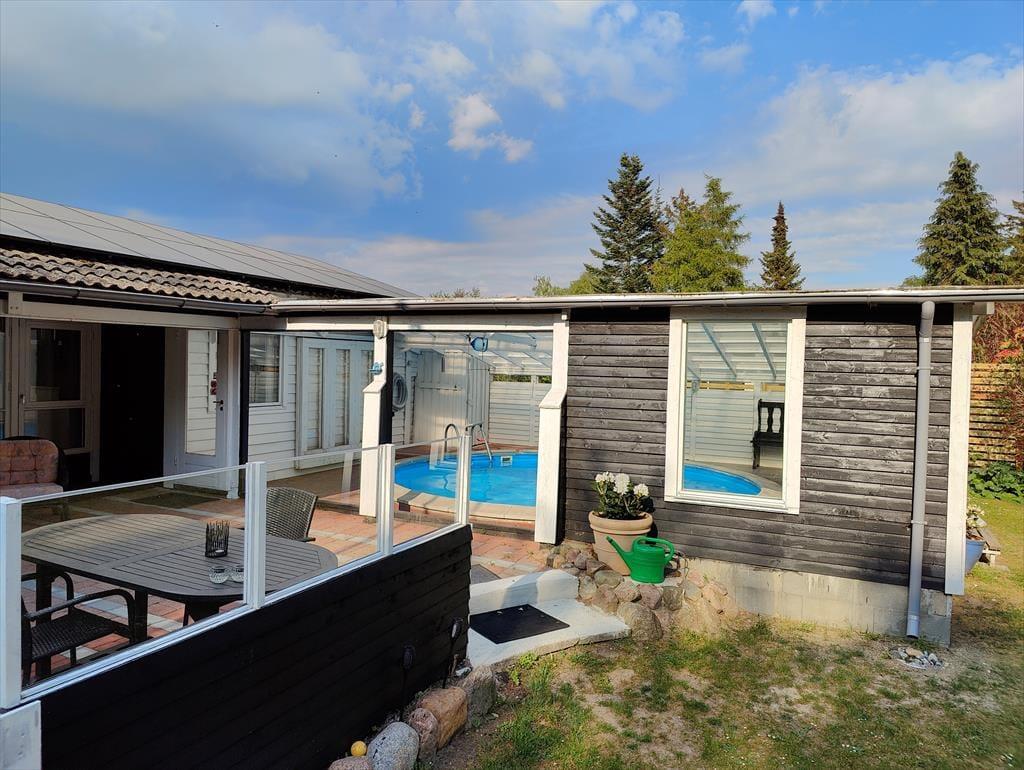 Sommerhuset ligger på en lukket vej og er omkranset af en dejlig, delvis lukket have, omkranset af høje træer. I haven er der bl.a. bålplads, hvor der kan ristes snobrød og hygges med børnene- hvis de ellers kan lokkes op af poolen. Her er 2 terrasser ved huset og fra den ene kan I nyde solen udenfor imens I har direkte udsyn til poolen. Poolen er opvarmet fra påske og til efterårsferie uge 42. Her finder I både plads til hygge, afslapning og natureventyr, og hvis I er heldige, vil I opleve rådyr komme forbi i haven.