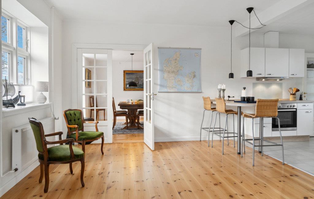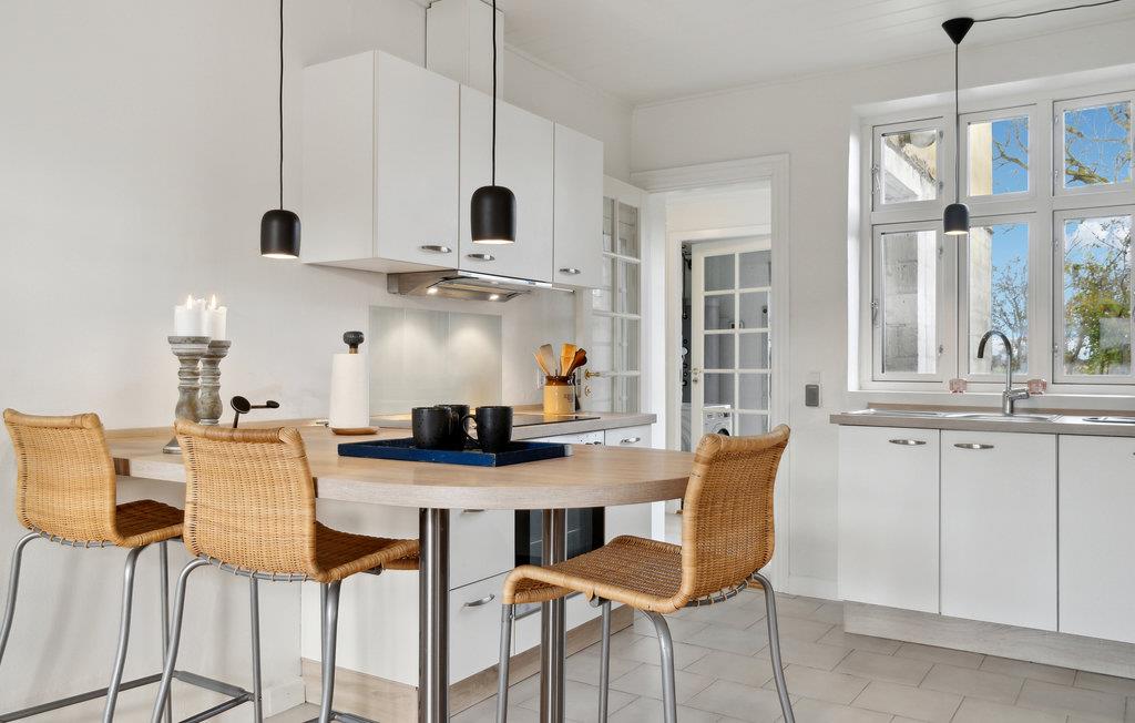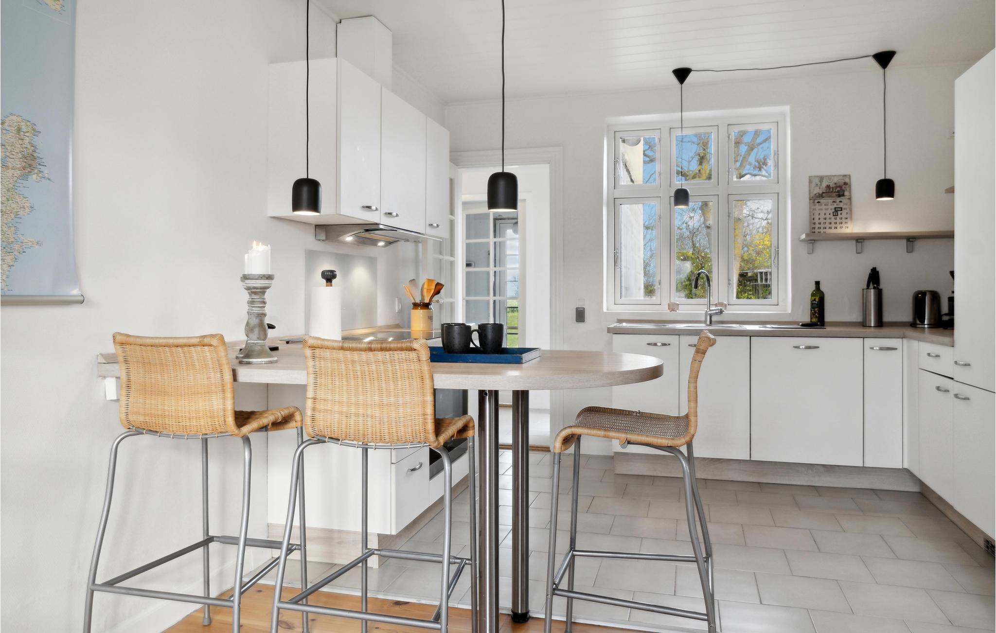 Dette solide, rummelige hus ligger placeret ud til marker og enge. Her kommer skuldrene ned, og I kan hurtigt finde jer til rette i de lyse rum, hvor der er et vellykket samspil mellem moderne og antikt. Her kan I se frem til nogle programfri dage, som I kan fylde med gode oplevelser, rolige måltider og lange snakke i sofaen efter dagens aktiviteter. Nyd solen på terrassen og glæd hele familien med lækre grillretter om aftenen. Begynd dagene med en tur ned til stenstranden, hvor I kan slikke sol og bade.