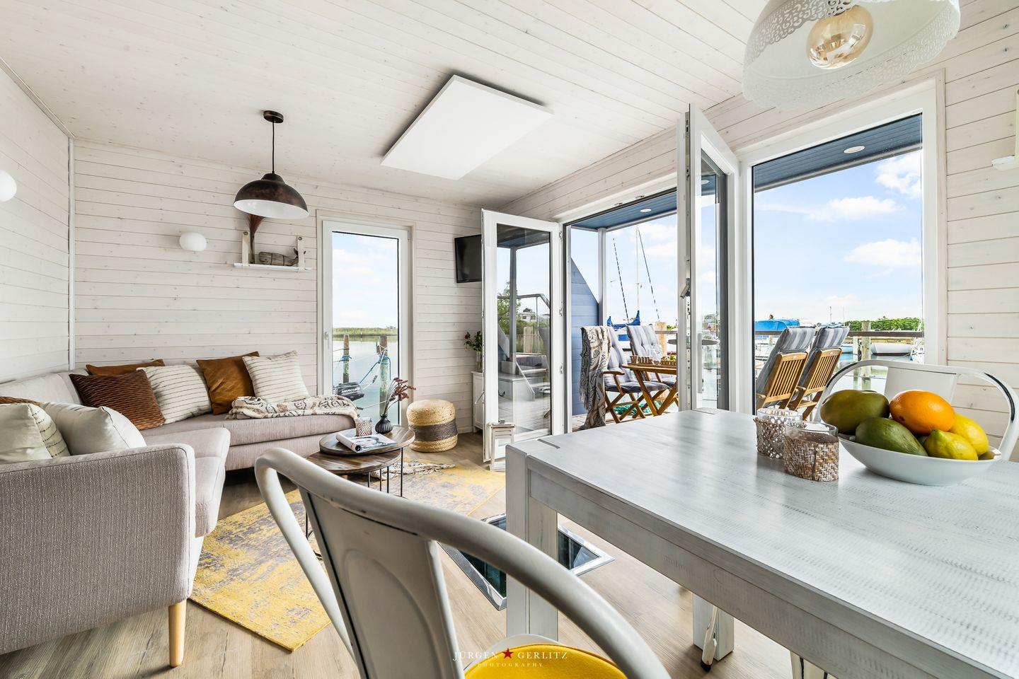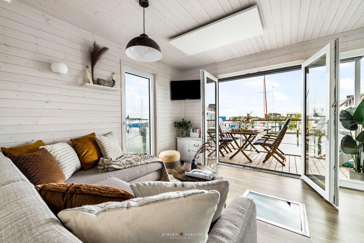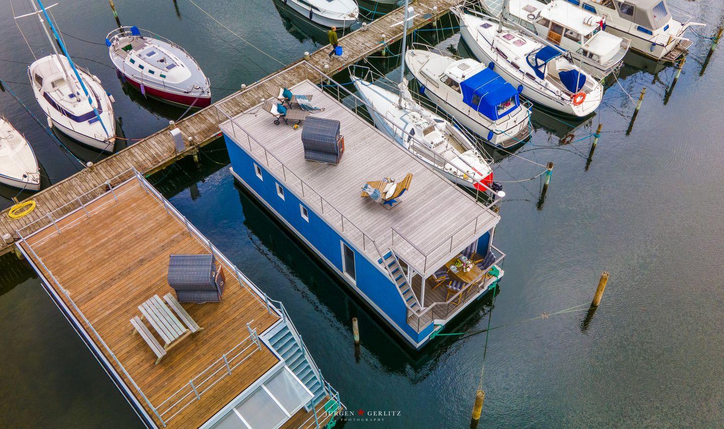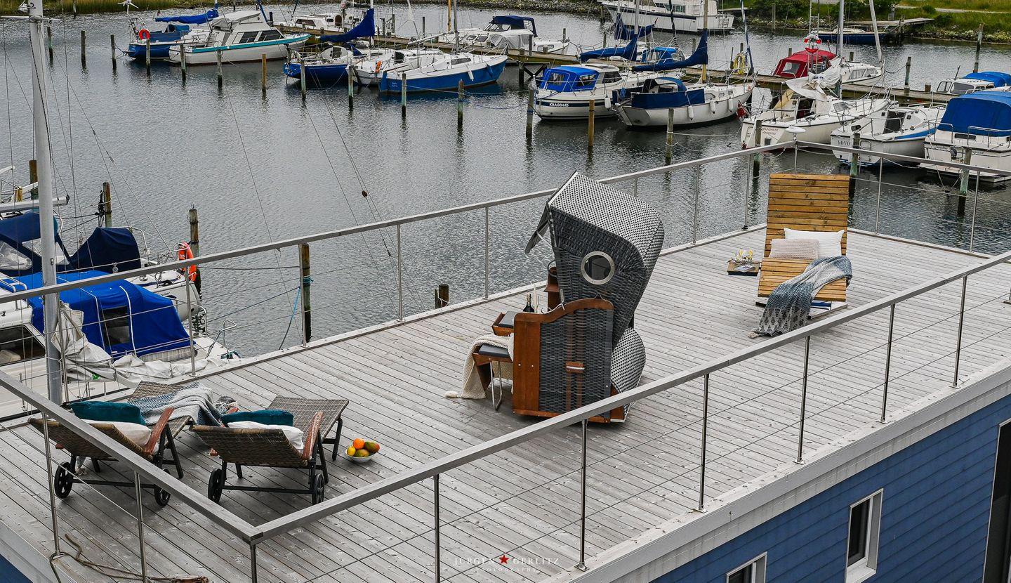 Das Hausboot verfügt über 2 Schlafräume, 1 Wohn-/ Esszimmer, eine Küchenzeile, Dusch-Bad, separates WC, WLAN. Die Wohnfläche beträgt 40m² und die Ausstattung lässt keine Wünsche offen. Genießen Sie die Annehmlichkeiten einer komplett ausgestatteten Ferienwohnung verbunden mit der Freiheit auf dem Wasser. Das ist Erholung pur, eben "Urlaub in der ersten Reihe". Das großzügige Sonnendeck erstreckt sich über die gesamte obere Etage und bietet einen Rundumblick über die Marina sowie die Inseln der dänischen Südsee. Ein herrlicher XL Strandkorb und Liegen laden zum Entspannen, zu Sundowner & Co. ein.