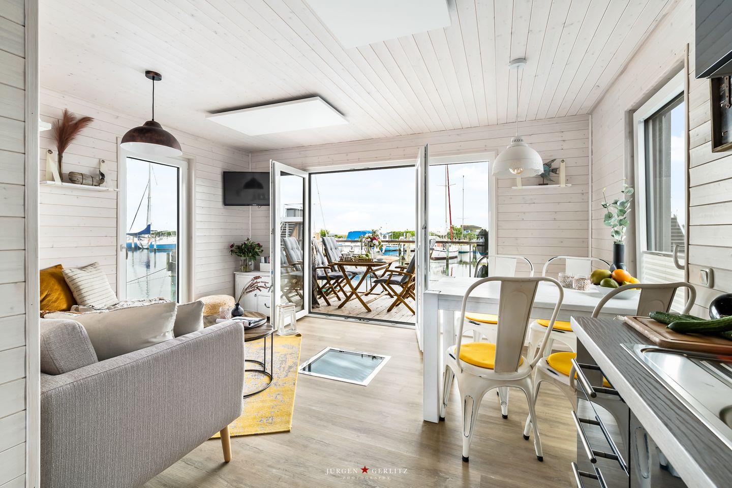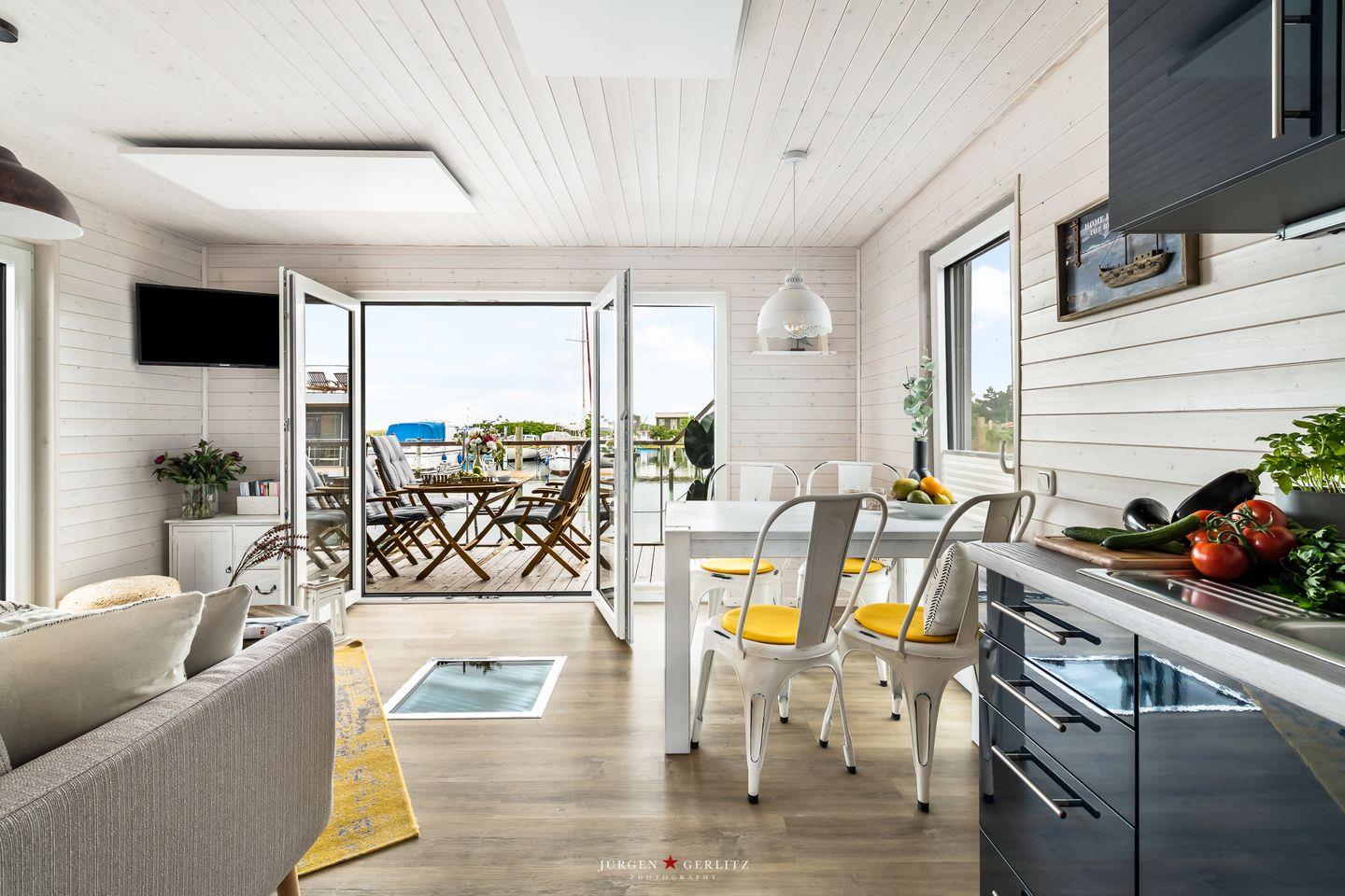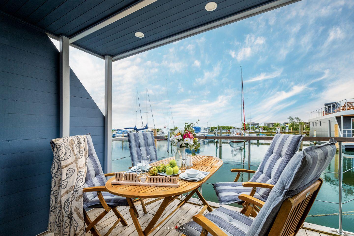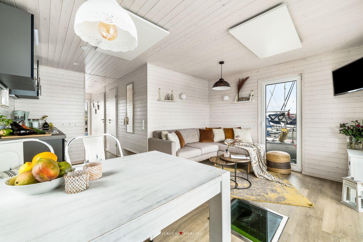Das Hausboot verfügt über 2 Schlafräume, 1 Wohn-/ Esszimmer, eine Küchenzeile, Dusch-Bad, separates WC, WLAN. Die Wohnfläche beträgt 40m² und die Ausstattung lässt keine Wünsche offen. Genießen Sie die Annehmlichkeiten einer komplett ausgestatteten Ferienwohnung verbunden mit der Freiheit auf dem Wasser. Das ist Erholung pur, eben "Urlaub in der ersten Reihe". Das großzügige Sonnendeck erstreckt sich über die gesamte obere Etage und bietet einen Rundumblick über die Marina sowie die Inseln der dänischen Südsee. Ein herrlicher XL Strandkorb und Liegen laden zum Entspannen, zu Sundowner & Co. ein.