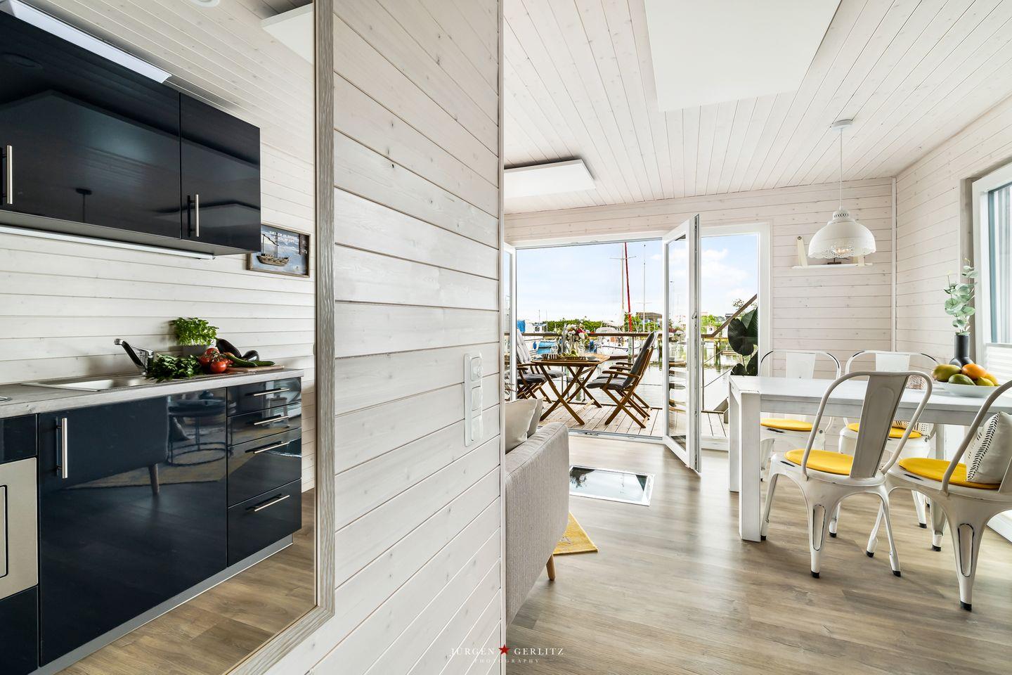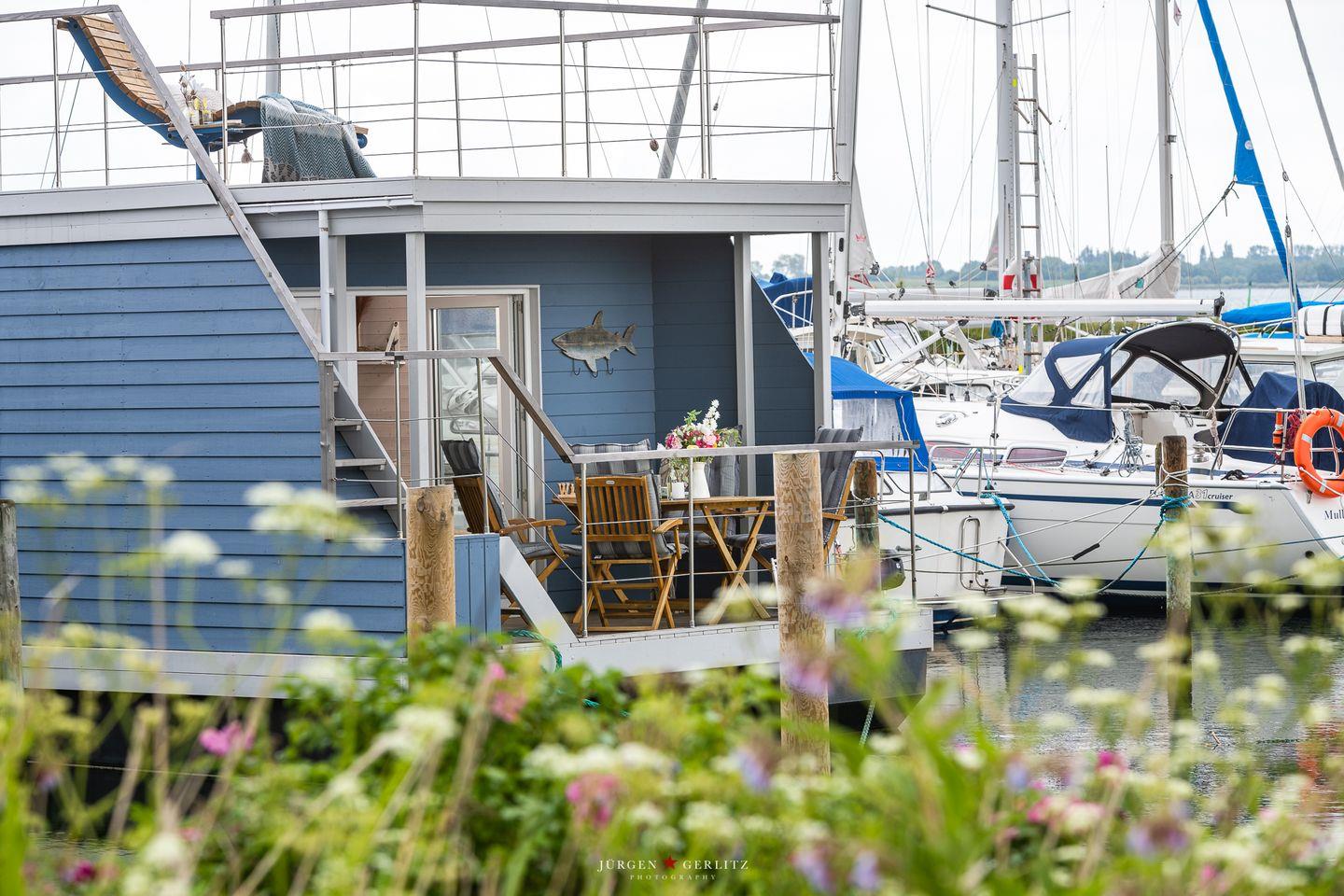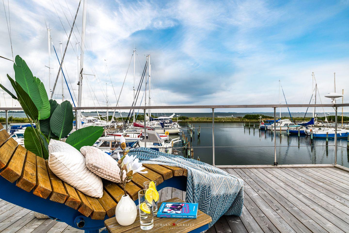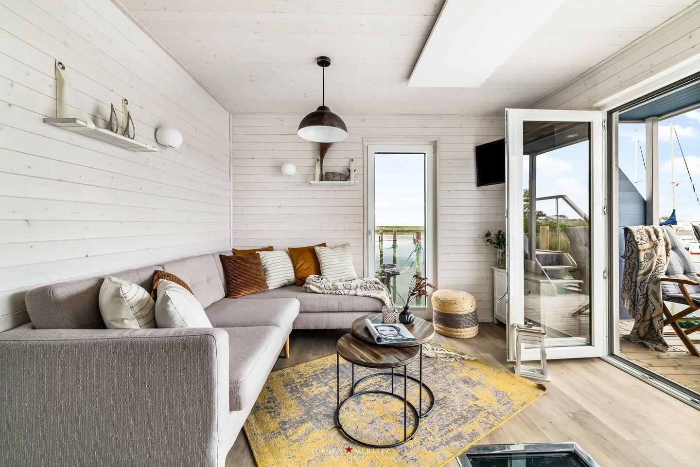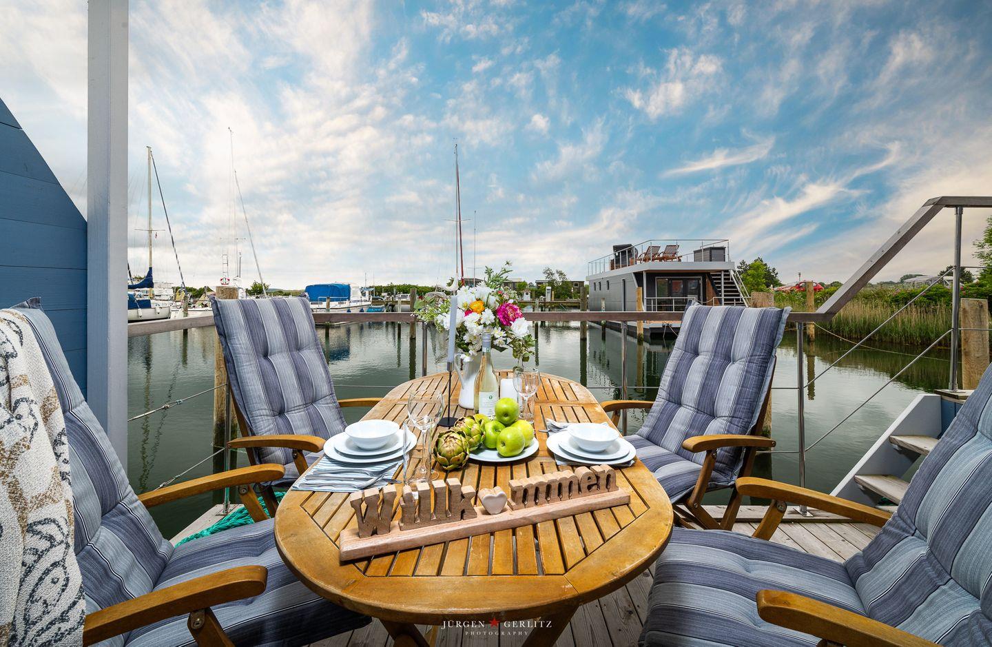 Das Hausboot verfügt über 2 Schlafräume, 1 Wohn-/ Esszimmer, eine Küchenzeile, Dusch-Bad, separates WC, WLAN. Die Wohnfläche beträgt 40m² und die Ausstattung lässt keine Wünsche offen. Genießen Sie die Annehmlichkeiten einer komplett ausgestatteten Ferienwohnung verbunden mit der Freiheit auf dem Wasser. Das ist Erholung pur, eben "Urlaub in der ersten Reihe". Das großzügige Sonnendeck erstreckt sich über die gesamte obere Etage und bietet einen Rundumblick über die Marina sowie die Inseln der dänischen Südsee. Ein herrlicher XL Strandkorb und Liegen laden zum Entspannen, zu Sundowner & Co. ein.