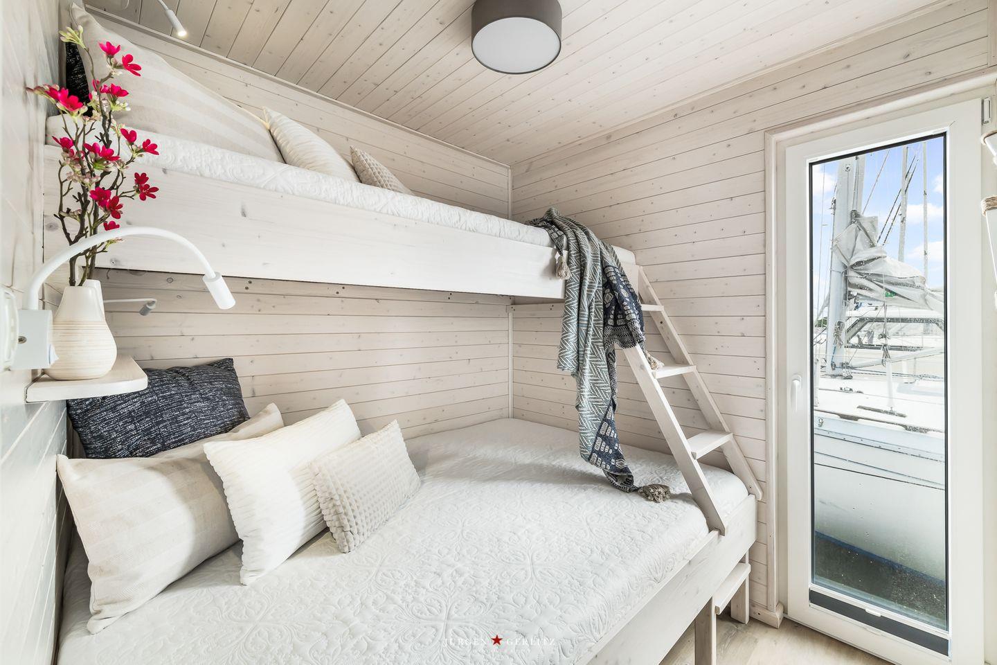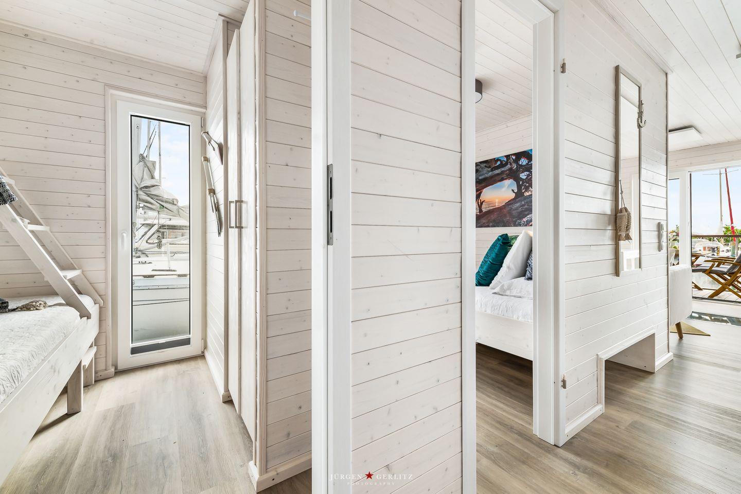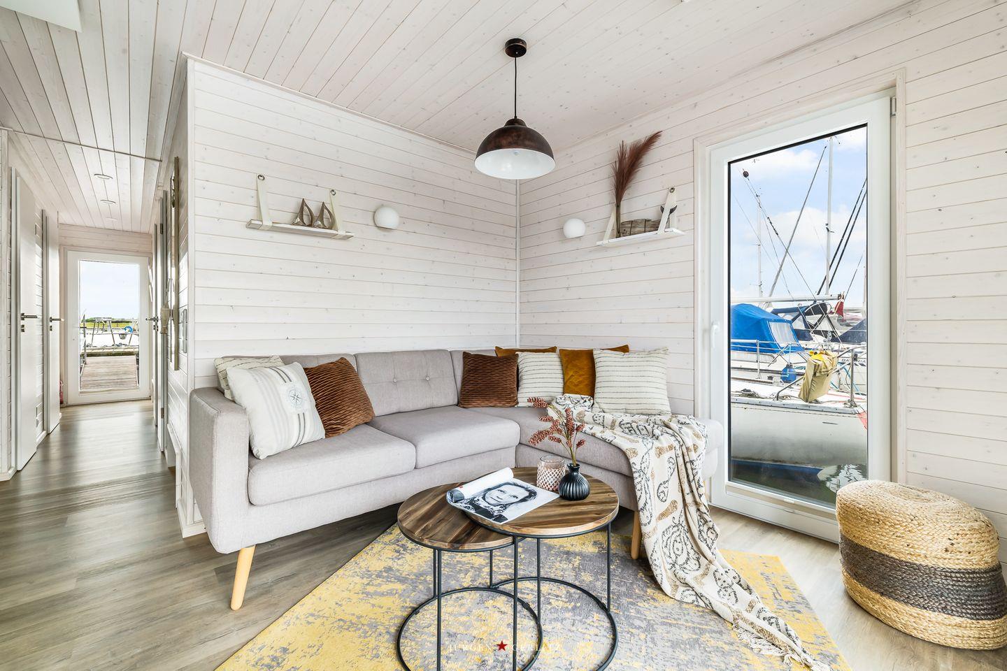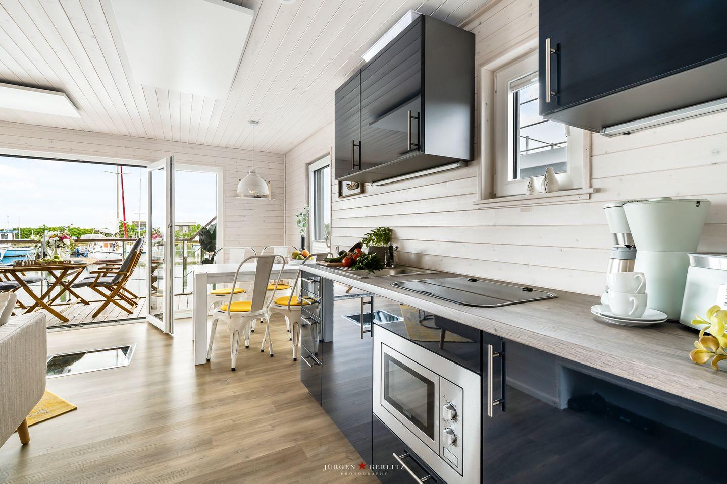 Das Hausboot verfügt über 2 Schlafräume, 1 Wohn-/ Esszimmer, eine Küchenzeile, Dusch-Bad, separates WC, WLAN. Die Wohnfläche beträgt 40m² und die Ausstattung lässt keine Wünsche offen. Genießen Sie die Annehmlichkeiten einer komplett ausgestatteten Ferienwohnung verbunden mit der Freiheit auf dem Wasser. Das ist Erholung pur, eben "Urlaub in der ersten Reihe". Das großzügige Sonnendeck erstreckt sich über die gesamte obere Etage und bietet einen Rundumblick über die Marina sowie die Inseln der dänischen Südsee. Ein herrlicher XL Strandkorb und Liegen laden zum Entspannen, zu Sundowner & Co. ein.