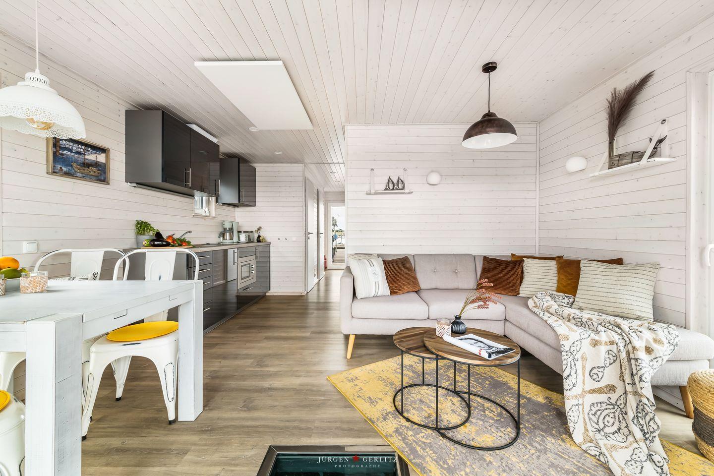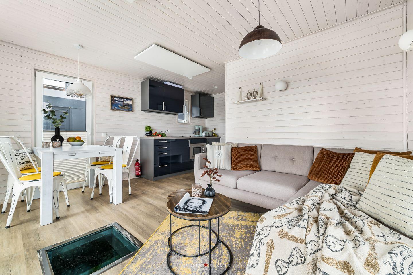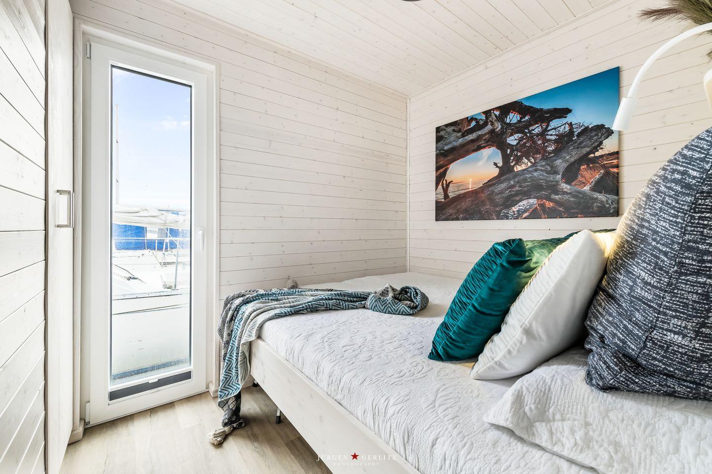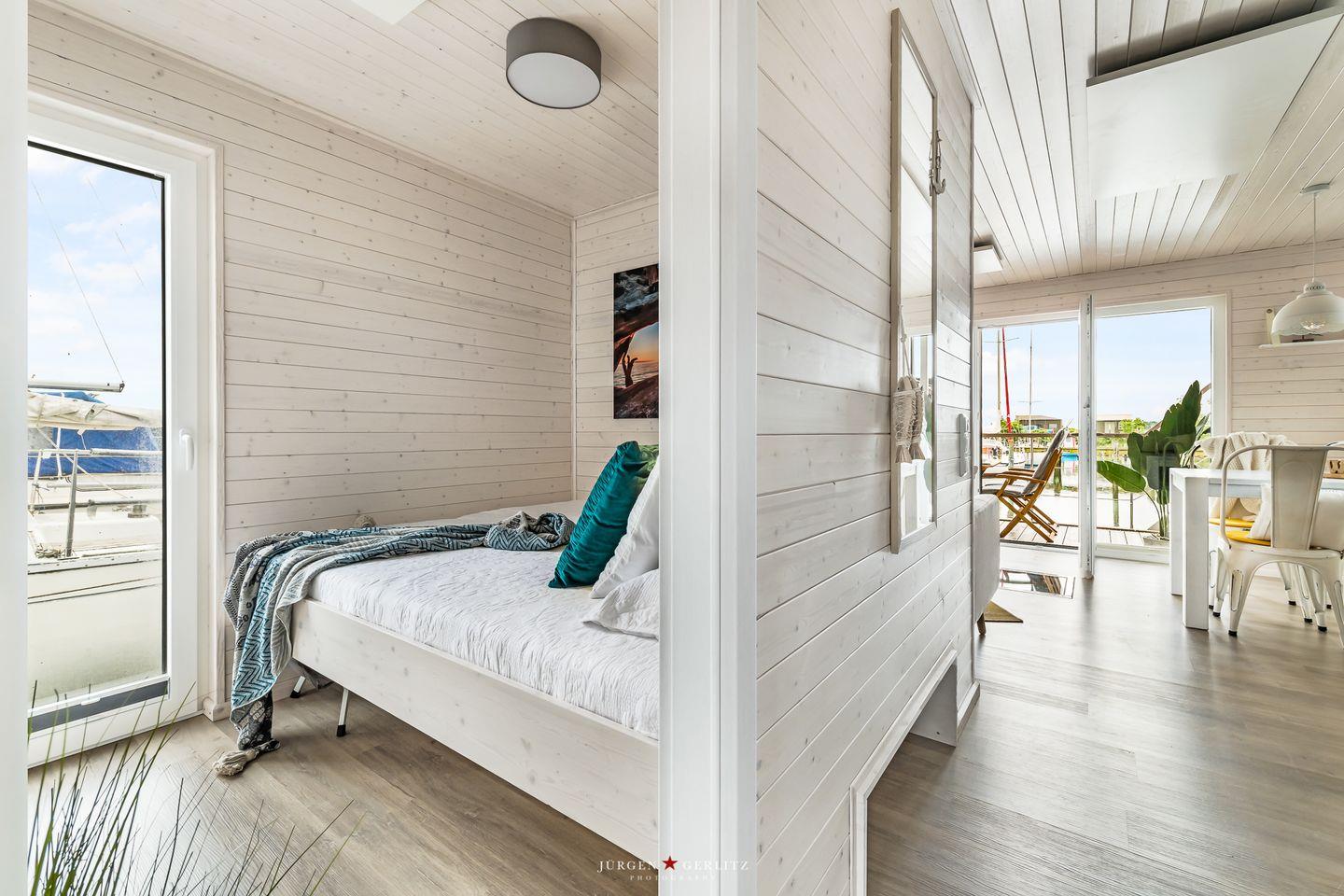 Das Hausboot verfügt über 2 Schlafräume, 1 Wohn-/ Esszimmer, eine Küchenzeile, Dusch-Bad, separates WC, WLAN. Die Wohnfläche beträgt 40m² und die Ausstattung lässt keine Wünsche offen. Genießen Sie die Annehmlichkeiten einer komplett ausgestatteten Ferienwohnung verbunden mit der Freiheit auf dem Wasser. Das ist Erholung pur, eben "Urlaub in der ersten Reihe". Das großzügige Sonnendeck erstreckt sich über die gesamte obere Etage und bietet einen Rundumblick über die Marina sowie die Inseln der dänischen Südsee. Ein herrlicher XL Strandkorb und Liegen laden zum Entspannen, zu Sundowner & Co. ein.