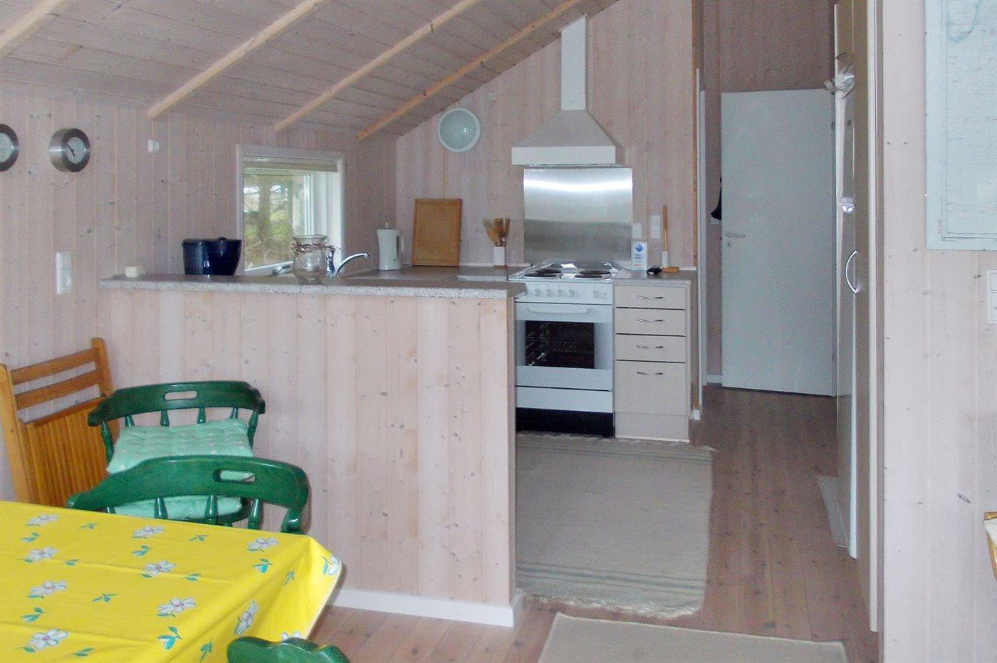 Køkkenet er udstyret med 1 køleskab. Der er 4 elkogeplader, bageovn, mikrobølgeovn.