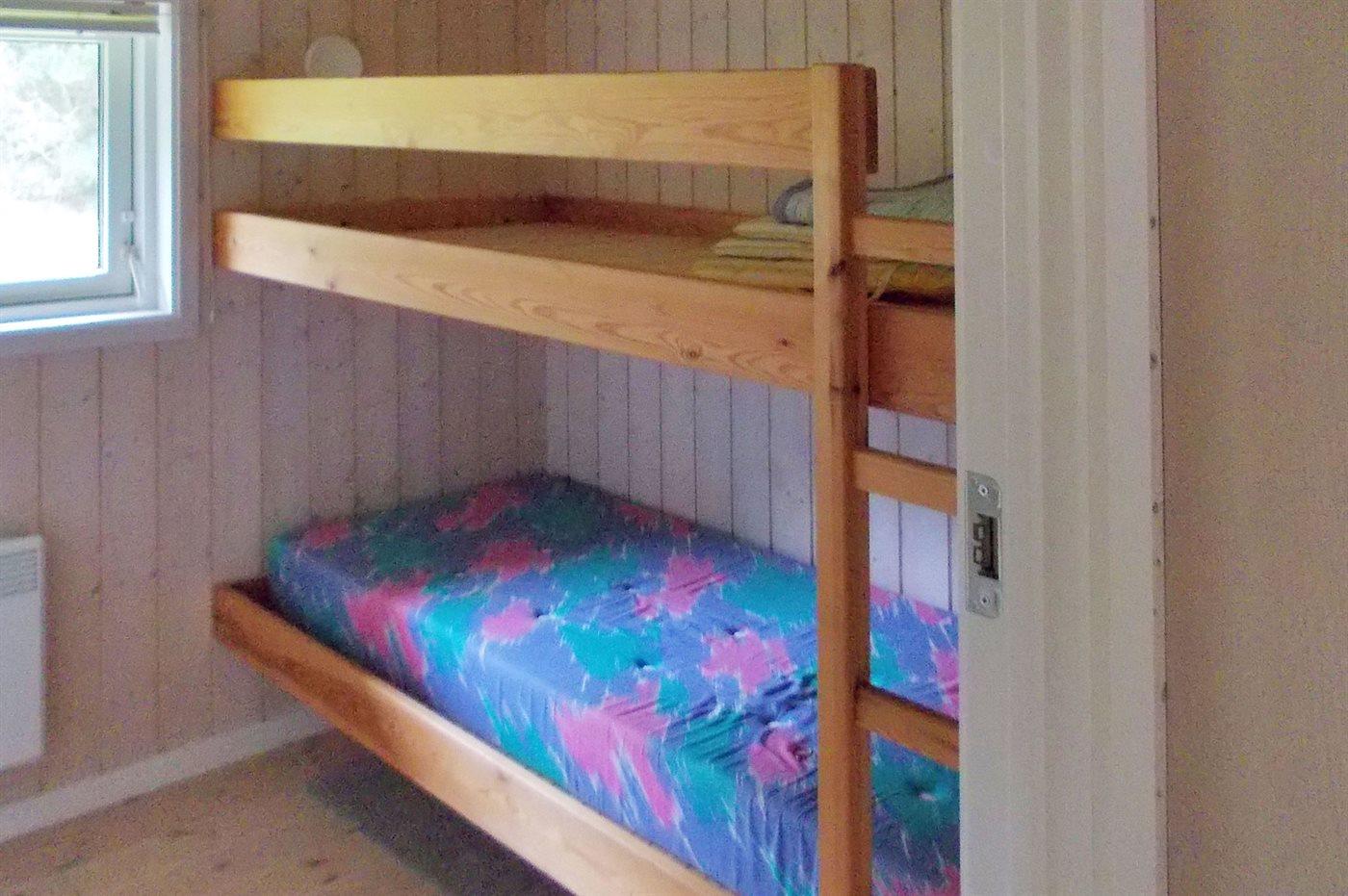 Der er i alt 2 soveværelser. Sovepladserne fordeler sig på: 2 sovepladser i dobbeltseng. 2 sovepladser i køjeseng. Derudover er der 1 stk. barneseng.