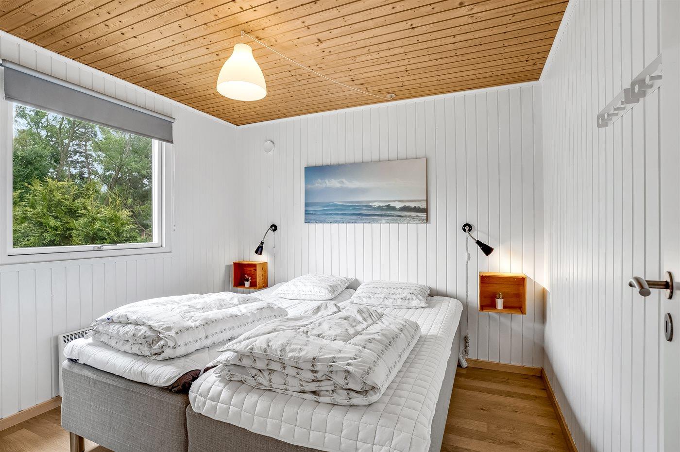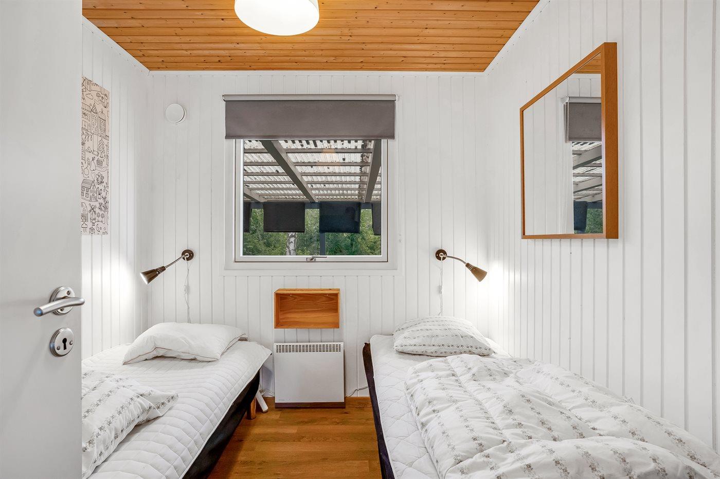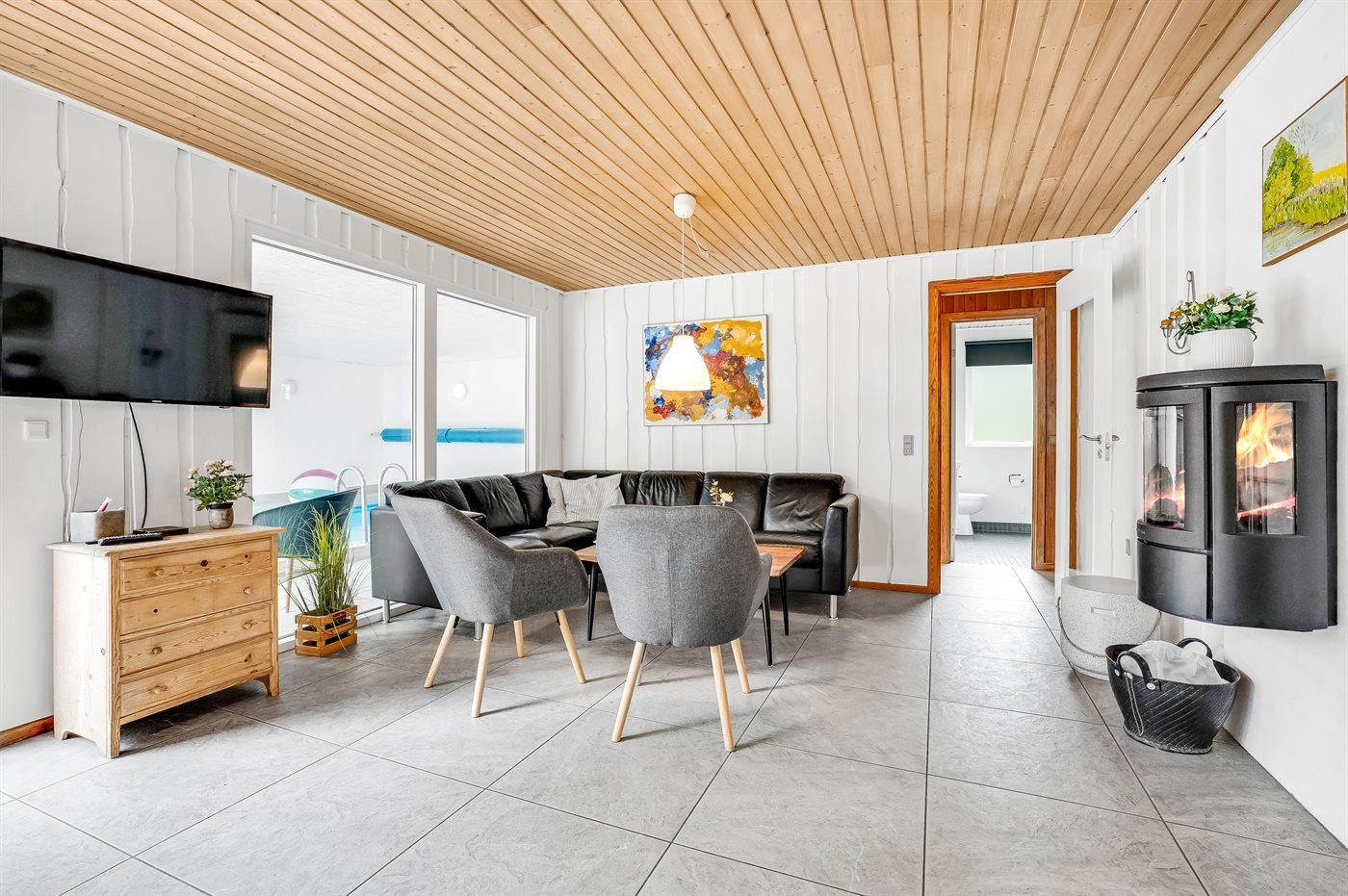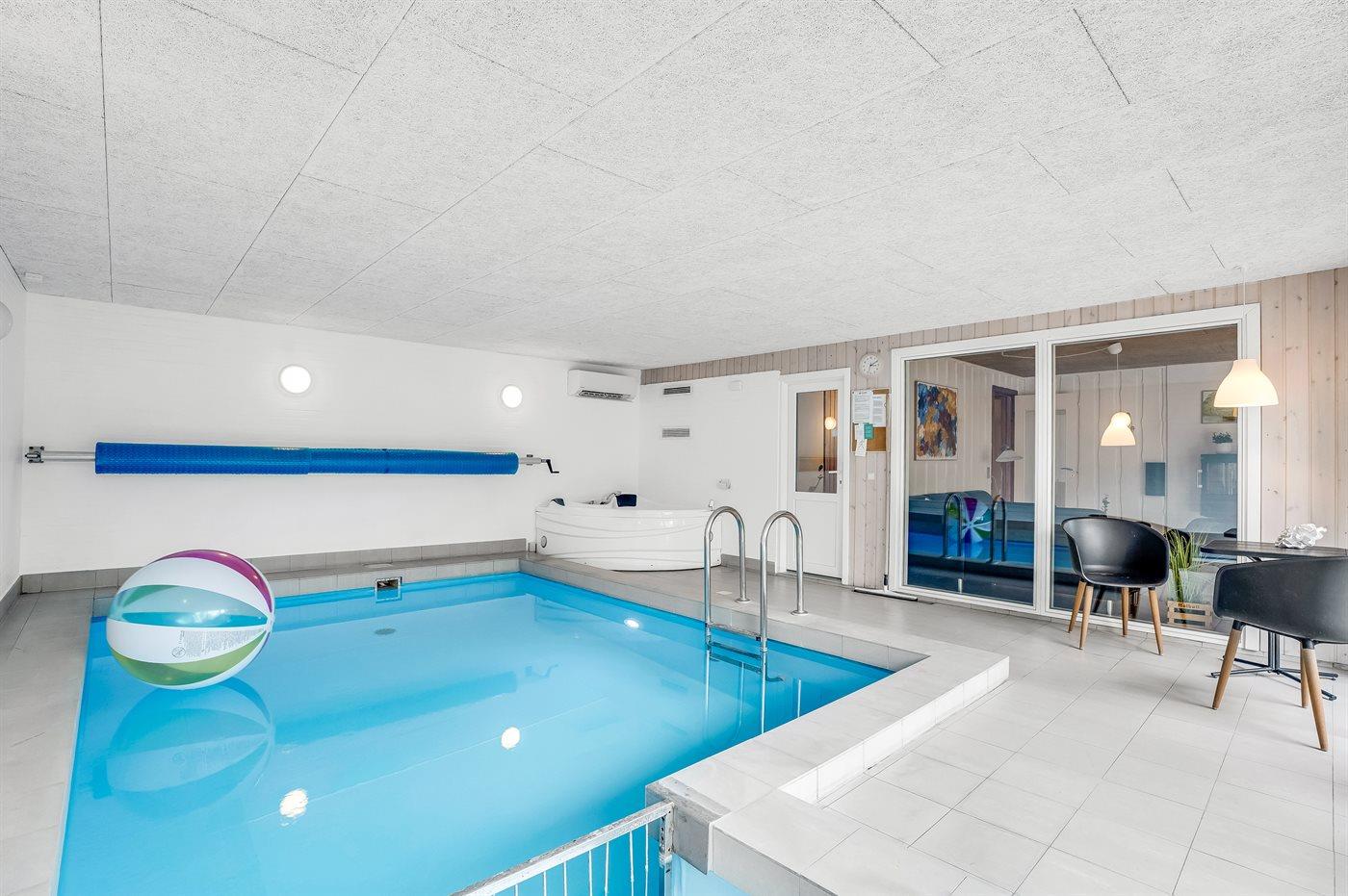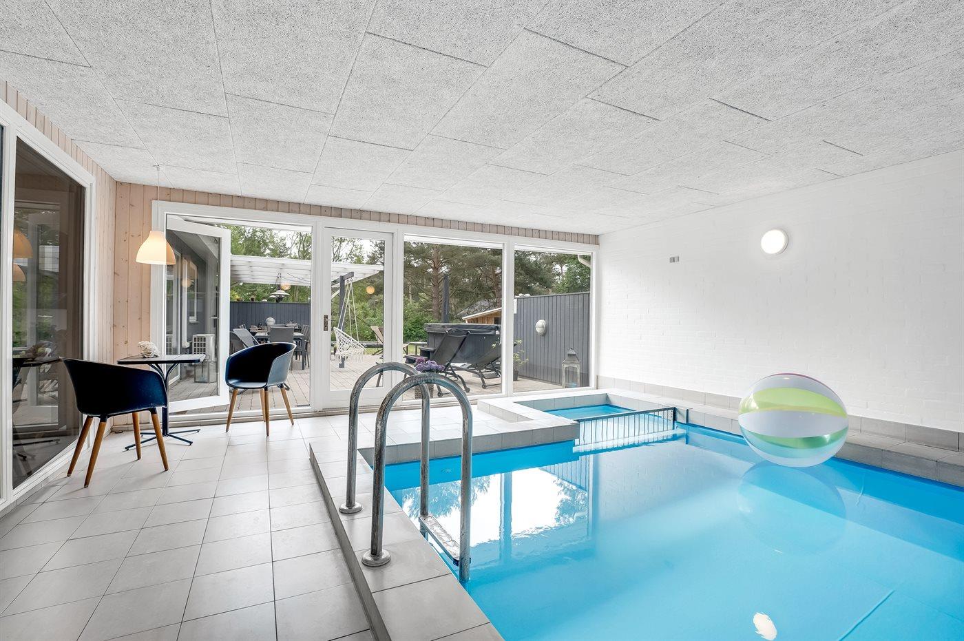 Det er tilladt at medbringe husdyr. Grunden er indhegnet. Man fornemmer straks den ro der hviler over sommerhuset, og med en tur i poolen/spaen ude/ inde eller en gåtur på de hyggelige stisystemer til vandet, så er der rig mulighed for afslapning. Huset er smagfuldt indrettet i 2021 med nye møbler. I den indendørs swimmingpool er der mulighed for leg og hyggeligt samvær. Swimmingpoolen måler 3,5 x 4,5 meter og er 1,3 m dyb. Til de små er der børnepool. Vandet er 24 til 28 grader varmt. I pool rum findes der 2 personers spa. Der er stor 6 personers standvandsspa udenfor med mulighed for afslapning året rundt. Spaen er ikke fyldt med vand ved ankomst, så ønskes spa ikke benyttet, er der ingen udgift til opvarmning. Ved benyttelse, er vandet i spaen 38 grader varmt på 3 timer. Der er i alt 5 soveværelser. Sovepladserne fordeler sig på: 4 sovepladser i dobbeltsenge. 6 sovepladser i enkeltsenge. Derudover er der 1 stk. barneseng. Køkkenet er udstyret med et køle/fryseskab med 60 liter fryser. Der er 4 induktionsplader, varmluftsovn, mikrobølgeovn samt opvaskemaskine alt af nyere dato. Der er 2 moderne badeværelser med bruseniche og 2 toiletter. I sauna og indendørs spa er der mulighed for afslapning. I begge badeværelser, køkken og stue er der gulvvarme. Til opvarmning er der såvel varmepumpe og brændeovn i stue udover gulvvarme samt el radiatorer i soveværelser. I ferieboligen er der er 1 TV, DVD-afspiller og radio. Der er danske, tyske, svenske og norske tv-kanaler. Der er trådløst internet til rådighed. Fra stuen er der adgang til en 70 m2 stor delvis afskærmet sydvendt terrasse med 20 m2 overdækning. Havemøbler til 10 personer, 2 solvogne samt 2 grille. I den store have findes der: Legehus, gynger, 2 fodboldmål samt stor nedgravet trampolin. Shelter. Der er carport samt parkering ved boligen.