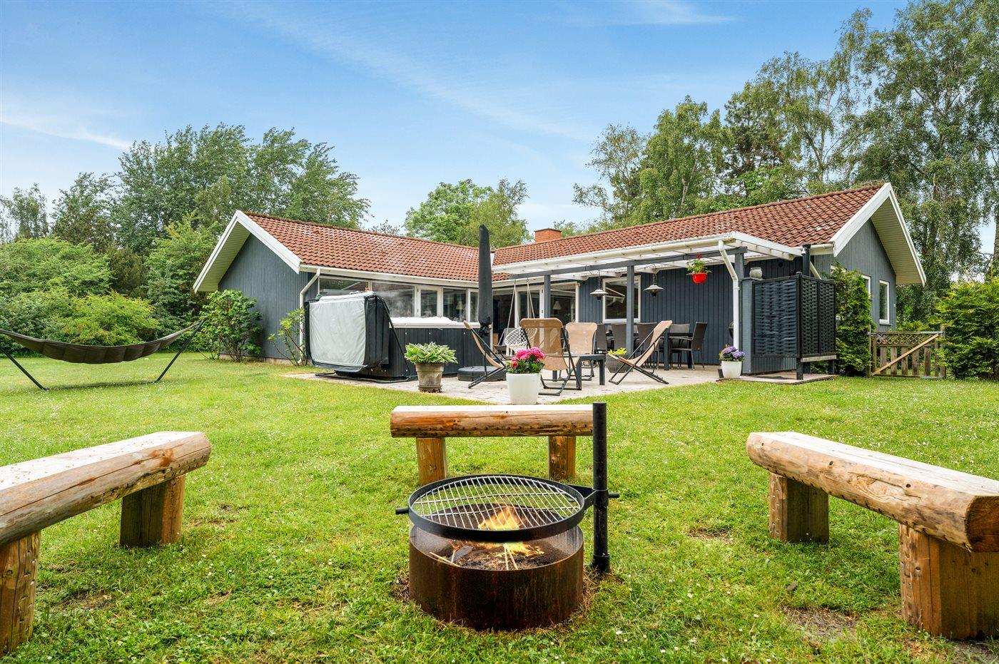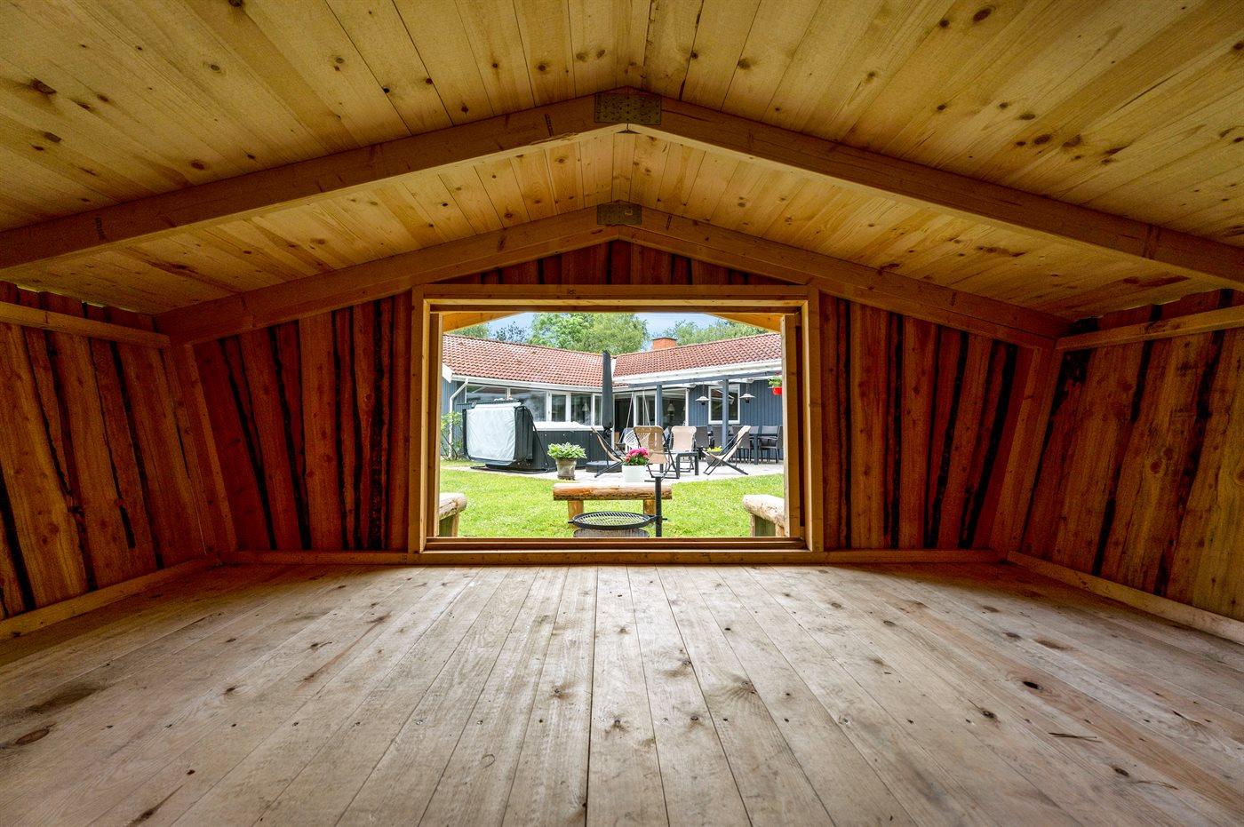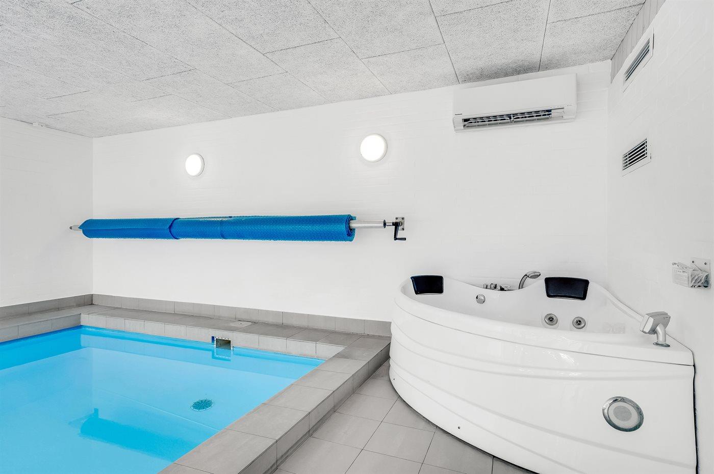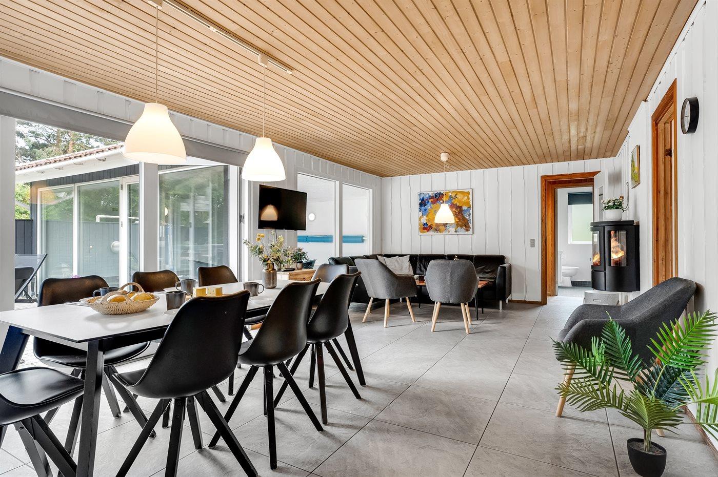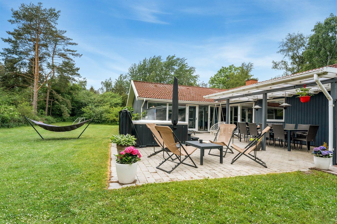 Det er tilladt at medbringe husdyr. Grunden er indhegnet. Man fornemmer straks den ro der hviler over sommerhuset, og med en tur i poolen/spaen ude/ inde eller en gåtur på de hyggelige stisystemer til vandet, så er der rig mulighed for afslapning. Huset er smagfuldt indrettet i 2021 med nye møbler. I den indendørs swimmingpool er der mulighed for leg og hyggeligt samvær. Swimmingpoolen måler 3,5 x 4,5 meter og er 1,3 m dyb. Til de små er der børnepool. Vandet er 24 til 28 grader varmt. I pool rum findes der 2 personers spa. Der er stor 6 personers standvandsspa udenfor med mulighed for afslapning året rundt. Spaen er ikke fyldt med vand ved ankomst, så ønskes spa ikke benyttet, er der ingen udgift til opvarmning. Ved benyttelse, er vandet i spaen 38 grader varmt på 3 timer. Der er i alt 5 soveværelser. Sovepladserne fordeler sig på: 4 sovepladser i dobbeltsenge. 6 sovepladser i enkeltsenge. Derudover er der 1 stk. barneseng. Køkkenet er udstyret med et køle/fryseskab med 60 liter fryser. Der er 4 induktionsplader, varmluftsovn, mikrobølgeovn samt opvaskemaskine alt af nyere dato. Der er 2 moderne badeværelser med bruseniche og 2 toiletter. I sauna og indendørs spa er der mulighed for afslapning. I begge badeværelser, køkken og stue er der gulvvarme. Til opvarmning er der såvel varmepumpe og brændeovn i stue udover gulvvarme samt el radiatorer i soveværelser. I ferieboligen er der er 1 TV, DVD-afspiller og radio. Der er danske, tyske, svenske og norske tv-kanaler. Der er trådløst internet til rådighed. Fra stuen er der adgang til en 70 m2 stor delvis afskærmet sydvendt terrasse med 20 m2 overdækning. Havemøbler til 10 personer, 2 solvogne samt 2 grille. I den store have findes der: Legehus, gynger, 2 fodboldmål samt stor nedgravet trampolin. Shelter. Der er carport samt parkering ved boligen.