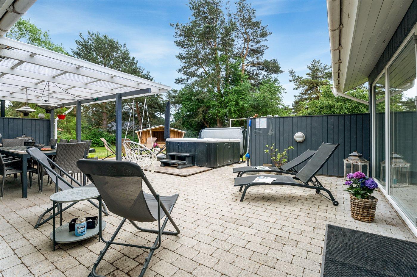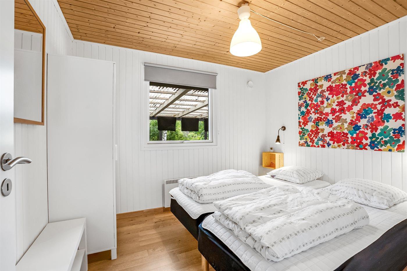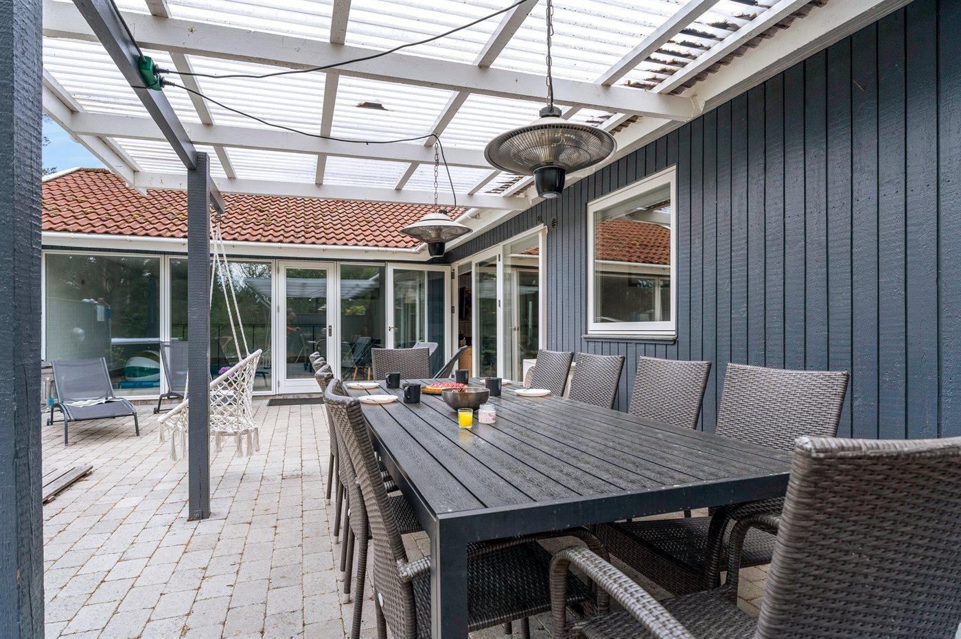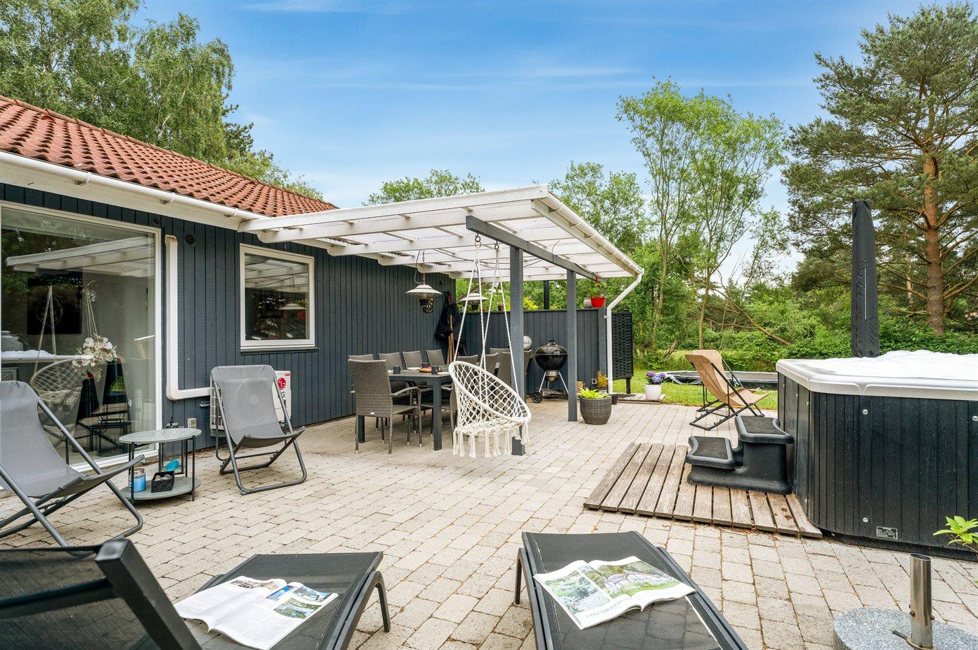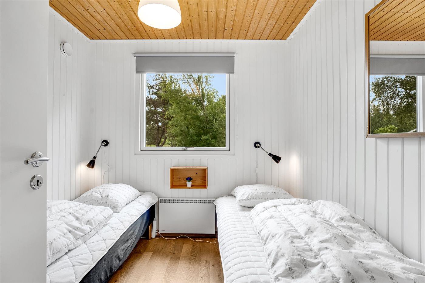 Det er tilladt at medbringe husdyr. Grunden er indhegnet. Man fornemmer straks den ro der hviler over sommerhuset, og med en tur i poolen/spaen ude/ inde eller en gåtur på de hyggelige stisystemer til vandet, så er der rig mulighed for afslapning. Huset er smagfuldt indrettet i 2021 med nye møbler. I den indendørs swimmingpool er der mulighed for leg og hyggeligt samvær. Swimmingpoolen måler 3,5 x 4,5 meter og er 1,3 m dyb. Til de små er der børnepool. Vandet er 24 til 28 grader varmt. I pool rum findes der 2 personers spa. Der er stor 6 personers standvandsspa udenfor med mulighed for afslapning året rundt. Spaen er ikke fyldt med vand ved ankomst, så ønskes spa ikke benyttet, er der ingen udgift til opvarmning. Ved benyttelse, er vandet i spaen 38 grader varmt på 3 timer. Der er i alt 5 soveværelser. Sovepladserne fordeler sig på: 4 sovepladser i dobbeltsenge. 6 sovepladser i enkeltsenge. Derudover er der 1 stk. barneseng. Køkkenet er udstyret med et køle/fryseskab med 60 liter fryser. Der er 4 induktionsplader, varmluftsovn, mikrobølgeovn samt opvaskemaskine alt af nyere dato. Der er 2 moderne badeværelser med bruseniche og 2 toiletter. I sauna og indendørs spa er der mulighed for afslapning. I begge badeværelser, køkken og stue er der gulvvarme. Til opvarmning er der såvel varmepumpe og brændeovn i stue udover gulvvarme samt el radiatorer i soveværelser. I ferieboligen er der er 1 TV, DVD-afspiller og radio. Der er danske, tyske, svenske og norske tv-kanaler. Der er trådløst internet til rådighed. Fra stuen er der adgang til en 70 m2 stor delvis afskærmet sydvendt terrasse med 20 m2 overdækning. Havemøbler til 10 personer, 2 solvogne samt 2 grille. I den store have findes der: Legehus, gynger, 2 fodboldmål samt stor nedgravet trampolin. Shelter. Der er carport samt parkering ved boligen.