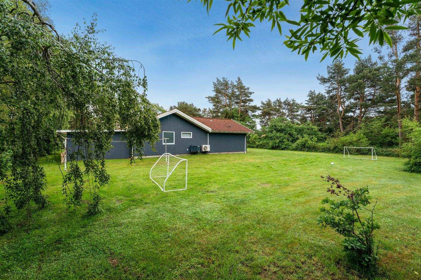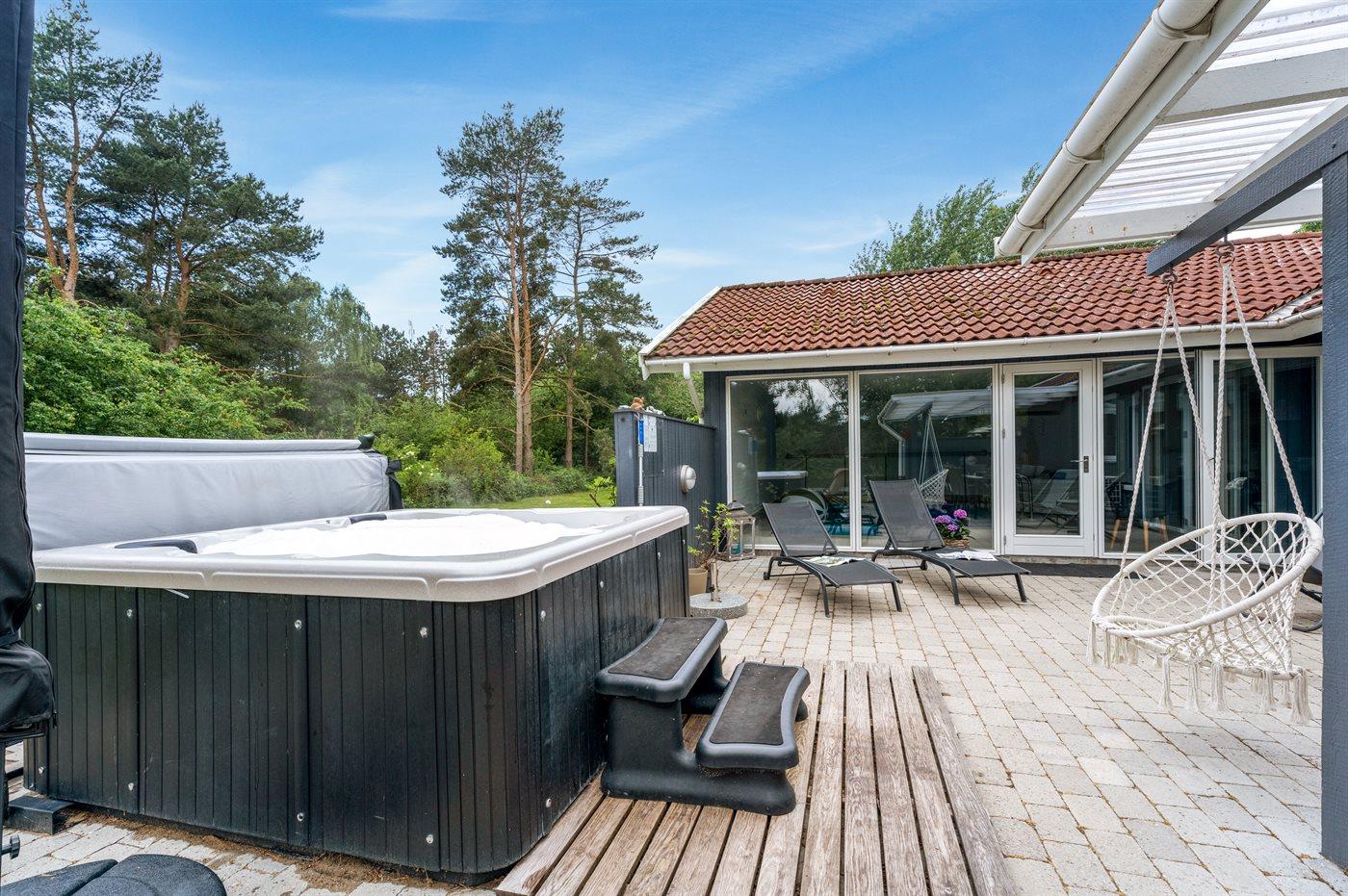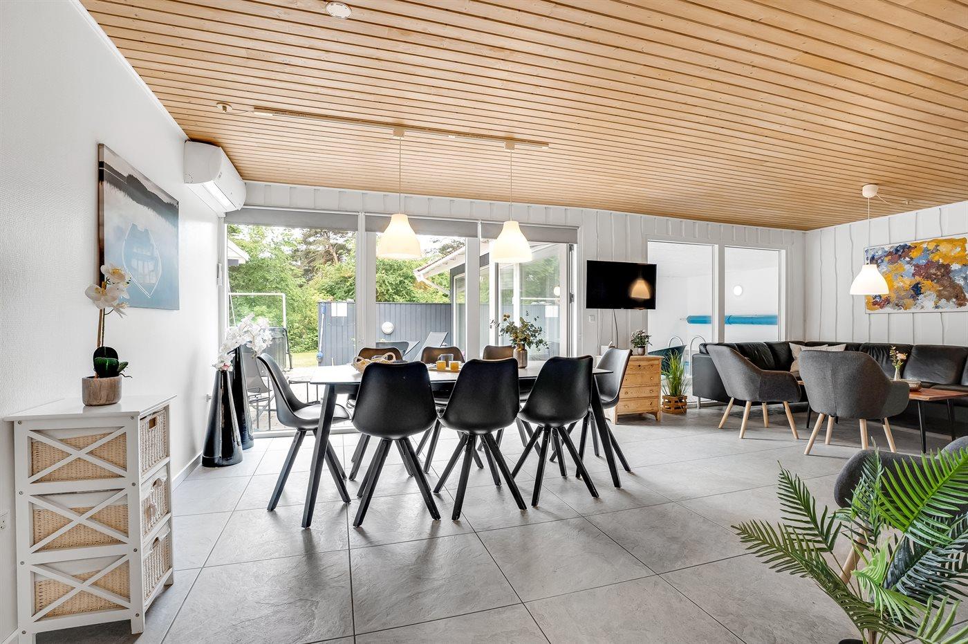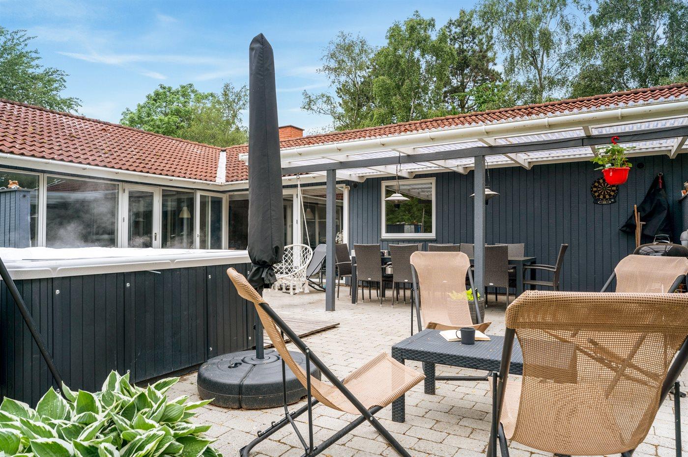 Det er tilladt at medbringe husdyr. Grunden er indhegnet. Man fornemmer straks den ro der hviler over sommerhuset, og med en tur i poolen/spaen ude/ inde eller en gåtur på de hyggelige stisystemer til vandet, så er der rig mulighed for afslapning. Huset er smagfuldt indrettet i 2021 med nye møbler. I den indendørs swimmingpool er der mulighed for leg og hyggeligt samvær. Swimmingpoolen måler 3,5 x 4,5 meter og er 1,3 m dyb. Til de små er der børnepool. Vandet er 24 til 28 grader varmt. I pool rum findes der 2 personers spa. Der er stor 6 personers standvandsspa udenfor med mulighed for afslapning året rundt. Spaen er ikke fyldt med vand ved ankomst, så ønskes spa ikke benyttet, er der ingen udgift til opvarmning. Ved benyttelse, er vandet i spaen 38 grader varmt på 3 timer. Der er i alt 5 soveværelser. Sovepladserne fordeler sig på: 4 sovepladser i dobbeltsenge. 6 sovepladser i enkeltsenge. Derudover er der 1 stk. barneseng. Køkkenet er udstyret med et køle/fryseskab med 60 liter fryser. Der er 4 induktionsplader, varmluftsovn, mikrobølgeovn samt opvaskemaskine alt af nyere dato. Der er 2 moderne badeværelser med bruseniche og 2 toiletter. I sauna og indendørs spa er der mulighed for afslapning. I begge badeværelser, køkken og stue er der gulvvarme. Til opvarmning er der såvel varmepumpe og brændeovn i stue udover gulvvarme samt el radiatorer i soveværelser. I ferieboligen er der er 1 TV, DVD-afspiller og radio. Der er danske, tyske, svenske og norske tv-kanaler. Der er trådløst internet til rådighed. Fra stuen er der adgang til en 70 m2 stor delvis afskærmet sydvendt terrasse med 20 m2 overdækning. Havemøbler til 10 personer, 2 solvogne samt 2 grille. I den store have findes der: Legehus, gynger, 2 fodboldmål samt stor nedgravet trampolin. Shelter. Der er carport samt parkering ved boligen.