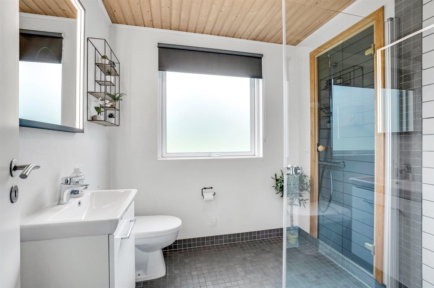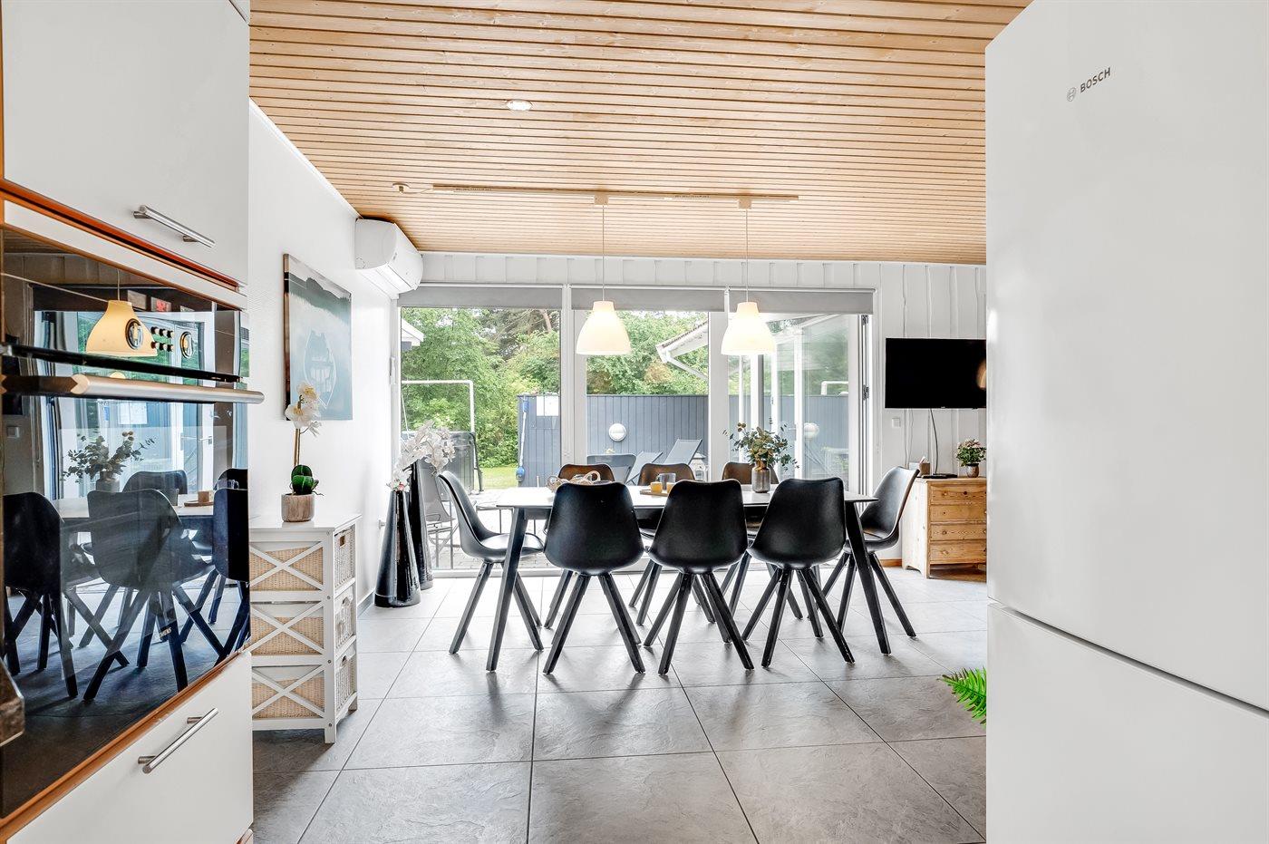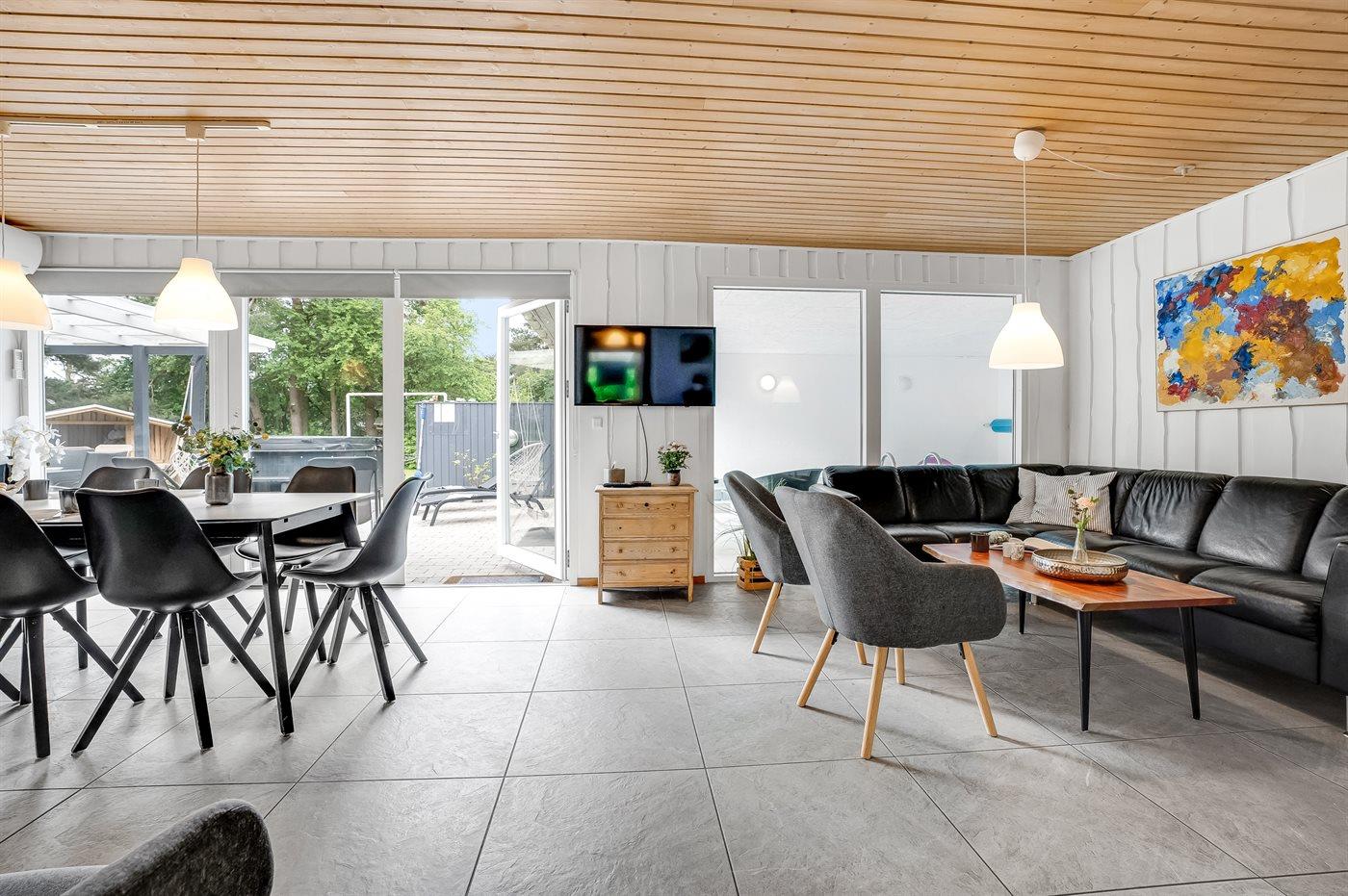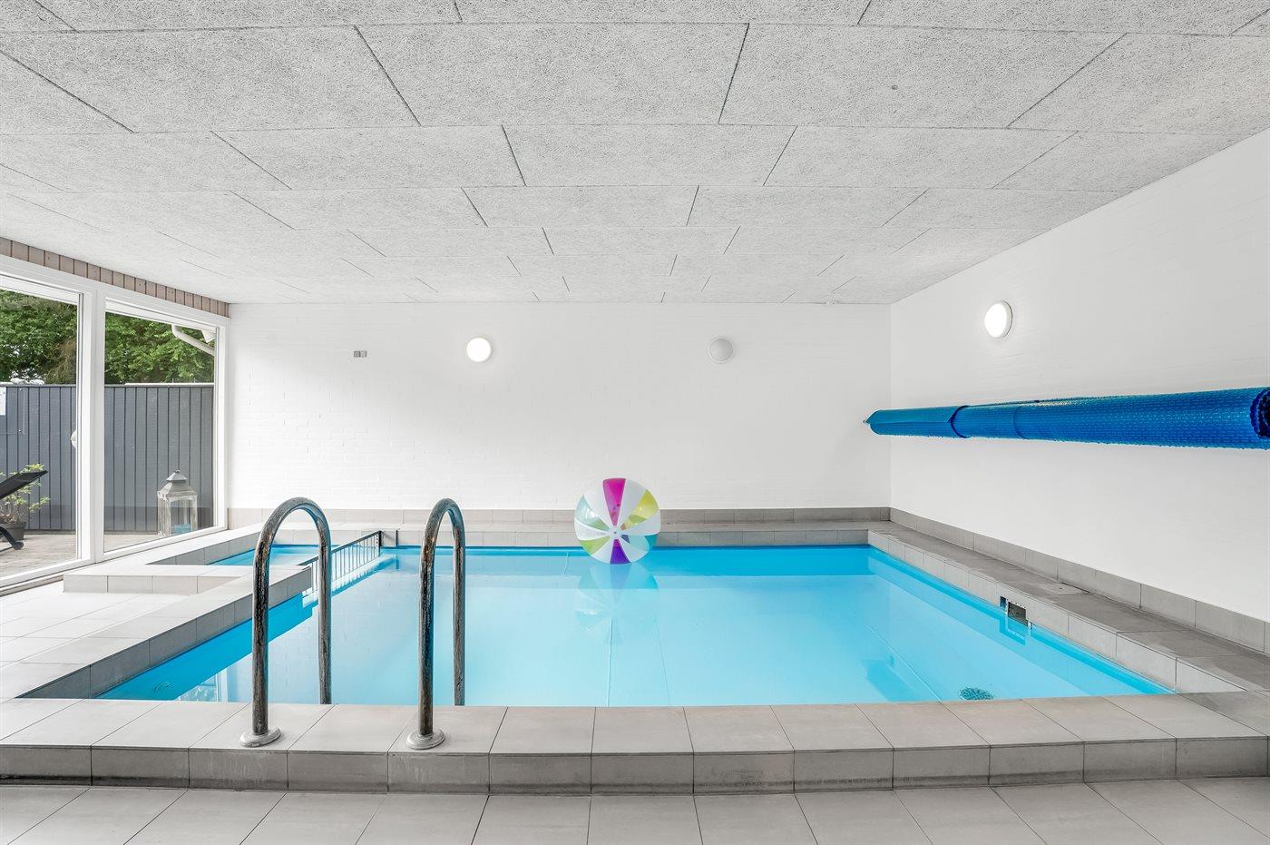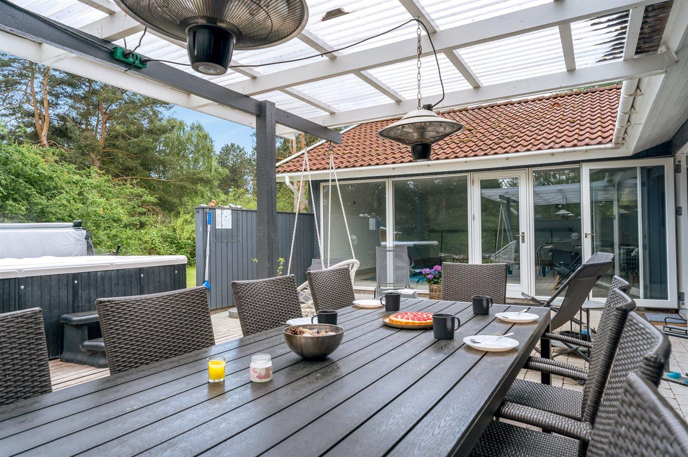 Det er tilladt at medbringe husdyr. Grunden er indhegnet. Man fornemmer straks den ro der hviler over sommerhuset, og med en tur i poolen/spaen ude/ inde eller en gåtur på de hyggelige stisystemer til vandet, så er der rig mulighed for afslapning. Huset er smagfuldt indrettet i 2021 med nye møbler. I den indendørs swimmingpool er der mulighed for leg og hyggeligt samvær. Swimmingpoolen måler 3,5 x 4,5 meter og er 1,3 m dyb. Til de små er der børnepool. Vandet er 24 til 28 grader varmt. I pool rum findes der 2 personers spa. Der er stor 6 personers standvandsspa udenfor med mulighed for afslapning året rundt. Spaen er ikke fyldt med vand ved ankomst, så ønskes spa ikke benyttet, er der ingen udgift til opvarmning. Ved benyttelse, er vandet i spaen 38 grader varmt på 3 timer. Der er i alt 5 soveværelser. Sovepladserne fordeler sig på: 4 sovepladser i dobbeltsenge. 6 sovepladser i enkeltsenge. Derudover er der 1 stk. barneseng. Køkkenet er udstyret med et køle/fryseskab med 60 liter fryser. Der er 4 induktionsplader, varmluftsovn, mikrobølgeovn samt opvaskemaskine alt af nyere dato. Der er 2 moderne badeværelser med bruseniche og 2 toiletter. I sauna og indendørs spa er der mulighed for afslapning. I begge badeværelser, køkken og stue er der gulvvarme. Til opvarmning er der såvel varmepumpe og brændeovn i stue udover gulvvarme samt el radiatorer i soveværelser. I ferieboligen er der er 1 TV, DVD-afspiller og radio. Der er danske, tyske, svenske og norske tv-kanaler. Der er trådløst internet til rådighed. Fra stuen er der adgang til en 70 m2 stor delvis afskærmet sydvendt terrasse med 20 m2 overdækning. Havemøbler til 10 personer, 2 solvogne samt 2 grille. I den store have findes der: Legehus, gynger, 2 fodboldmål samt stor nedgravet trampolin. Shelter. Der er carport samt parkering ved boligen.