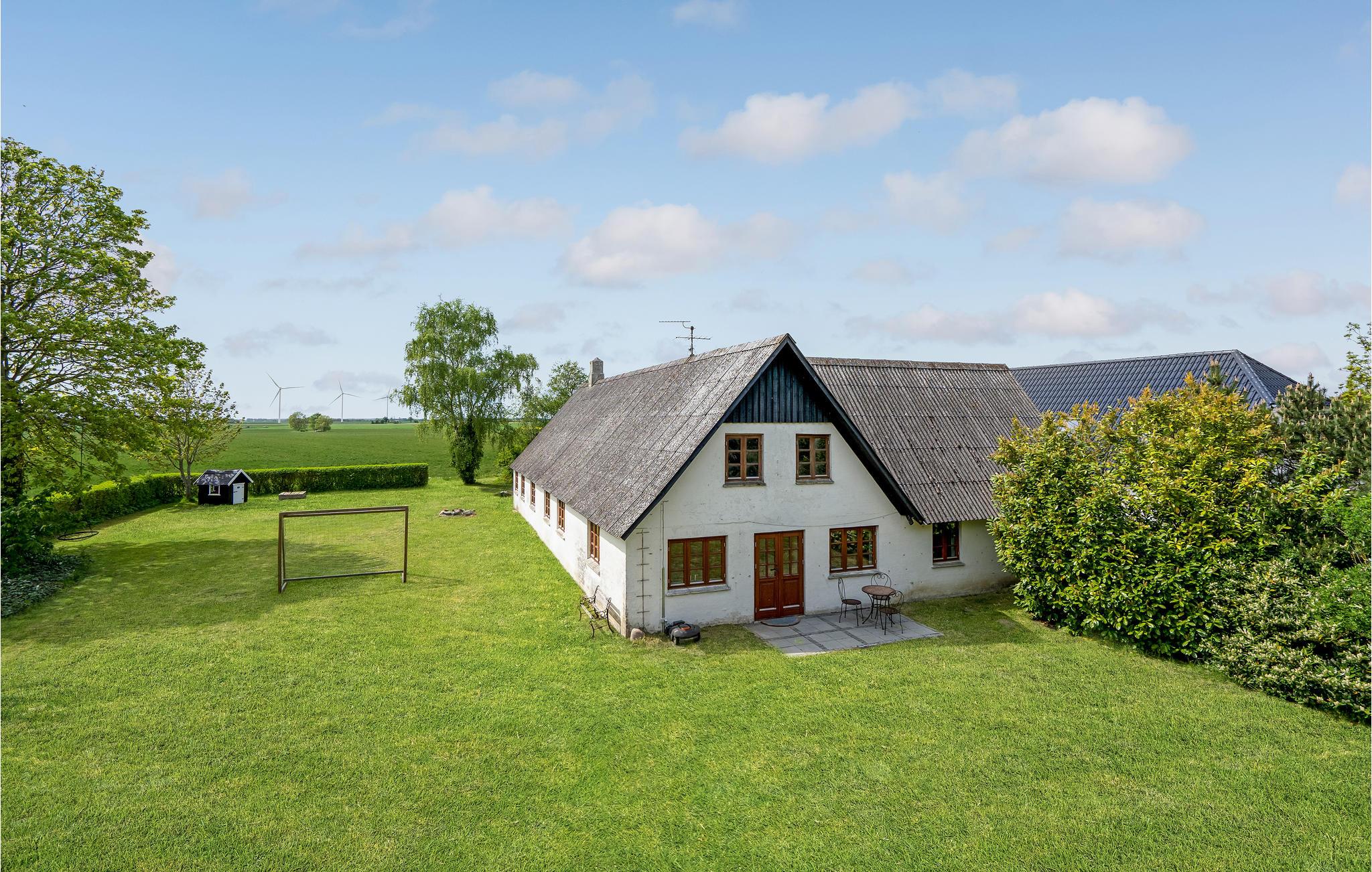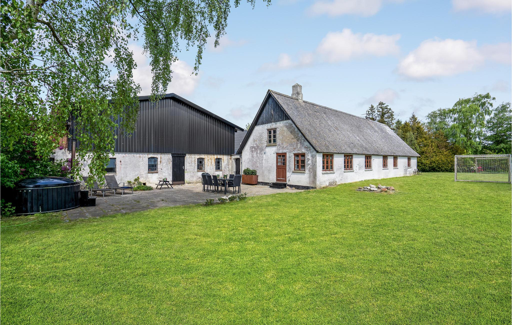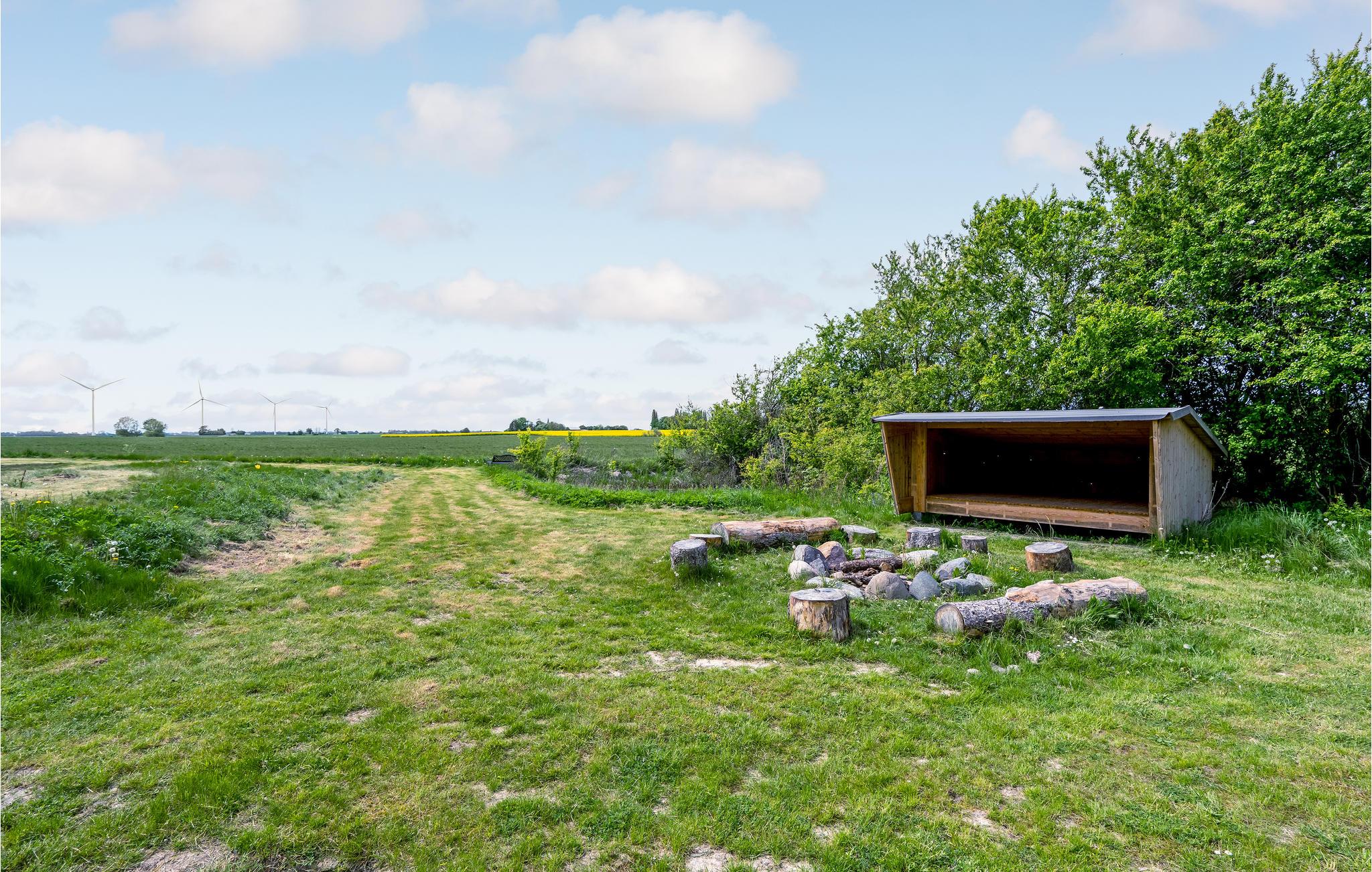 Udendørs er der en terrasse med havemøbler og grill til jeres rådighed. På terrassen finder I også et moderne vildmarksbad med plads til jer alle - det perfekte sted til at nyde et køligt glas hvis vin på de lune sommeraftener. Familiens yngste vil elske haven, hvor der er et væld af aktivitetsmuligheder som blandt andet legehus, sandkasse, fodboldmål og masser af udendørsspil. I har desuden en stor bålplads til rådighed, hvor I kan hygge jer med at lave snobrød, mens I nyder naturen og stilheden over de grønne marker.
