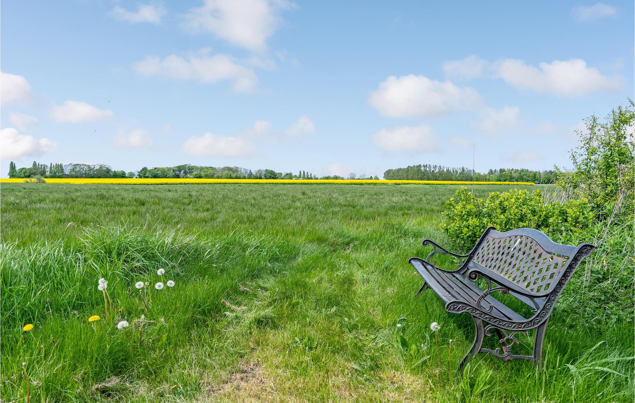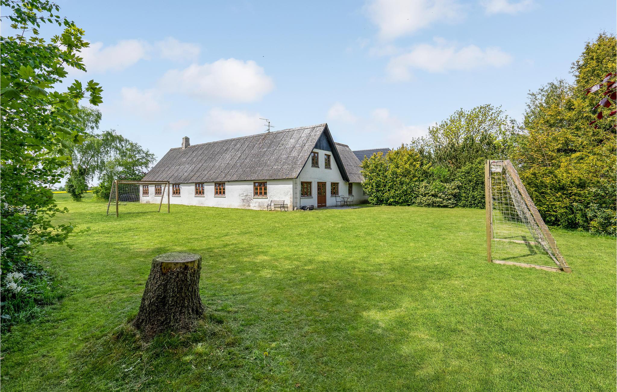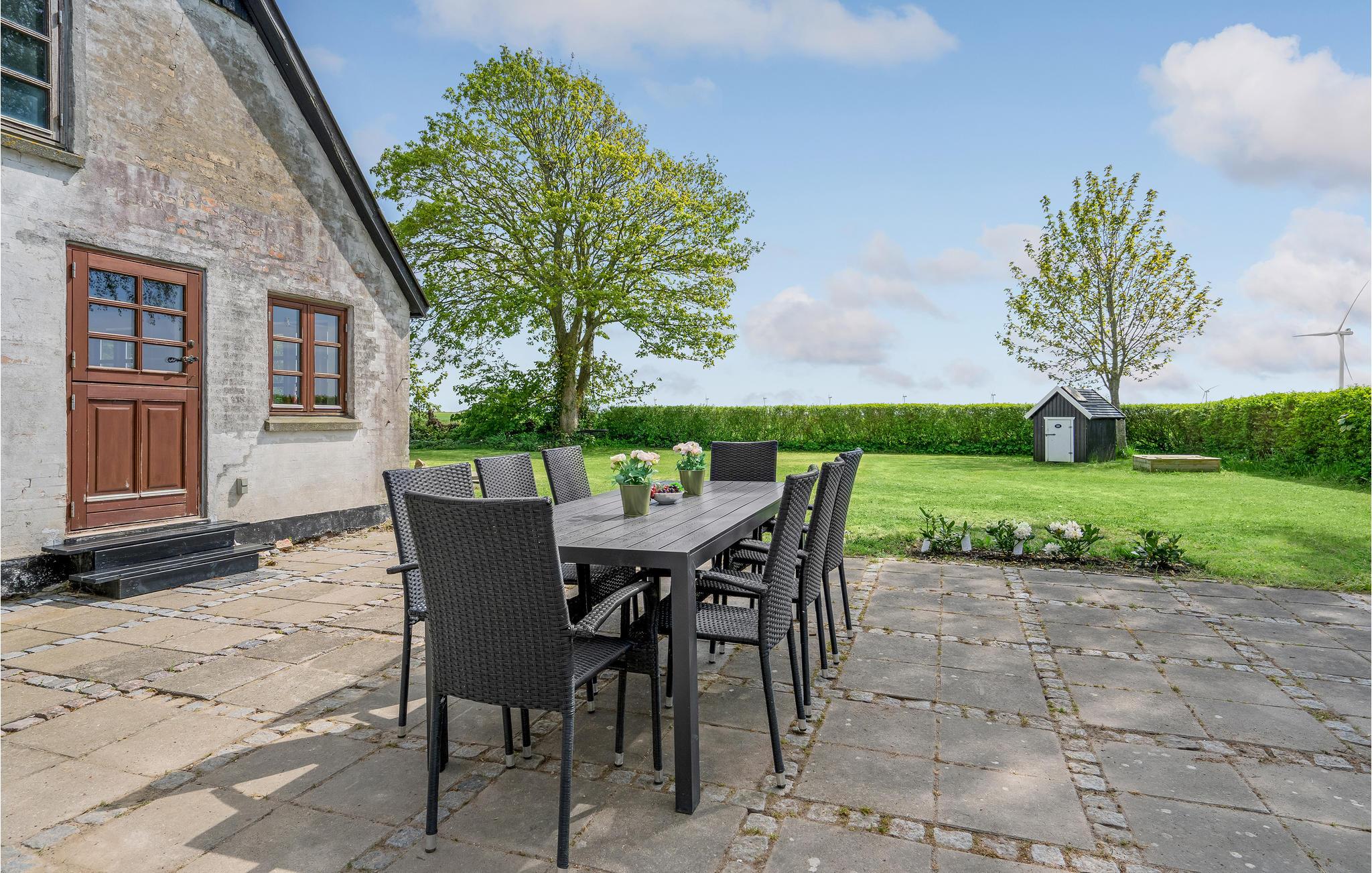 Udendørs er der en terrasse med havemøbler og grill til jeres rådighed. På terrassen finder I også et moderne vildmarksbad med plads til jer alle - det perfekte sted til at nyde et køligt glas hvis vin på de lune sommeraftener. Familiens yngste vil elske haven, hvor der er et væld af aktivitetsmuligheder som blandt andet legehus, sandkasse, fodboldmål og masser af udendørsspil. I har desuden en stor bålplads til rådighed, hvor I kan hygge jer med at lave snobrød, mens I nyder naturen og stilheden over de grønne marker.