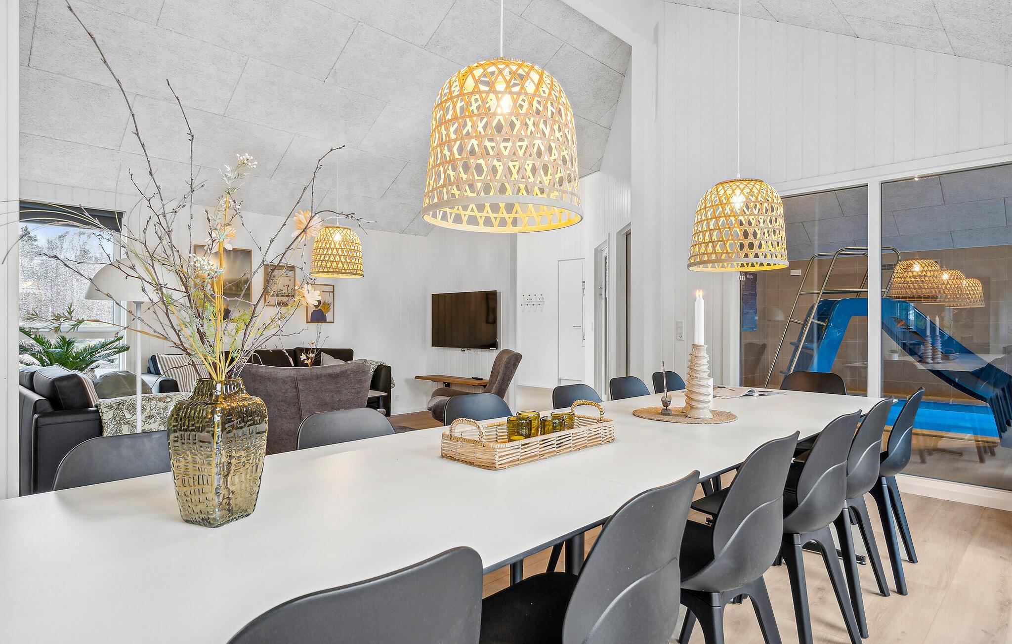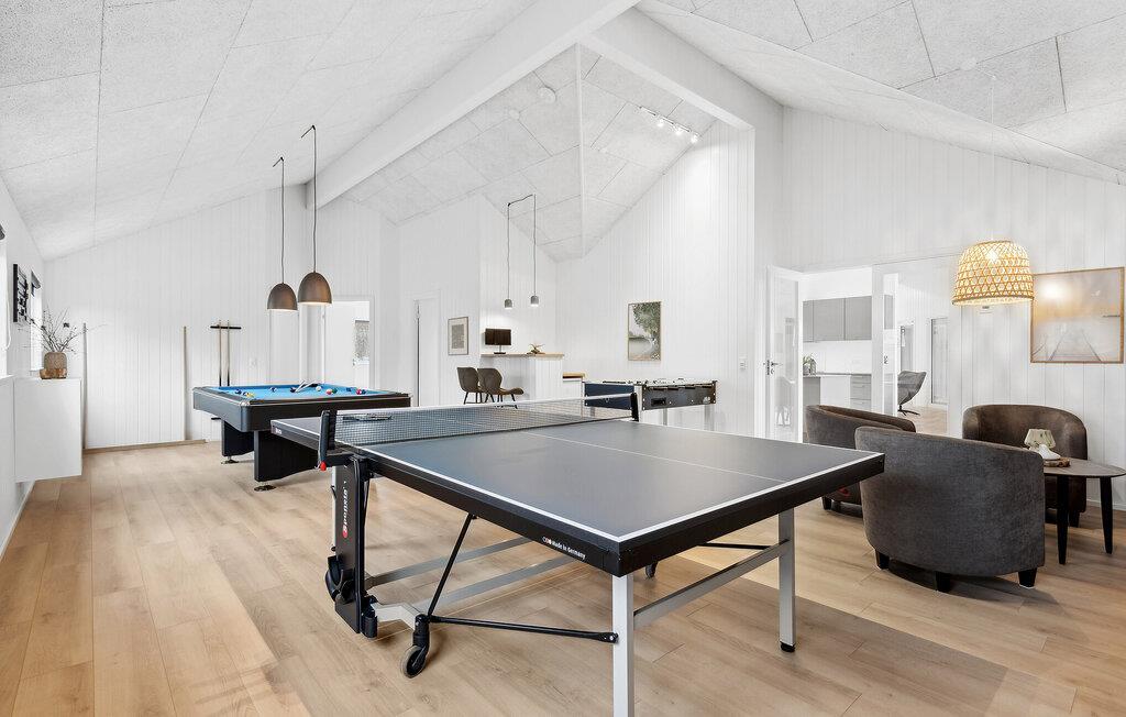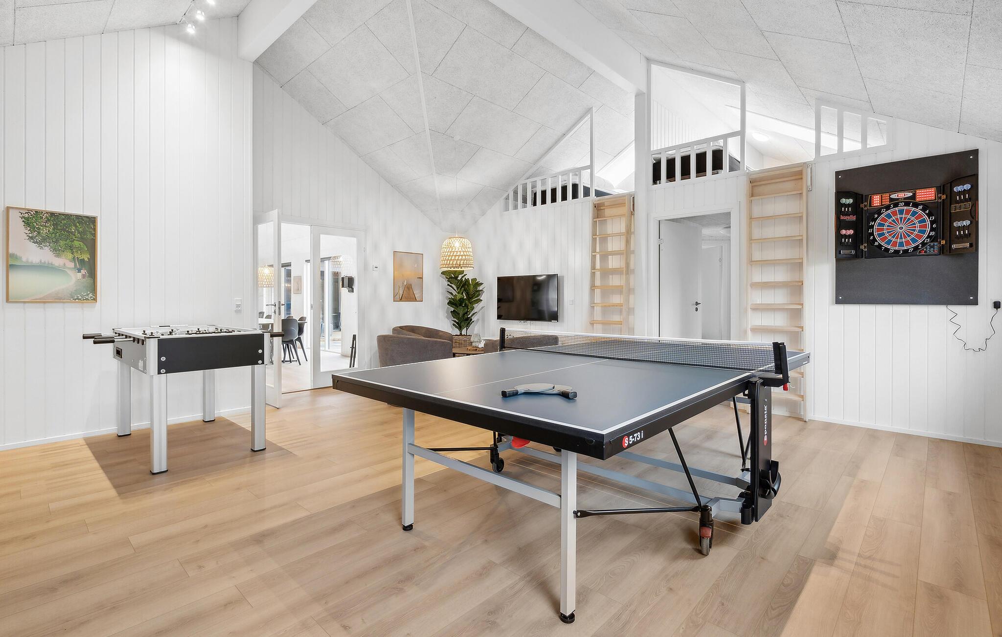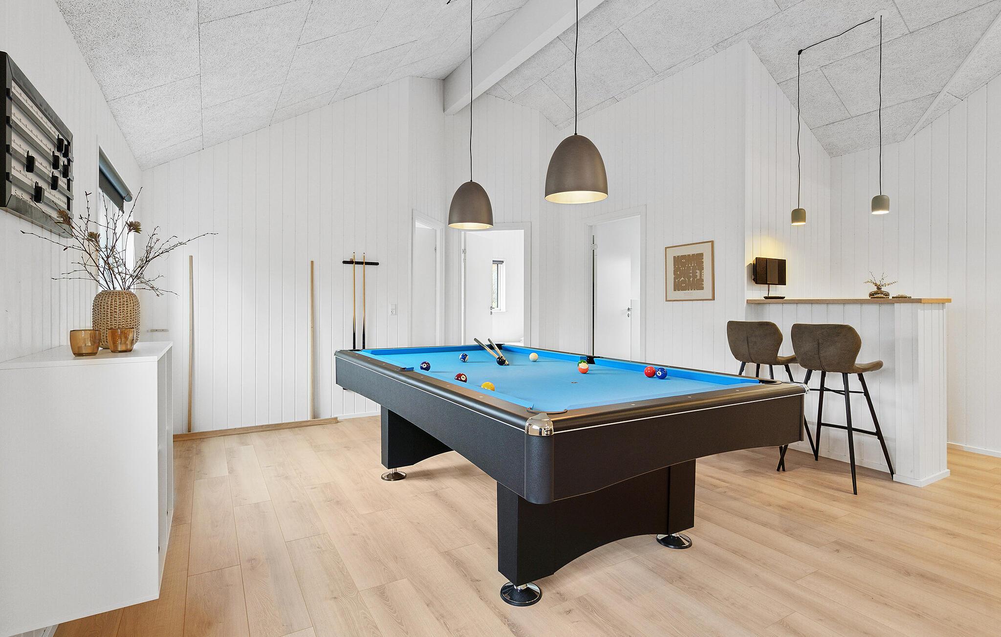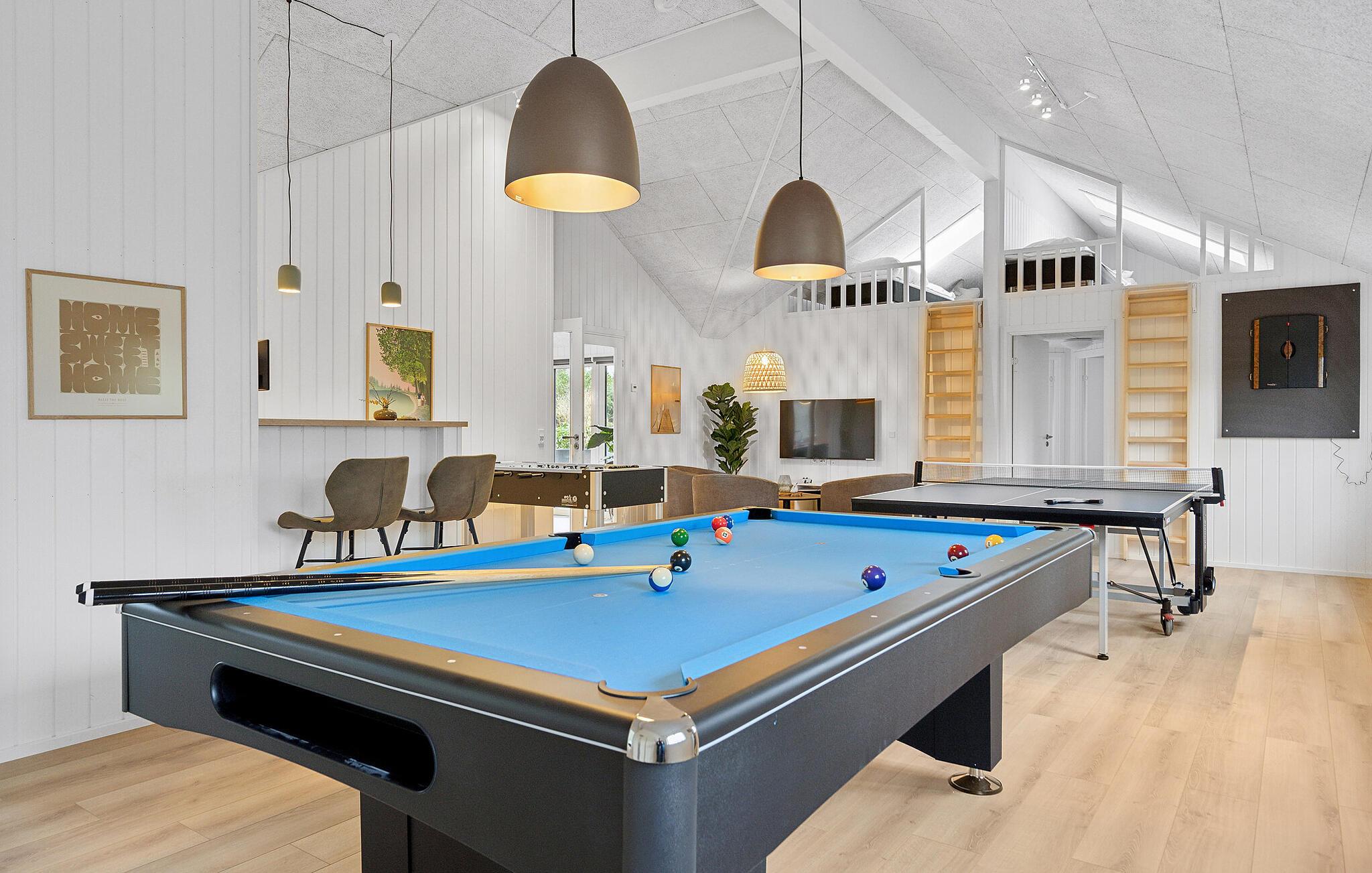 Lyse farver, højt til loftet og stilfulde lamper skaber en rolig og moderne atmosfære i jeres elegante feriehus. Tag plads i opholdsområdet, og nyd afslappede timer i de komfortable sofaer og lænestole. Tilbring tid sammen omkring det lange spisebord, som er ideelt til lækre måltider og hyggelige spilleaftener. Tilbered jeres retter i det åbne køkken med køkkenø, der byder på rigelig arbejdsplads og moderne udstyr. Træk jer tilbage til aktivitetsområdet for at spille billard, bordtennis eller dart. Benyt poolen til rolige svømmeture og forkæl jer selv med behagelig varme i saunaen.