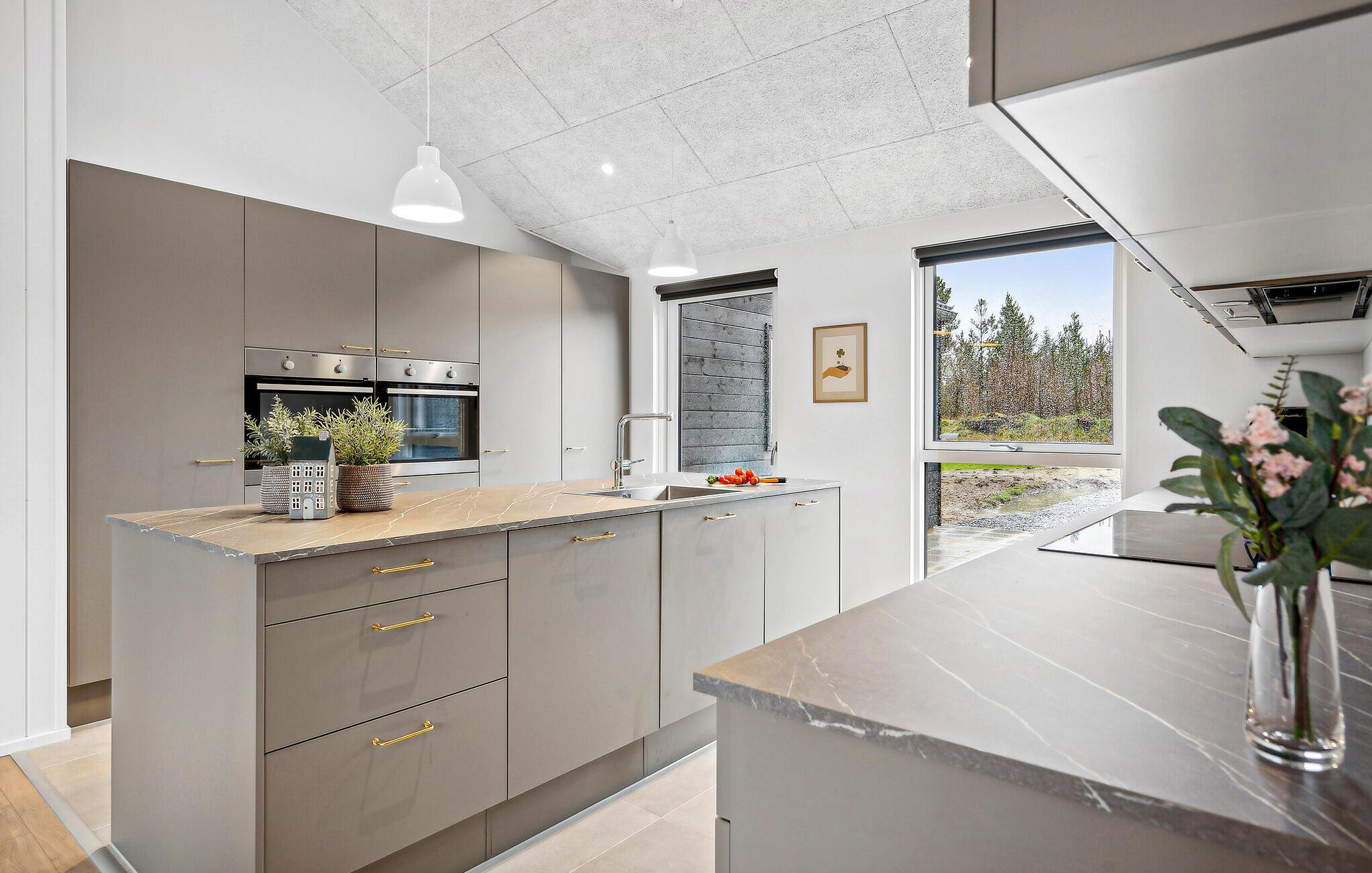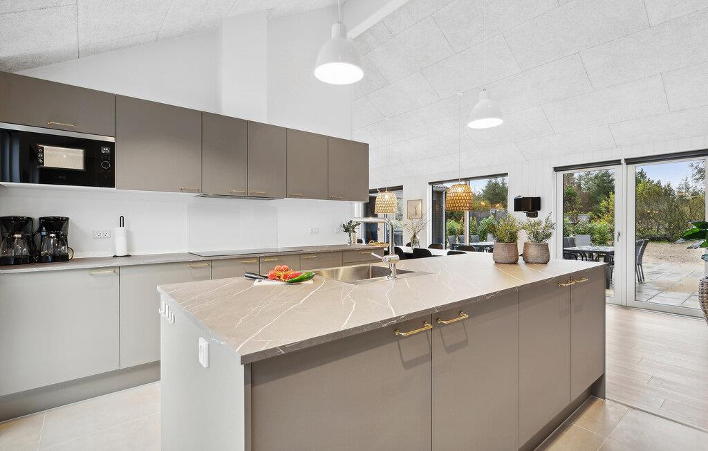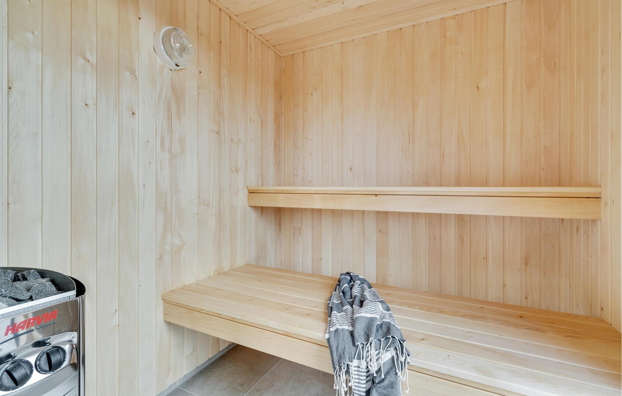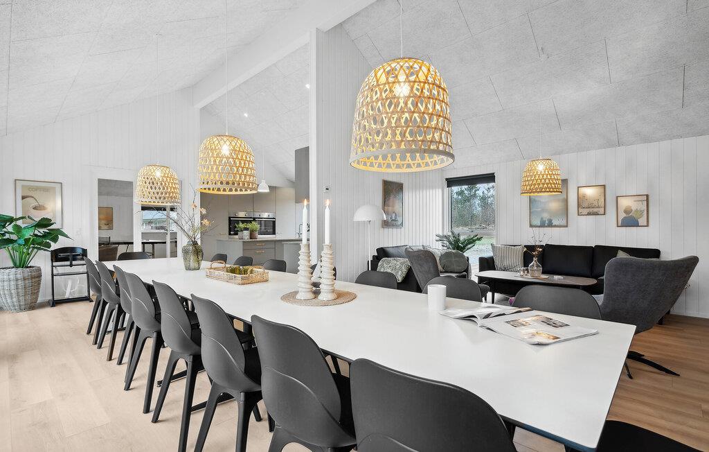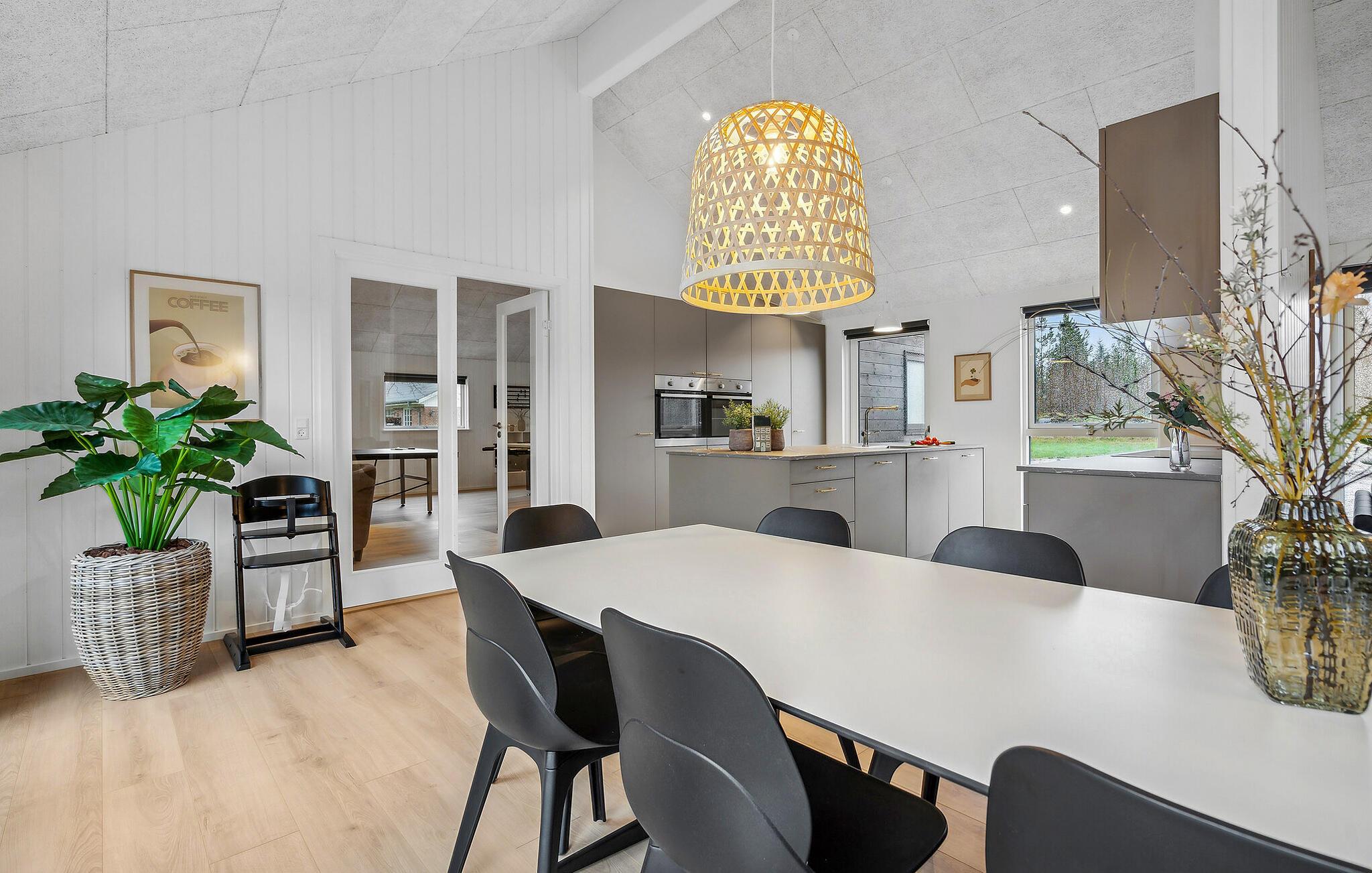 Lyse farver, højt til loftet og stilfulde lamper skaber en rolig og moderne atmosfære i jeres elegante feriehus. Tag plads i opholdsområdet, og nyd afslappede timer i de komfortable sofaer og lænestole. Tilbring tid sammen omkring det lange spisebord, som er ideelt til lækre måltider og hyggelige spilleaftener. Tilbered jeres retter i det åbne køkken med køkkenø, der byder på rigelig arbejdsplads og moderne udstyr. Træk jer tilbage til aktivitetsområdet for at spille billard, bordtennis eller dart. Benyt poolen til rolige svømmeture og forkæl jer selv med behagelig varme i saunaen.