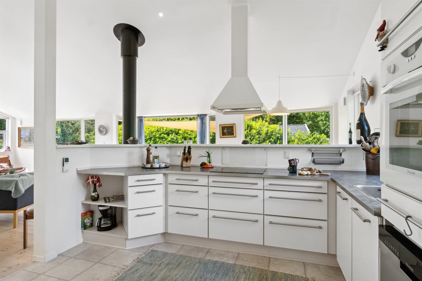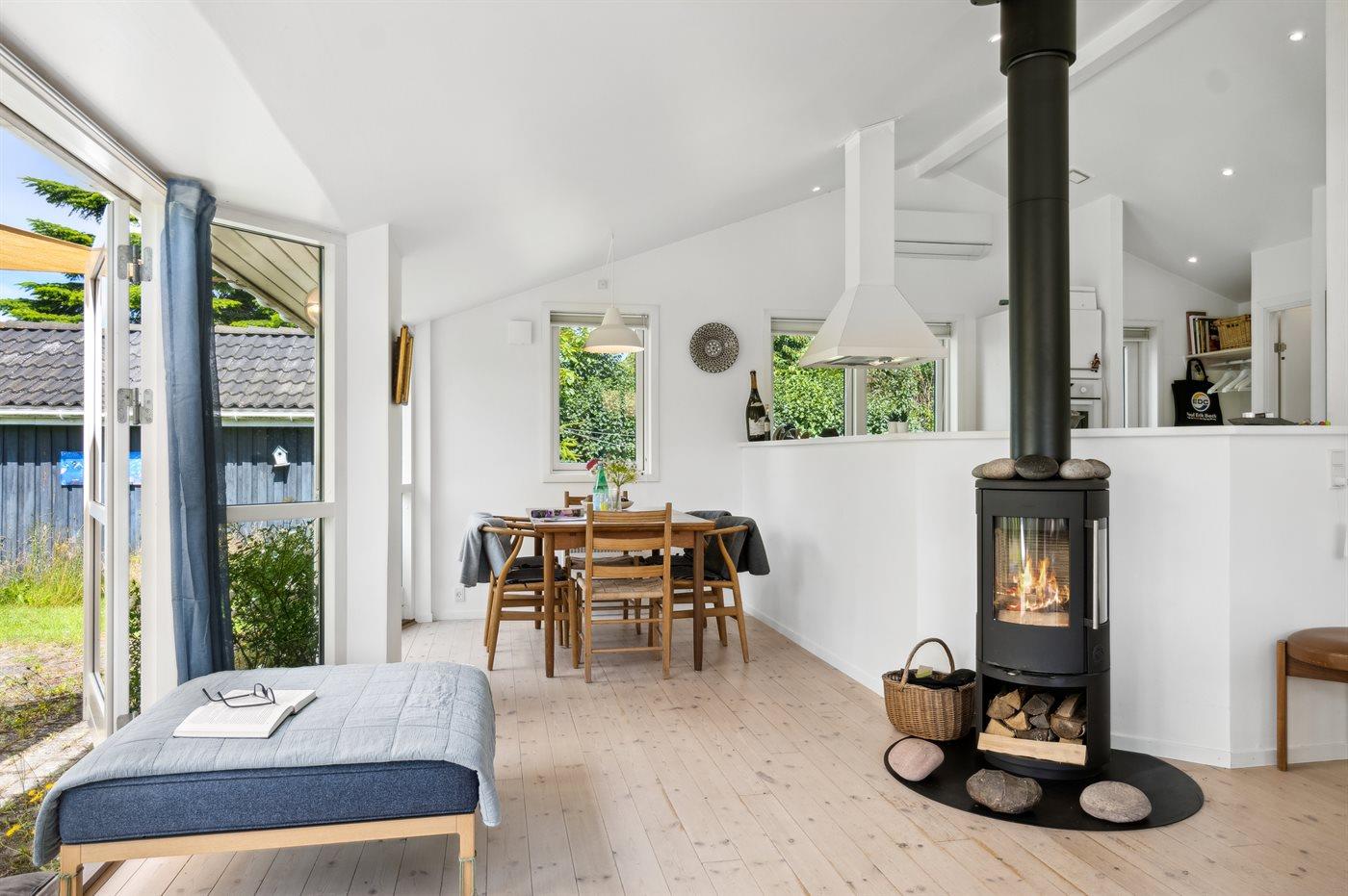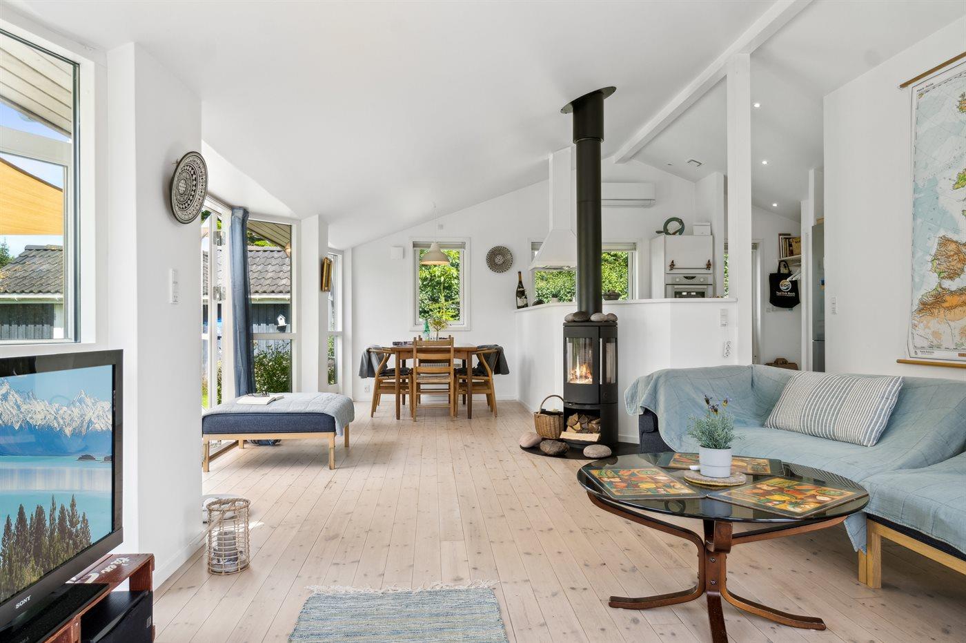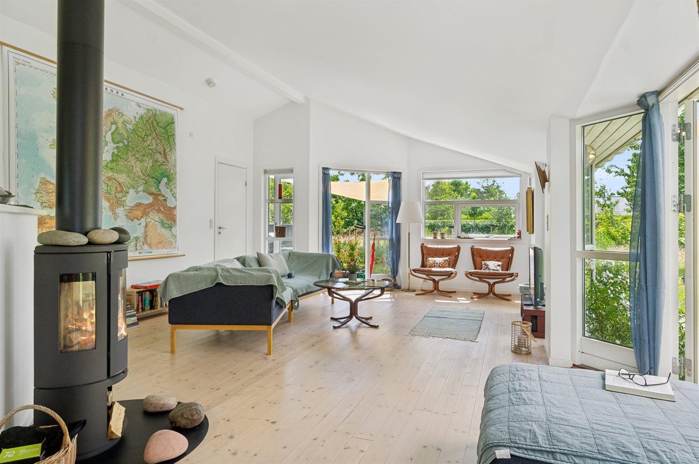 Stor og meget lyst, åbent køkken/alrum med store vinduer mod haven, 2 soveværelser, brændeovn, energirigtig varmepumpe og gulvvarme i bad.