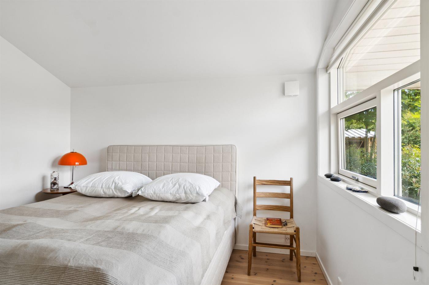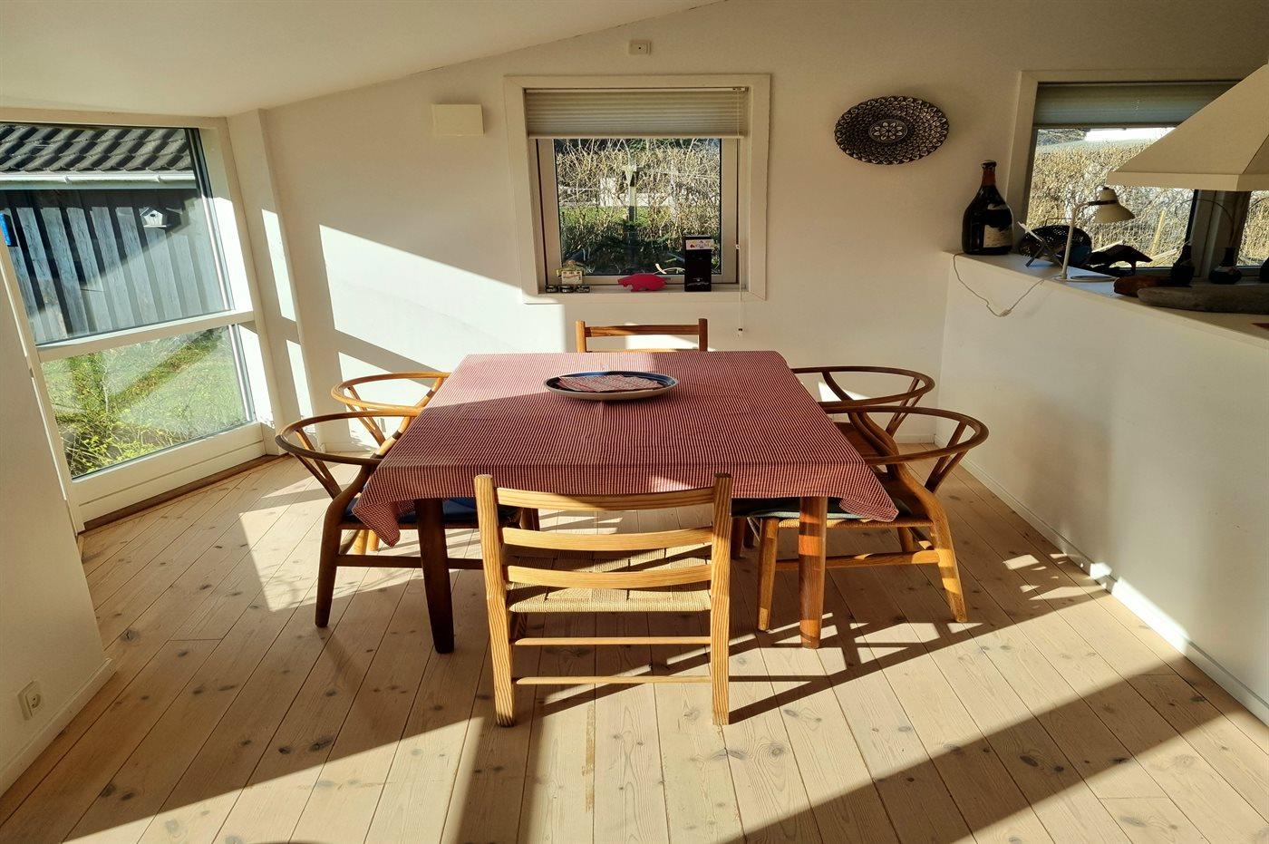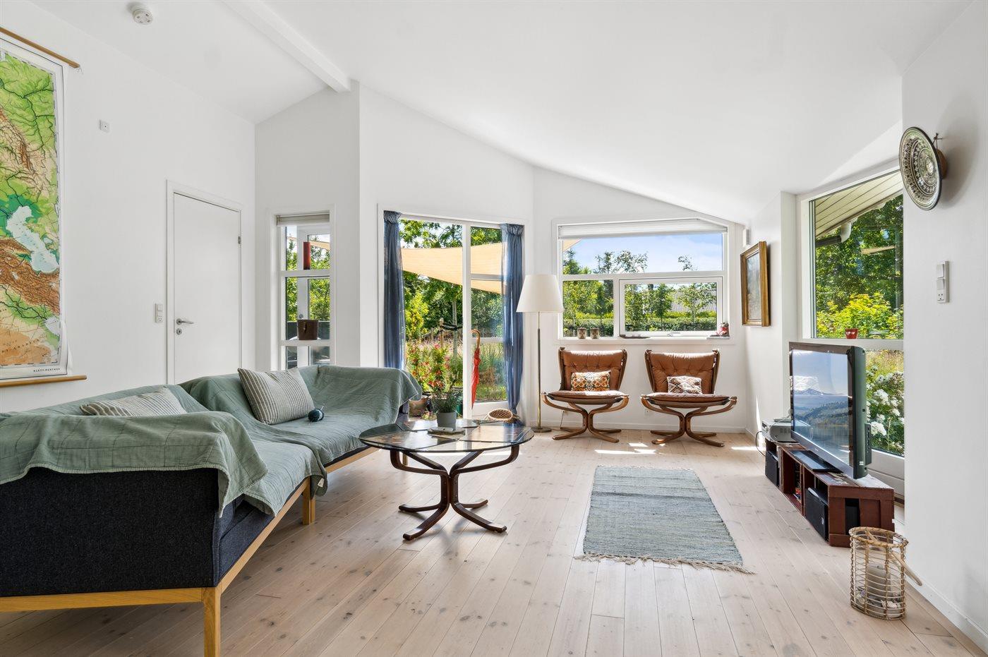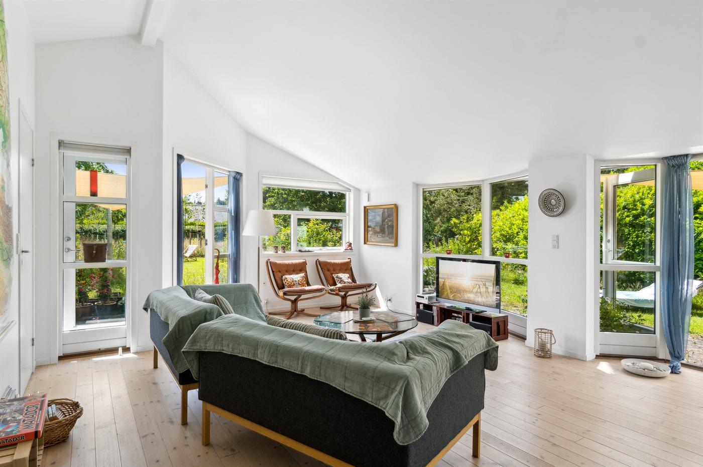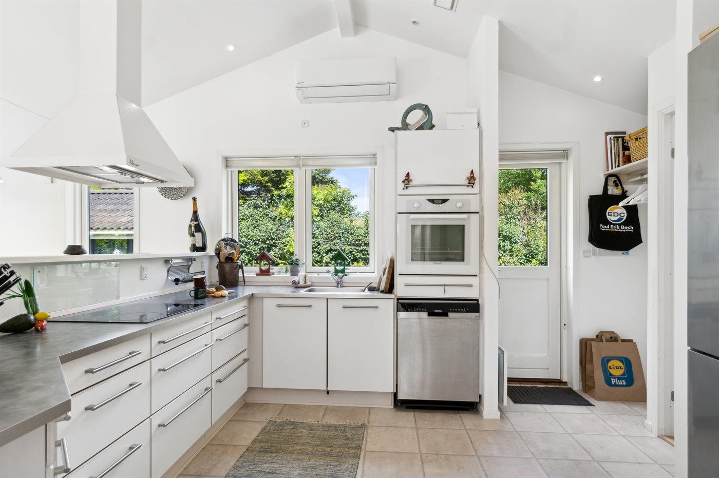 Stor og meget lyst, åbent køkken/alrum med store vinduer mod haven, 2 soveværelser, brændeovn, energirigtig varmepumpe og gulvvarme i bad.