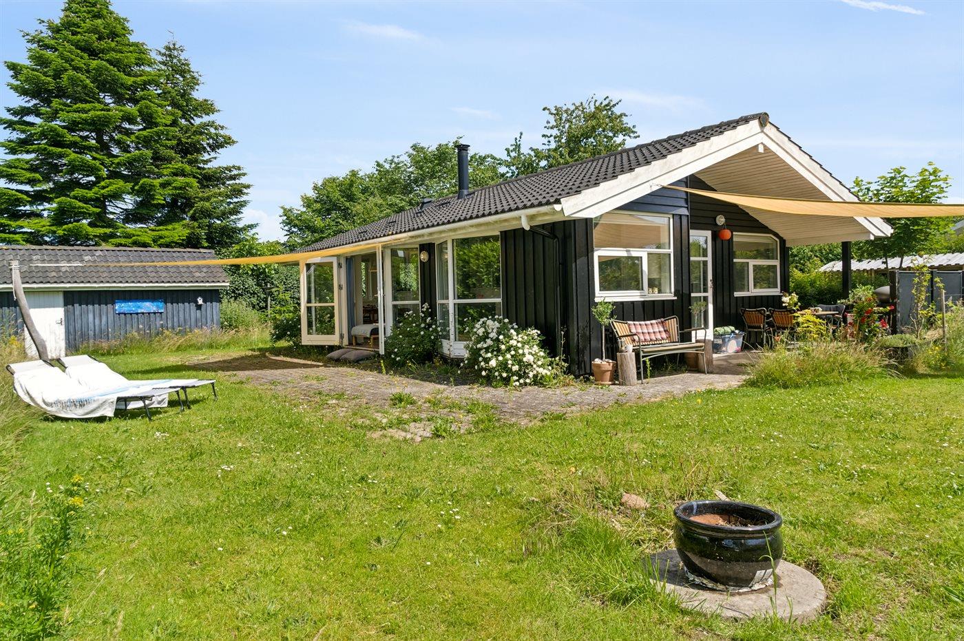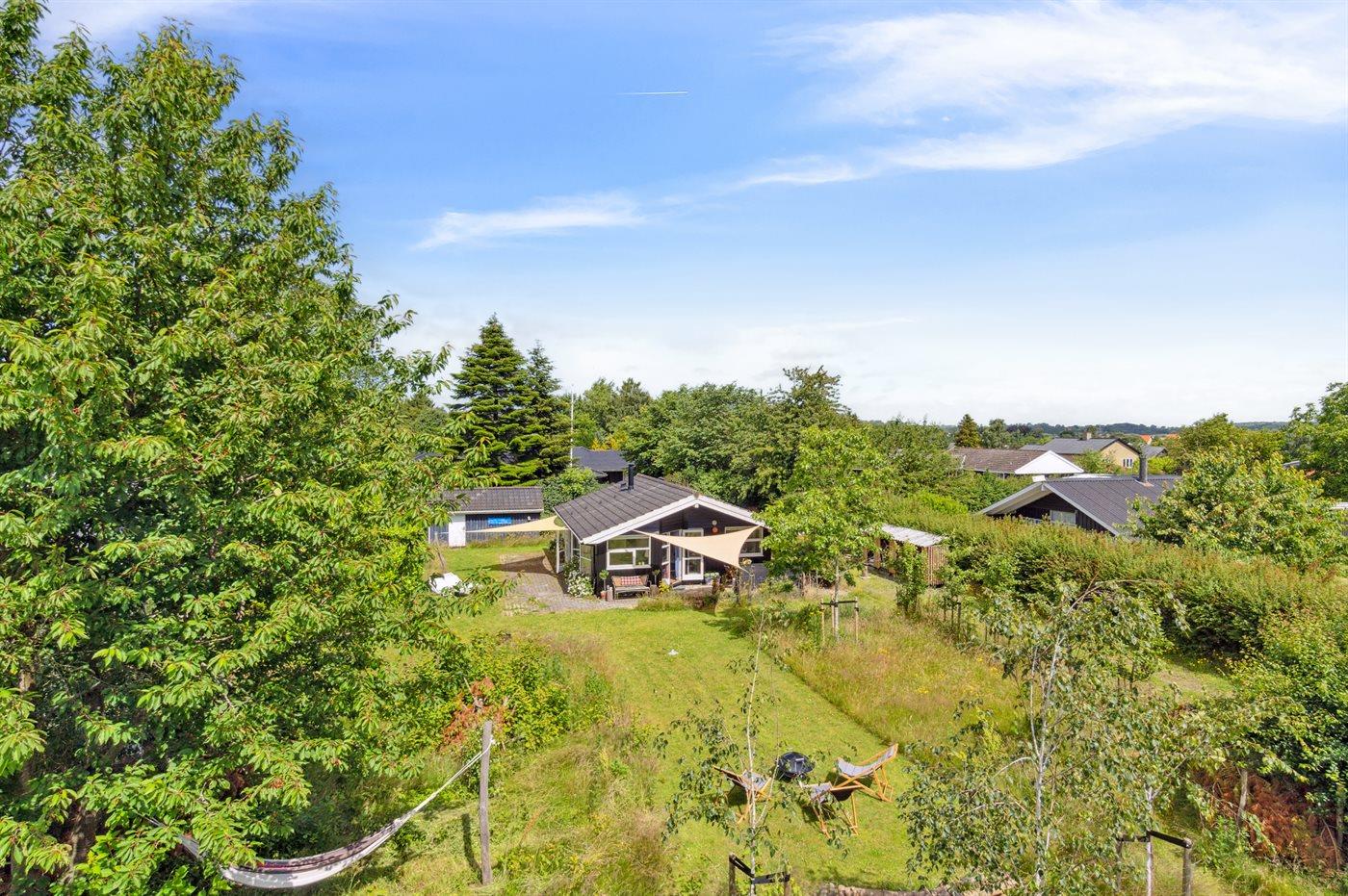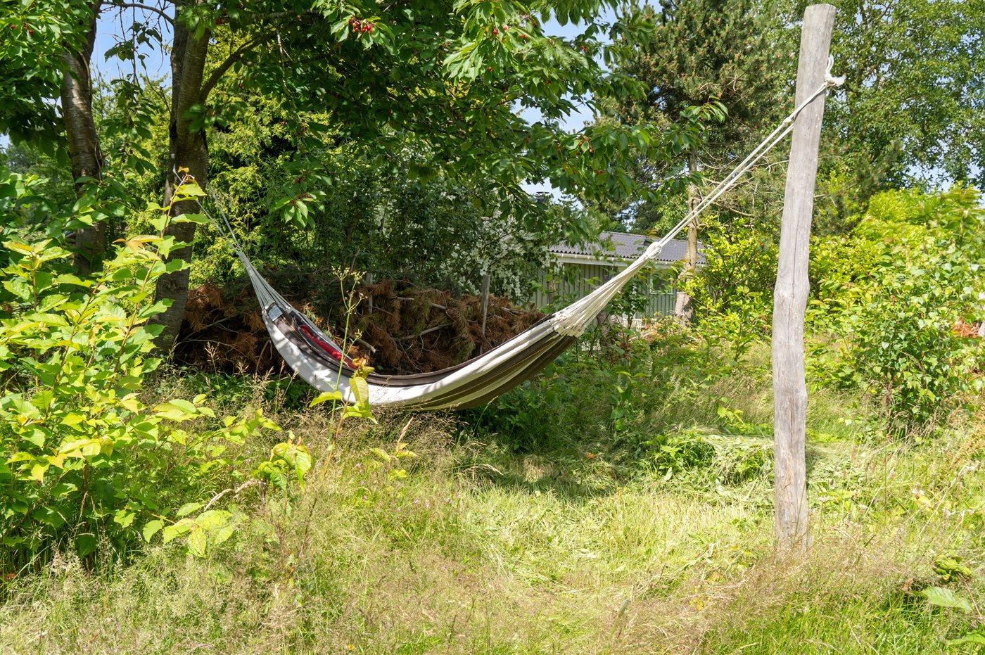 Sommerhus med god beliggenhed ved Lille Kregme med en vild naturhave med træer, solsejle, bålfad og hængekøje.