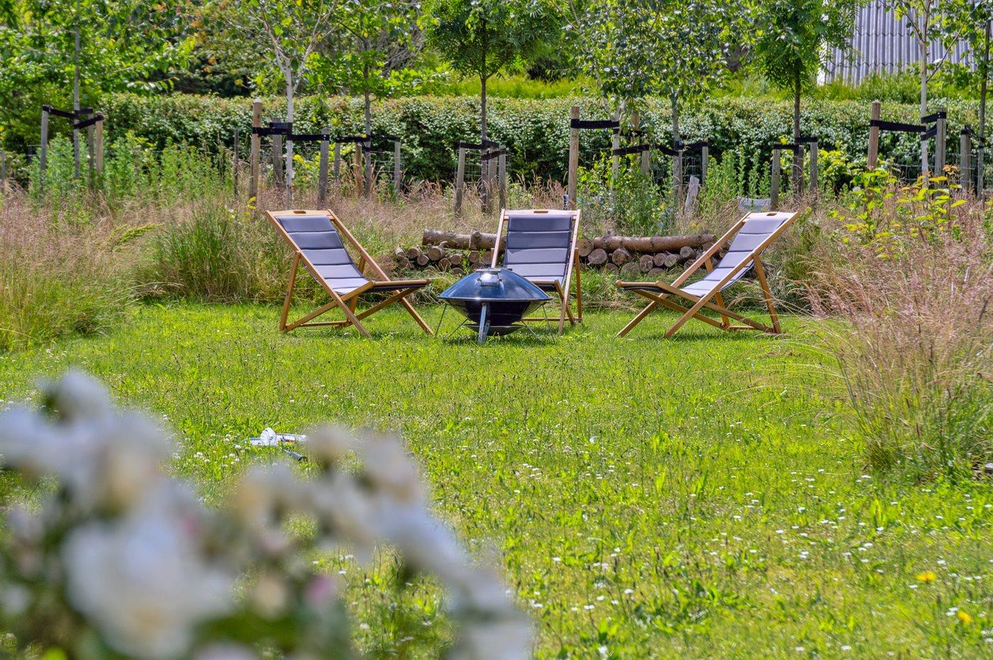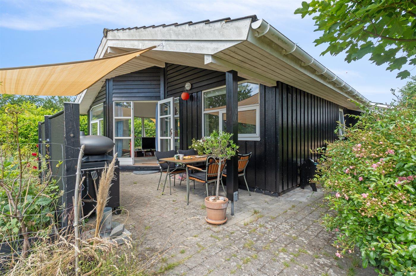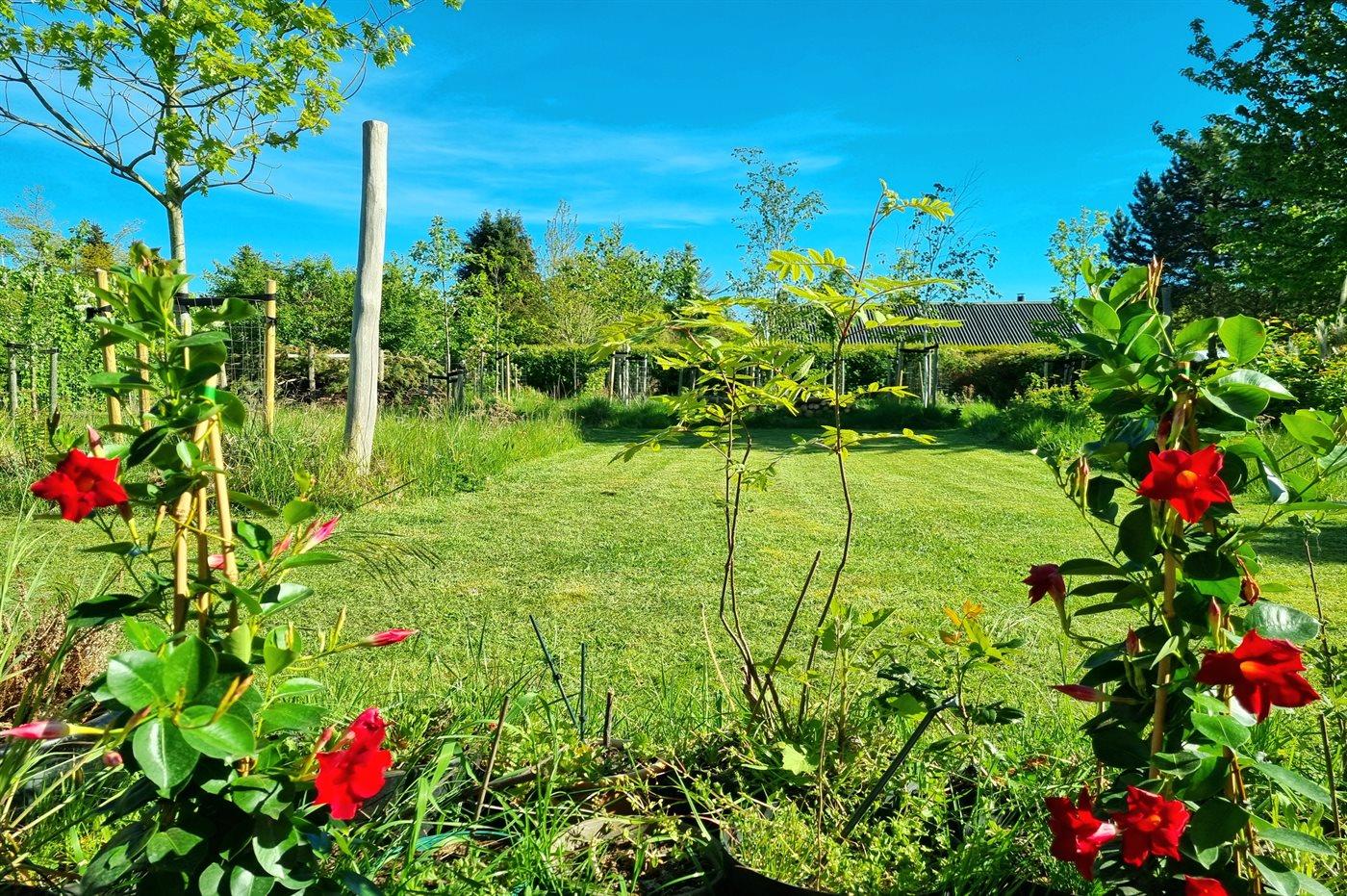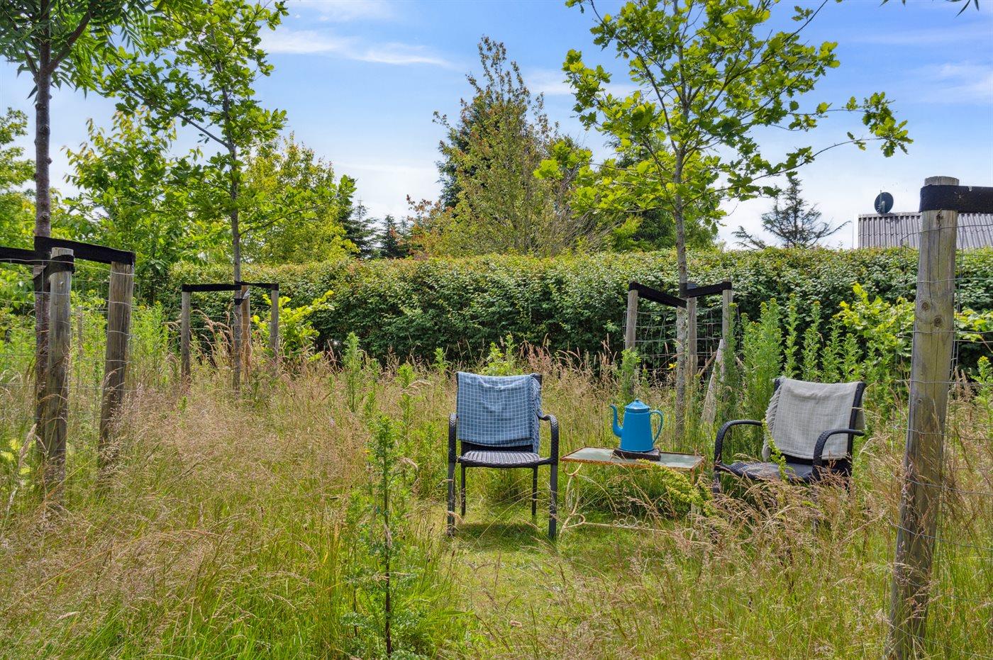 Sommerhus med god beliggenhed ved Lille Kregme med en vild naturhave med træer, solsejle, bålfad og hængekøje.