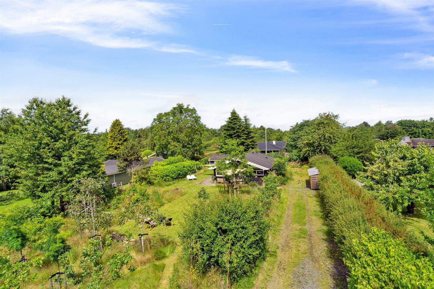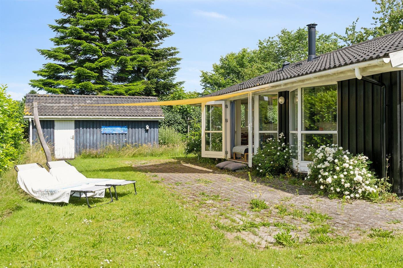 Ferieboligen er beliggende på en 1200 m² stor naturgrund. Der er 9000 m til havet. Der er 600 m til fjorden. Nærmeste forretning er beliggende i en afstand af 500 m. Desuden er der overdækket terrasse. Bålsted. Der er mulighed for at tilberede maden udendørs i udekøkkenet. Grill til rådighed. Parkering ved ferieboligen.