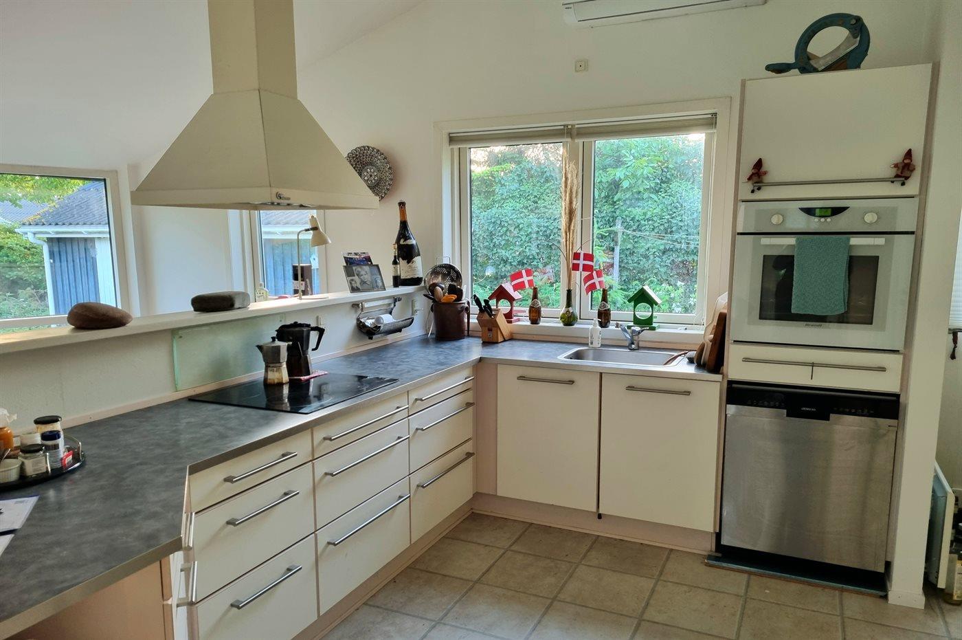 Køkkenet er udstyret med 1 køleskab. Der er 4 keramiske kogeplader, varmluftovn samt opvaskemaskine.