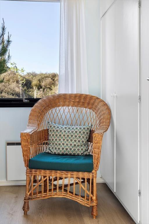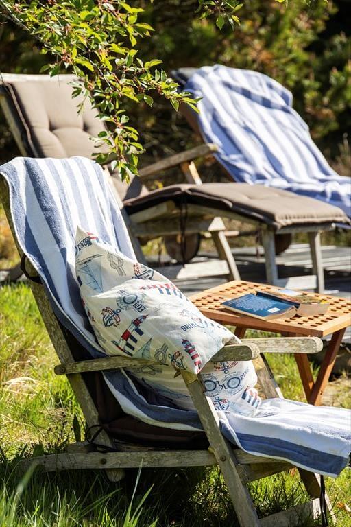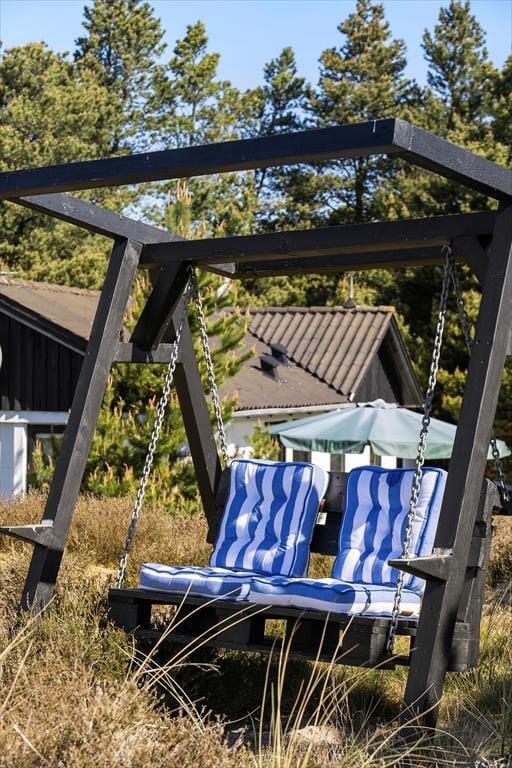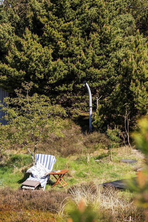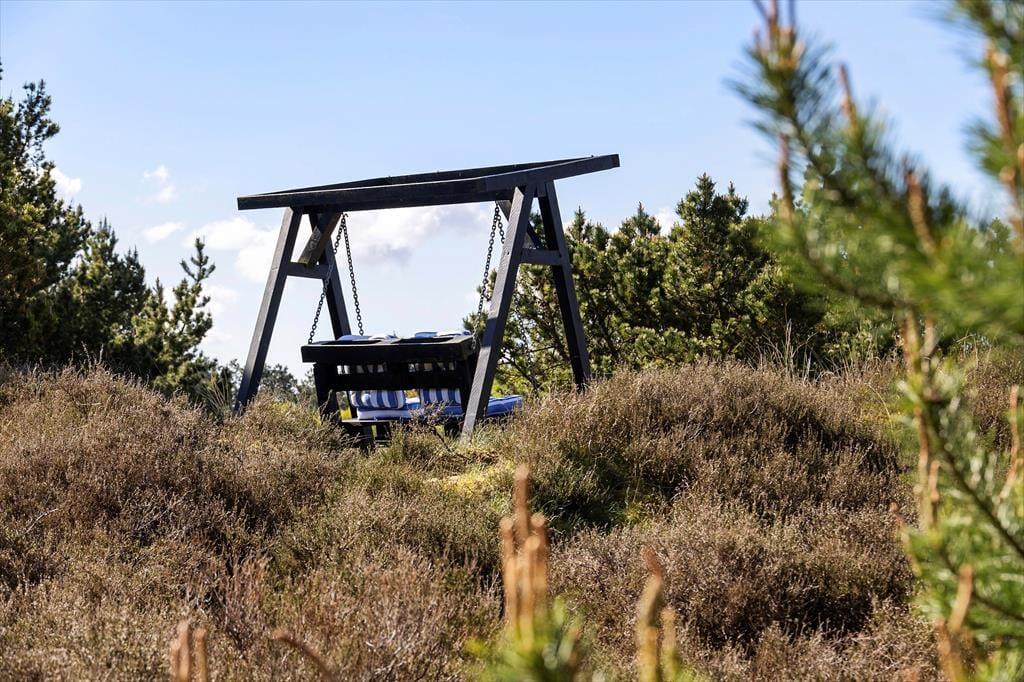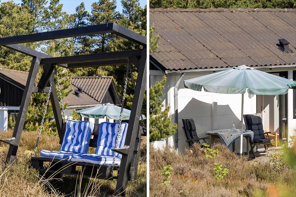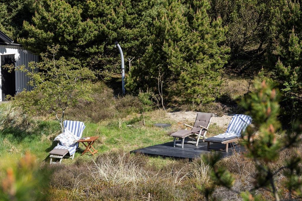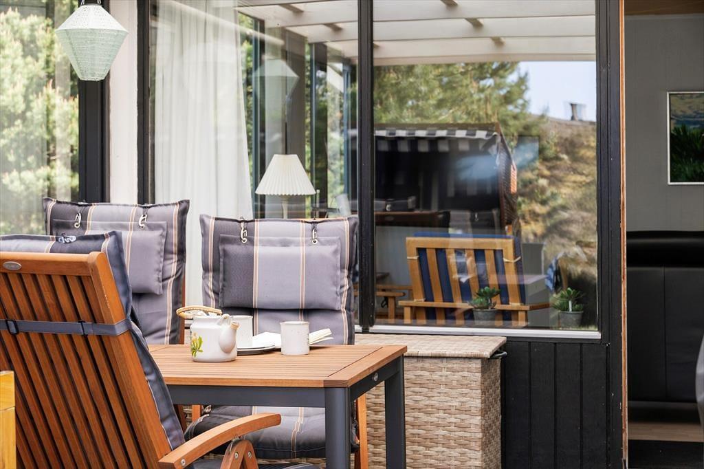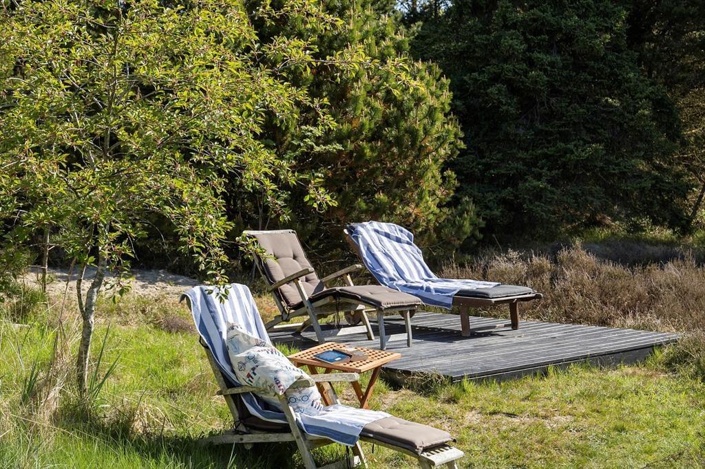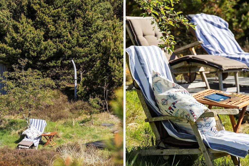 Når solen lokker dig udenfor, kan du nyde livet på sommerhusets læfyldte terrasser. Er det ikke vejr til at sidde helt ude i det fri, kan du slå dig ned på den 25 m² store terrasse, der er overdækket med termotag og udstyret med glasafskærmning mod vest. Det er skønt at sidde her – for eksempel på en solrig forårsdag eller en lys sommeraften. På den store, kuperede naturgrund kan du desuden sætte dig op på bænkene på den lyngklædte top for at nyde udsigten mod Vadehavet.