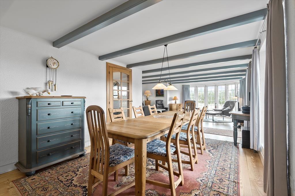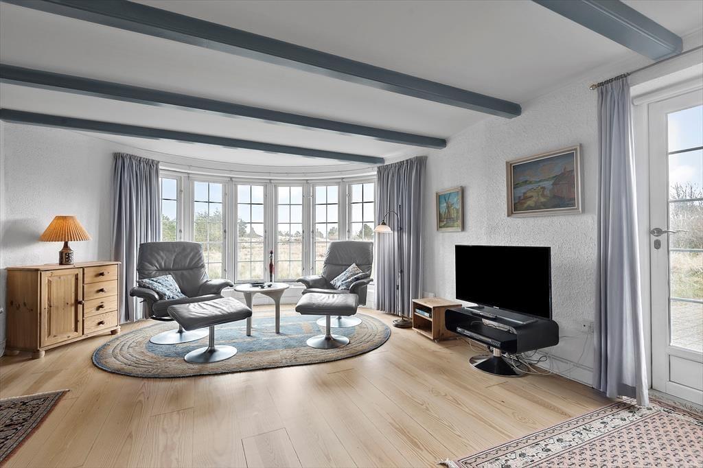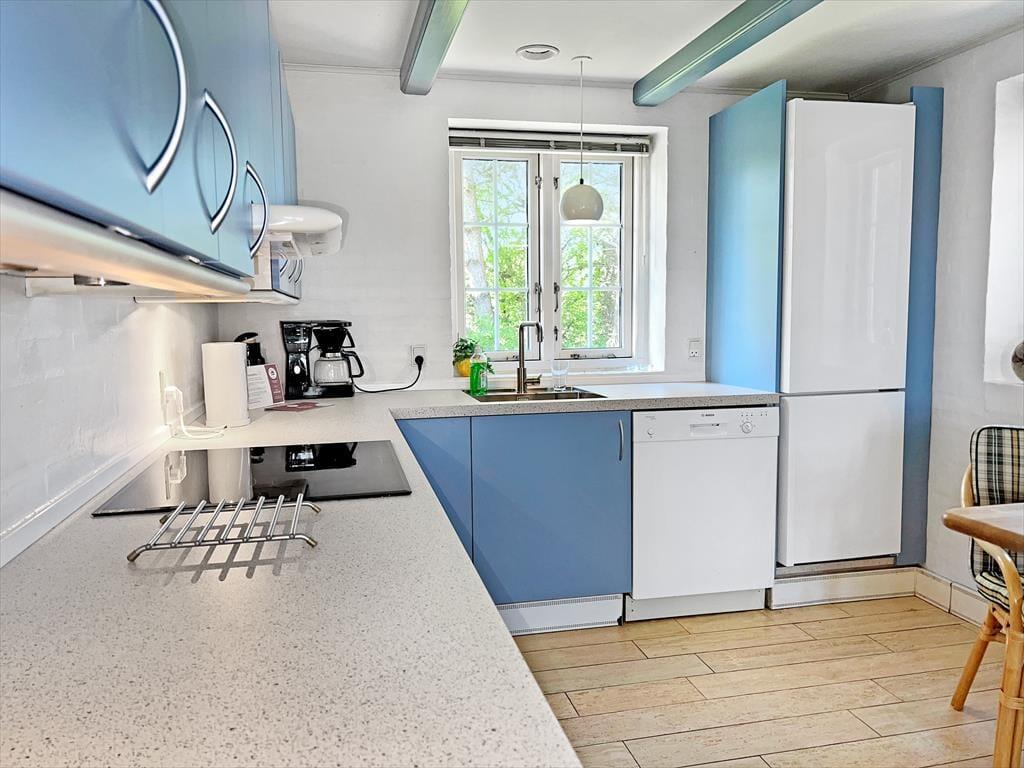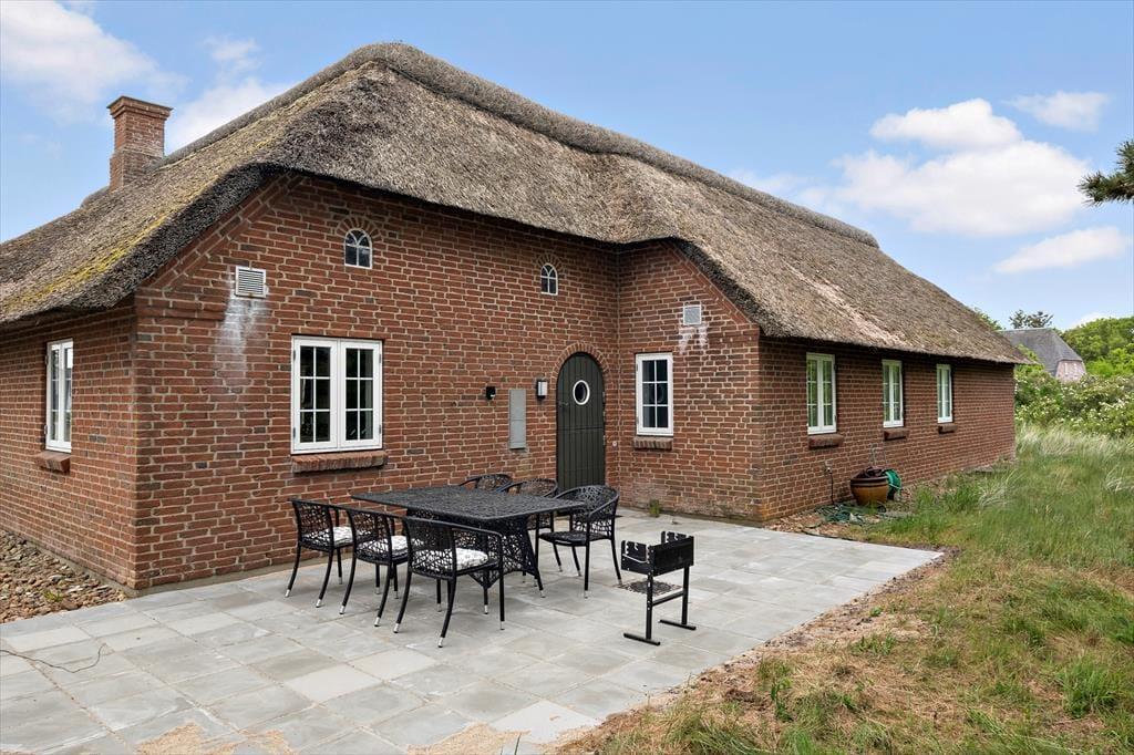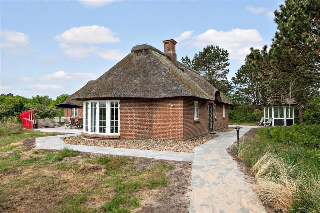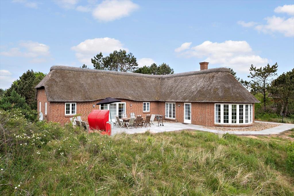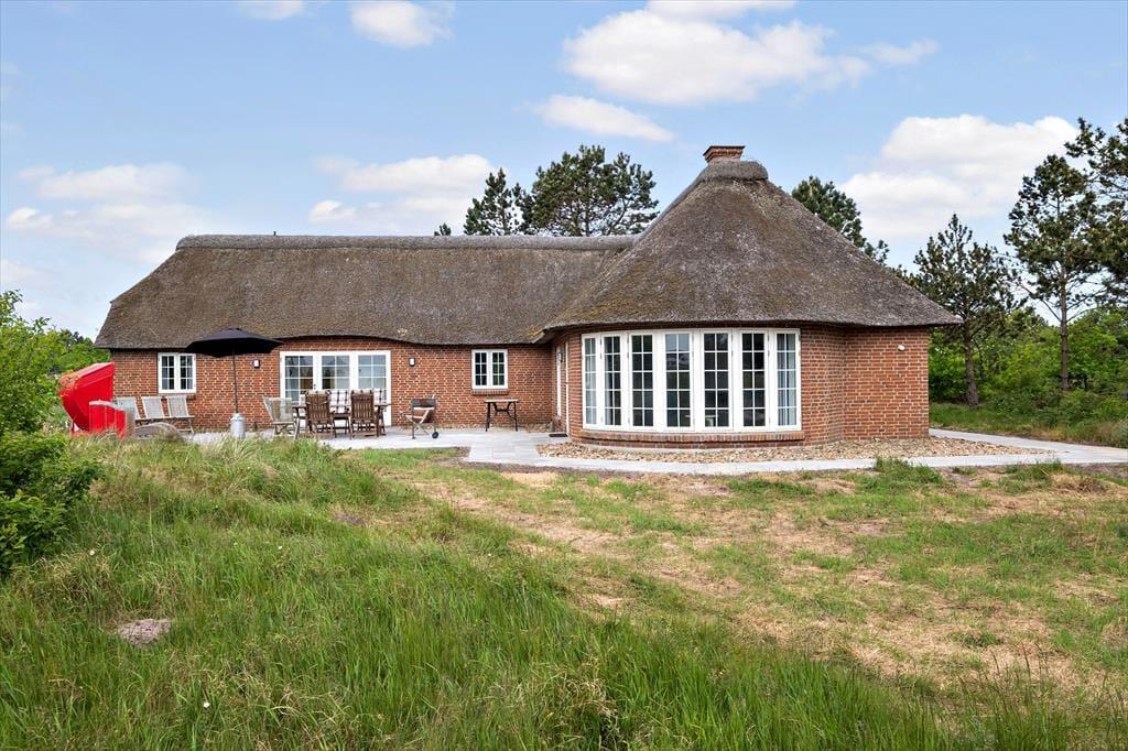 Sommerhuset pynter i de grønne kystomgivelser med sin rødbrune murstensfacade, sine hvide sprossevinduer og sit flotte stråtag. Og inden døre er udtrykket mindst lige så charmerende, for her er der nemlig malede træbjælker i loftet, og møblerne er nøje udvalgt, så de understreger den hyggelige atmosfære i rummene. I alt kan du brede dig på 156 m², der blandt andet er fordelt på tre gode soveværelser med i alt seks sovepladser. Badeværelser er der to af, hvoraf det største på lækker vis er udstyret med spabad og sauna – så du kan sagtens glæde dig til en wellnessaften eller to på ferien. Sommerhusets køkken er lyst, indbydende og veludstyret med blandt andet opvaskemaskine og mikroovn, og der er en lille spiseplads, hvis du foretrækker at drikke morgenkaffen her. Dagens øvrige måltider kan du servere i stuen, der er hyggeligt indrettet med spisebord, bløde siddemøbler, brændeovn og store vinduespartier, der inviterer dagslyset og den fine udsigt indenfor.
