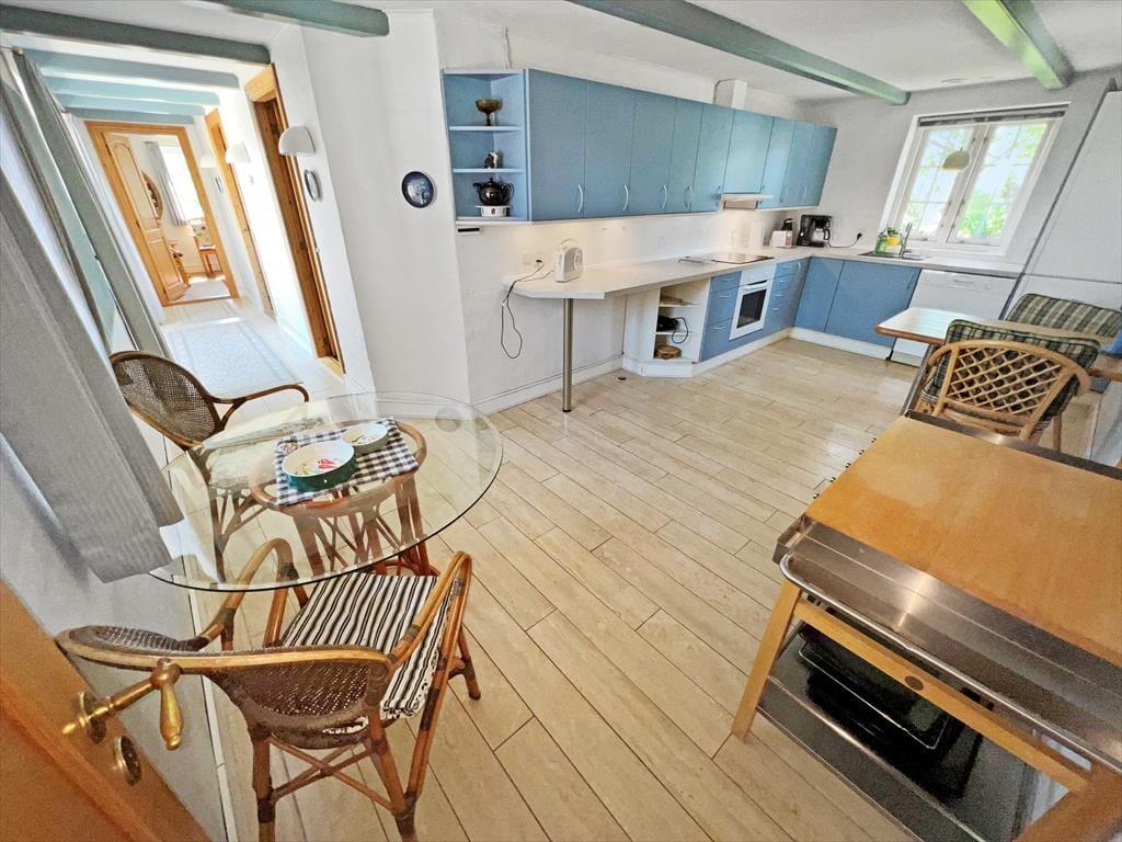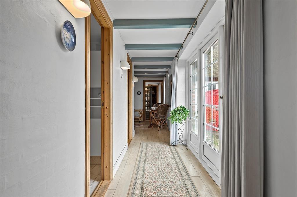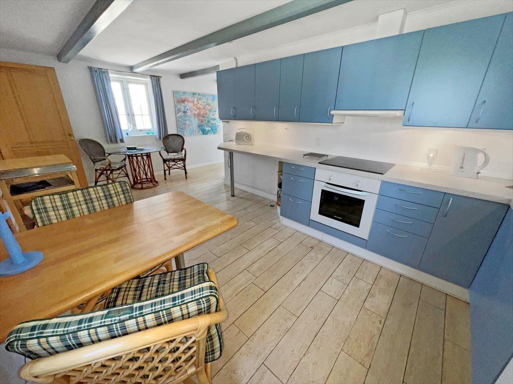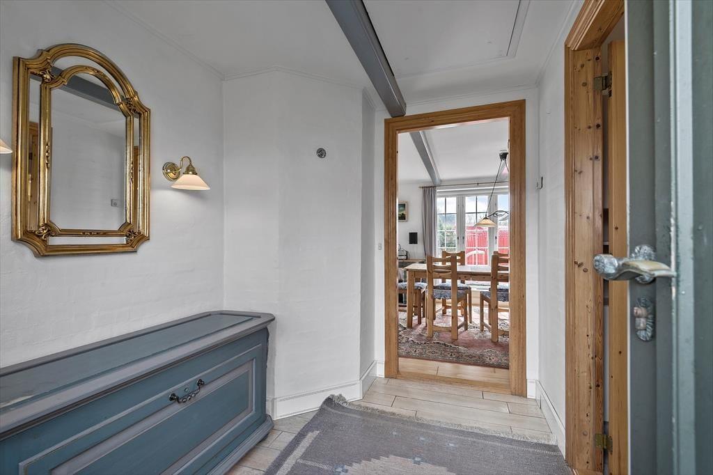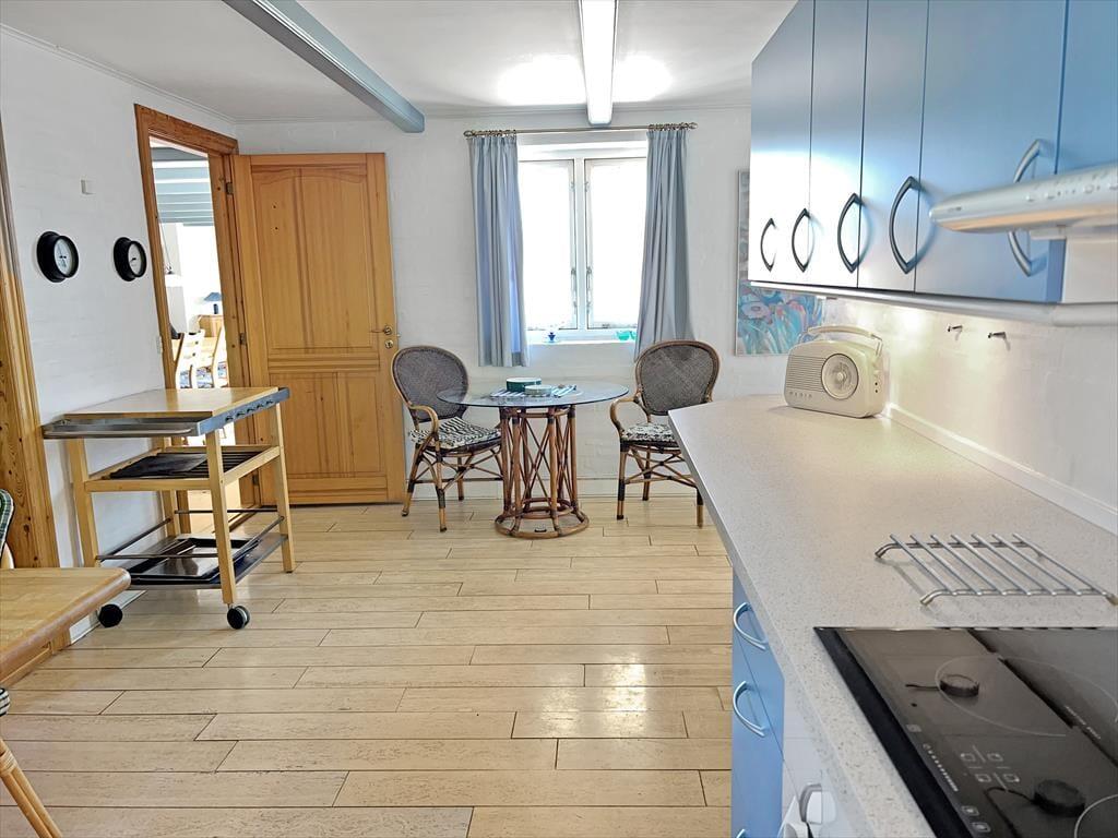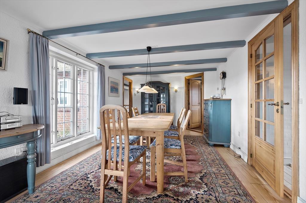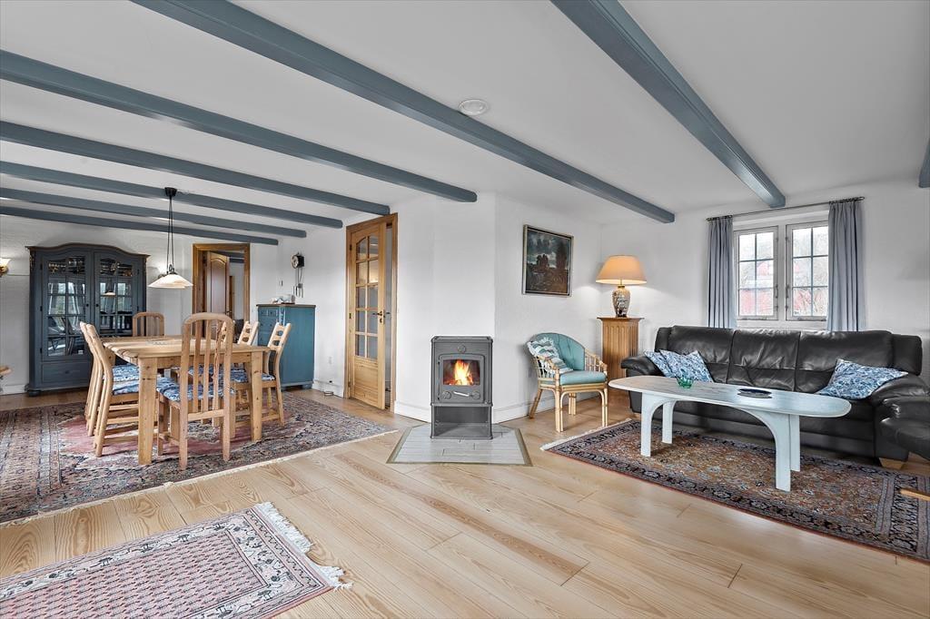 Sommerhuset pynter i de grønne kystomgivelser med sin rødbrune murstensfacade, sine hvide sprossevinduer og sit flotte stråtag. Og inden døre er udtrykket mindst lige så charmerende, for her er der nemlig malede træbjælker i loftet, og møblerne er nøje udvalgt, så de understreger den hyggelige atmosfære i rummene. I alt kan du brede dig på 156 m², der blandt andet er fordelt på tre gode soveværelser med i alt seks sovepladser. Badeværelser er der to af, hvoraf det største på lækker vis er udstyret med spabad og sauna – så du kan sagtens glæde dig til en wellnessaften eller to på ferien. Sommerhusets køkken er lyst, indbydende og veludstyret med blandt andet opvaskemaskine og mikroovn, og der er en lille spiseplads, hvis du foretrækker at drikke morgenkaffen her. Dagens øvrige måltider kan du servere i stuen, der er hyggeligt indrettet med spisebord, bløde siddemøbler, brændeovn og store vinduespartier, der inviterer dagslyset og den fine udsigt indenfor.