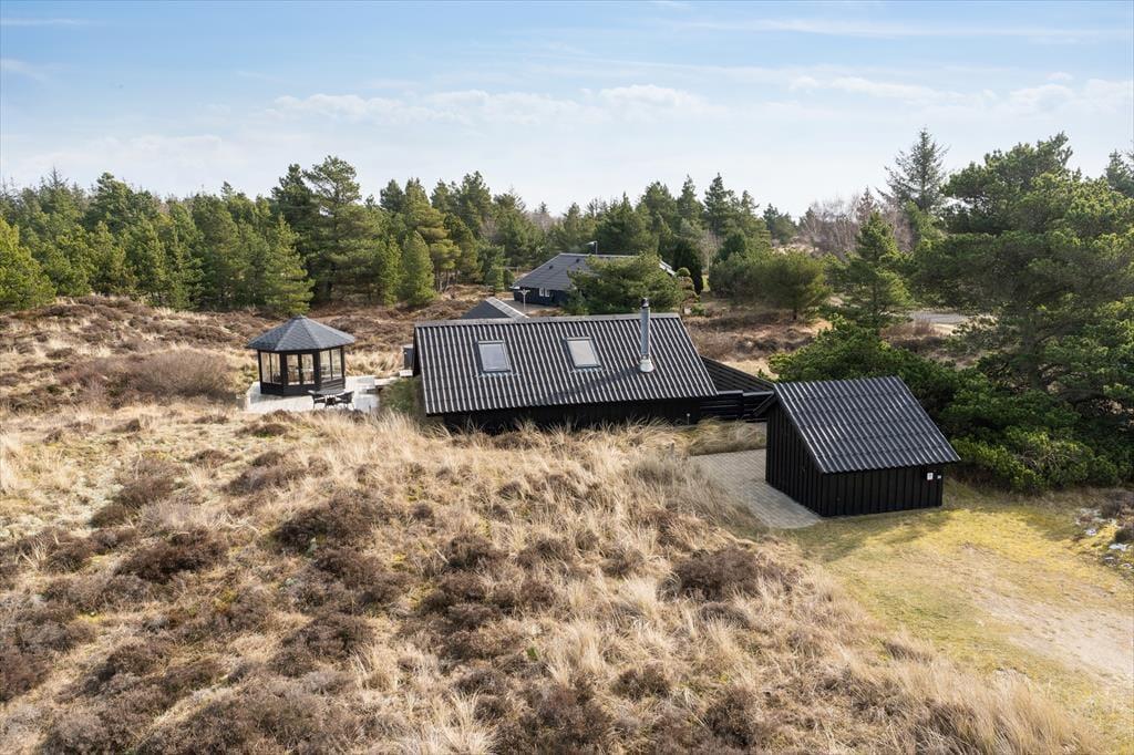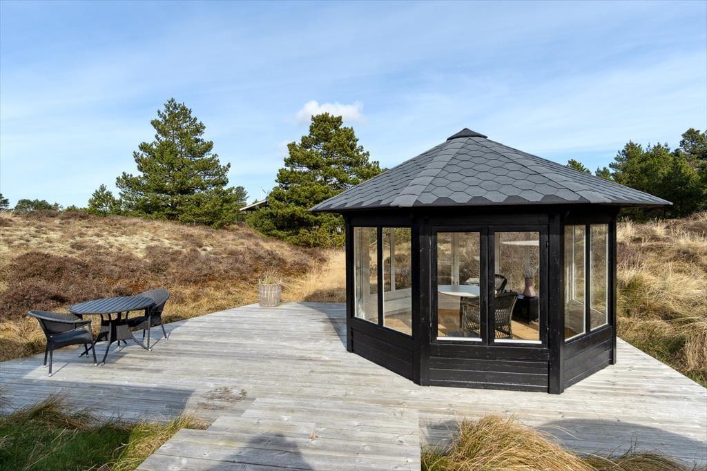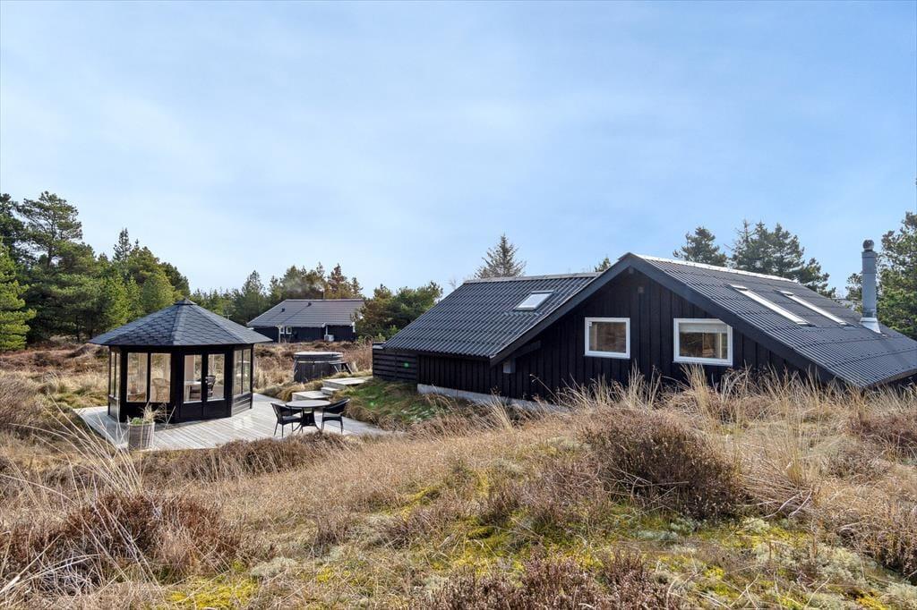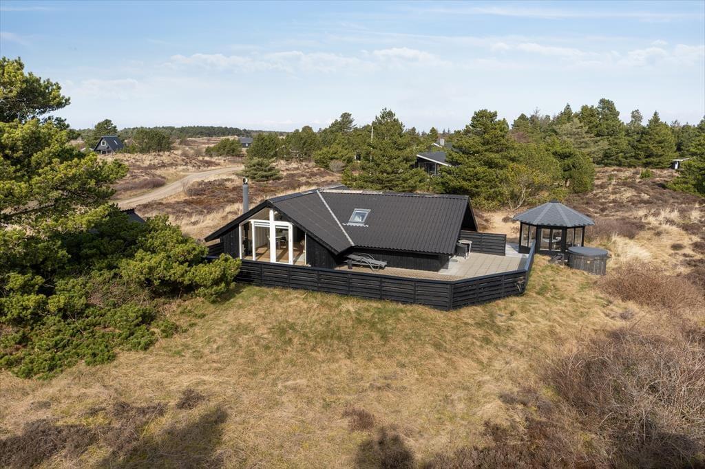 Det er ikke kun på de allervarmeste feriedage, at du kan få stor glæde af sommerhusets udearealer, for udover et lækkert terrassemiljø står der både et vildmarksbad og en opvarmet pavillon på den 3000 m² store grund. De er på hver sin måde med til at forsøde ferielivet: Skinner forårssolen, kan du rykke ud i pavillonen med en god kop kaffe, og hen over sommeren kan du nærmest leve herude med fri udsigt til den lyngklædte naturgrund. Og om aftenen, når stjernerne begynder at titte frem på himlen, føles det helt magisk at sidde i det varme vildmarksbad.
