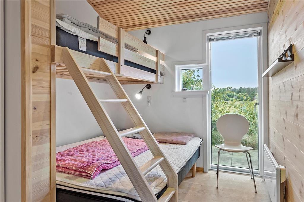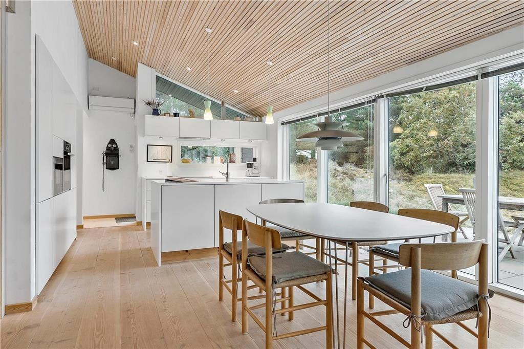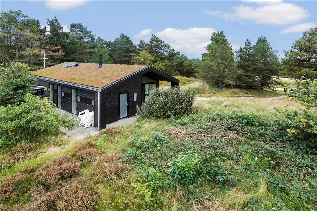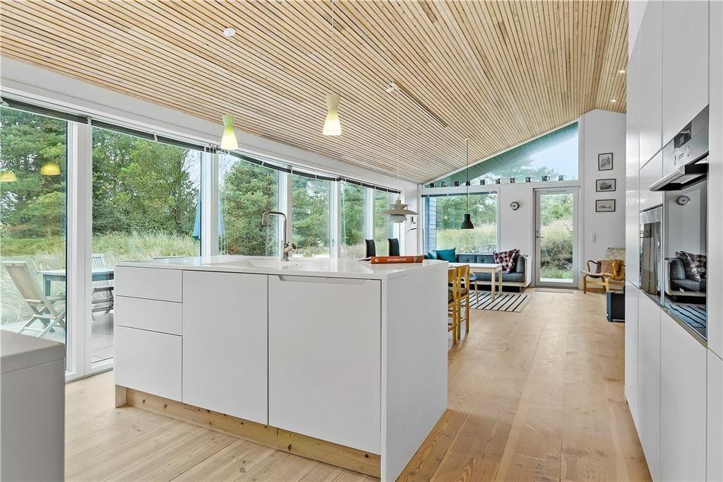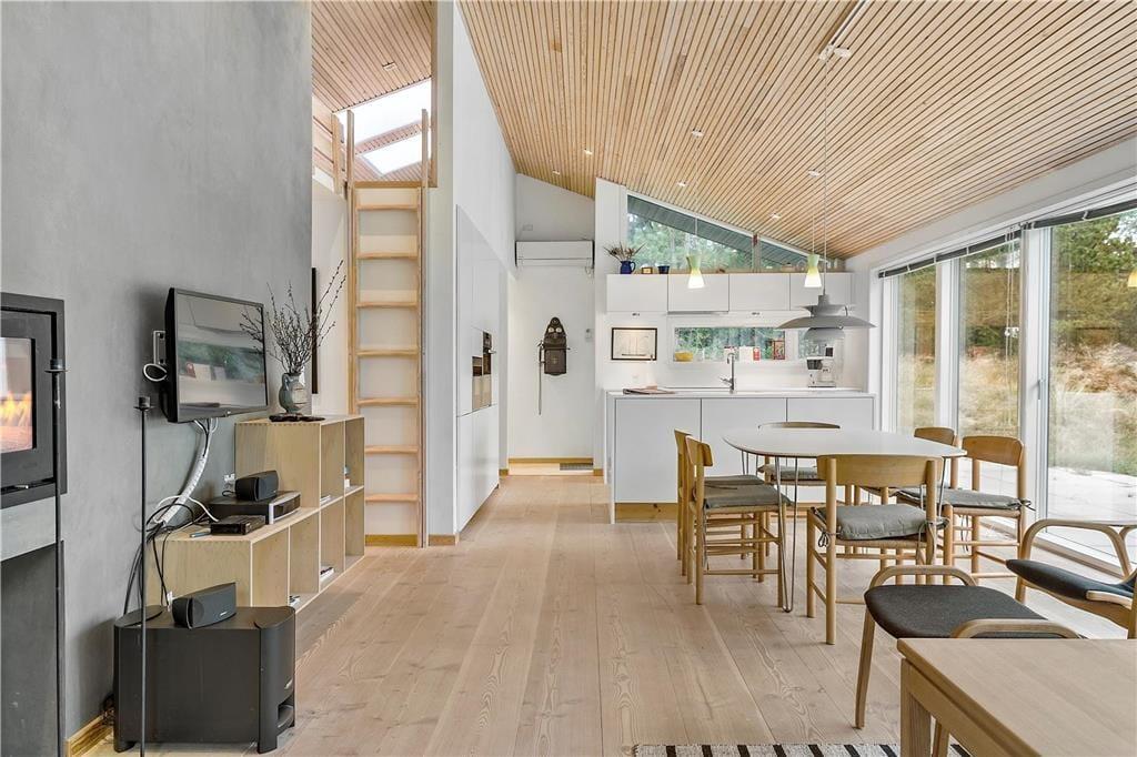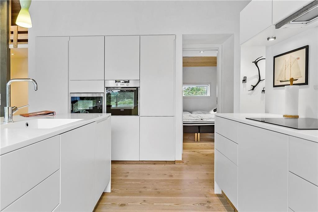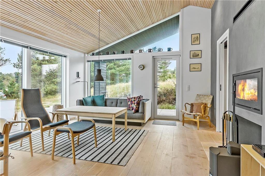 Da sommerhuset blev opført i 2017, blev der taget hensyn til miljøet. Der er nemlig tale om et økologisk byggeri med grønt miljøtag, og takket være god isolering og en effektiv varmepumpe er energiforbruget lavt. Og som et vaskeægte kvalitetshus er der samtidig tænkt over, at alle rum er skønne og stemningsfulde: Den stilfulde indretning byder blandt andet på brede Douglas-plankegulve i opholdsafdelingen og på de tre rummelige soveværelser. Højisolerede panoramavinduer pryder endvidere stuen, og en indbygningspejs er klar til at sprede hygge og varme på kølige dage. Det åbne køkken er elegant og veludstyret med alskens hvidevarer – og selv badeværelset er smukt, for det er beklædt med travertin og udstyret med både rainshower og et nedsænket badekar.