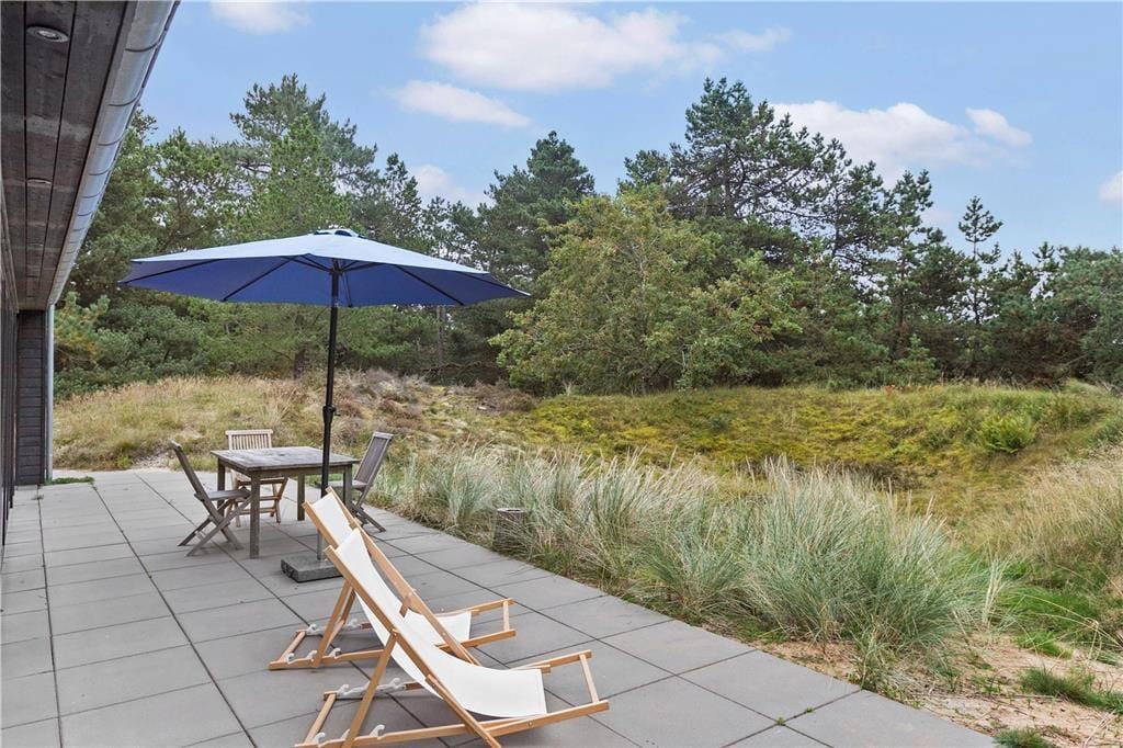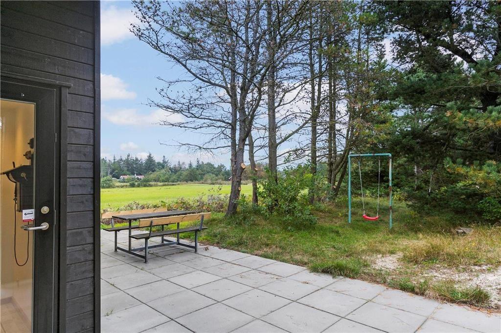Et stort, solrigt og delvist overdækket terrassemiljø er godt integreret med sommerhuset, for fra alle rum kan du træde direkte ud i det fri. Det er med andre ord særdeles nemt at smutte udenfor, når det gode sommervejr indbyder til grillmiddage, solbadning og komplet afslapning. Til de yngste er der gynger, og der er også en udendørs bruser, hvis du trænger til at blive frisket op. Mod syd sørger naturgrundens beplantning for privatliv og læ, og mod nord kan du nyde den fine udsigt over det åbne marklandskab.