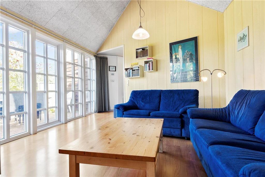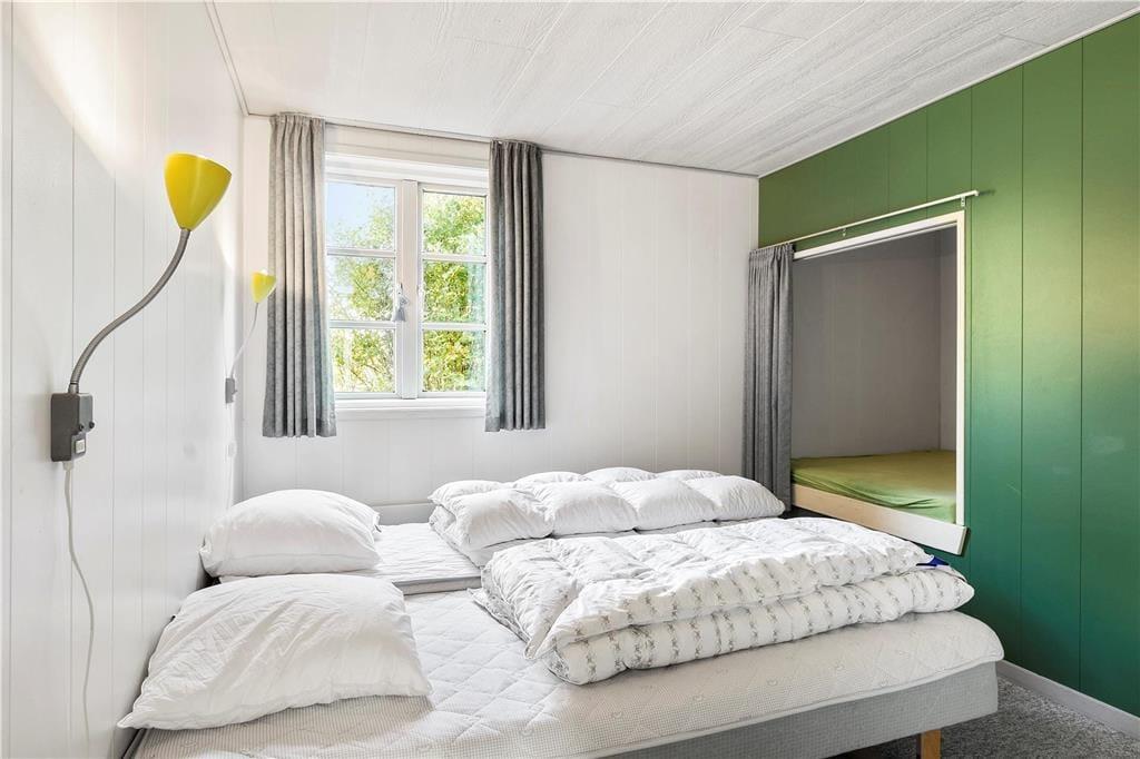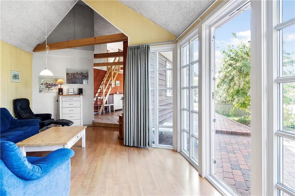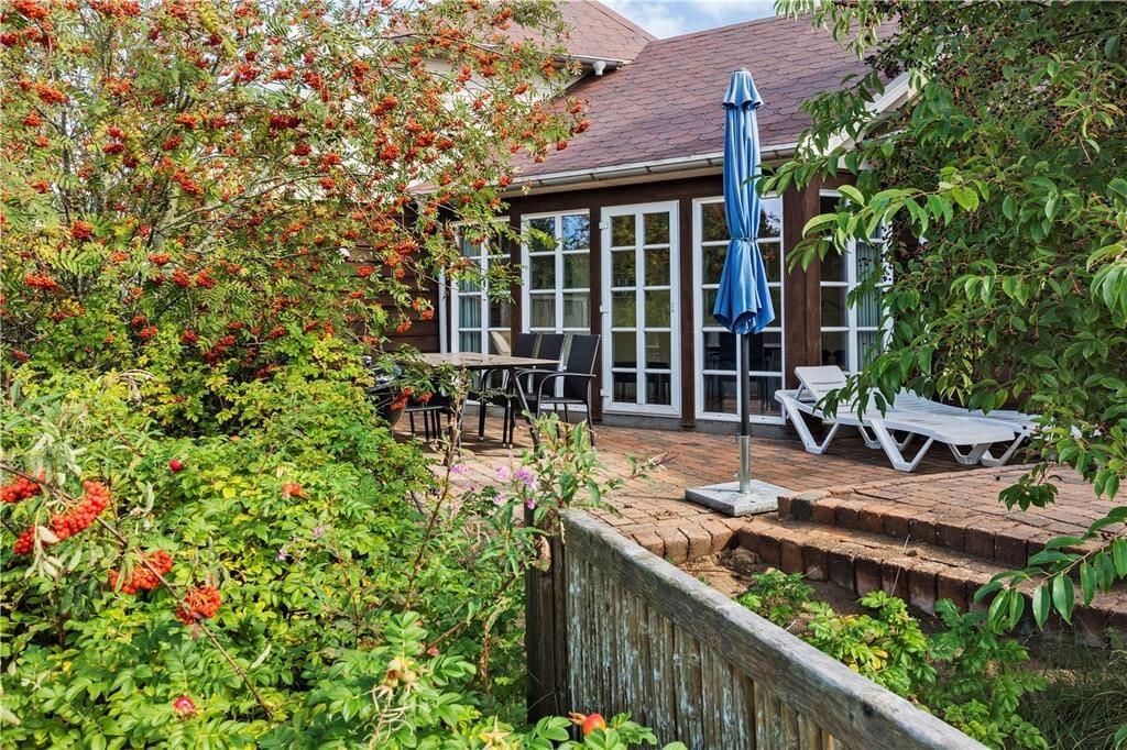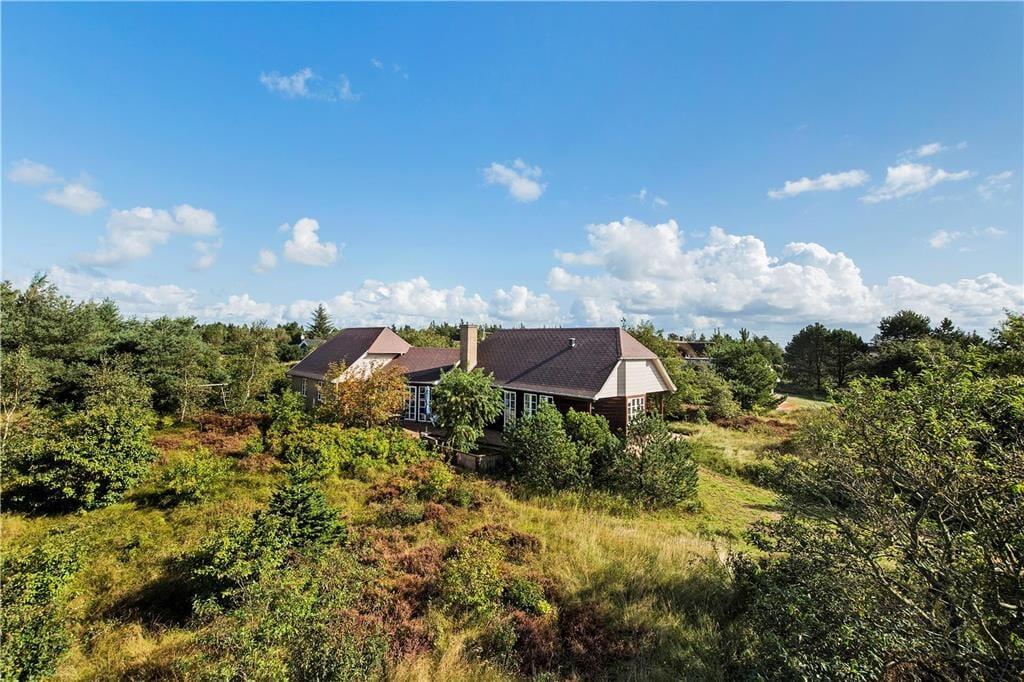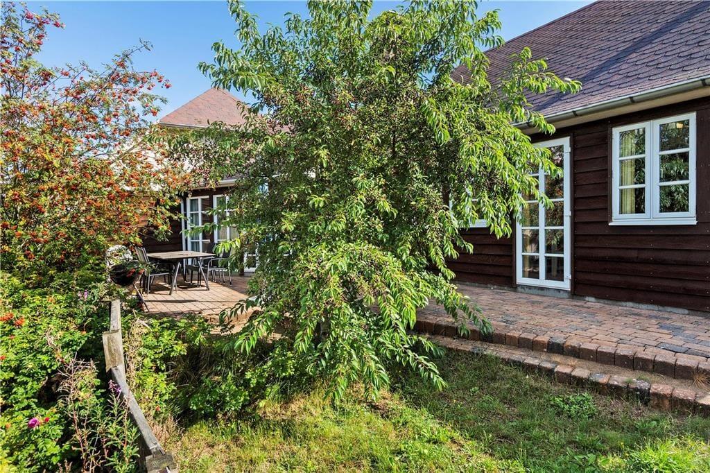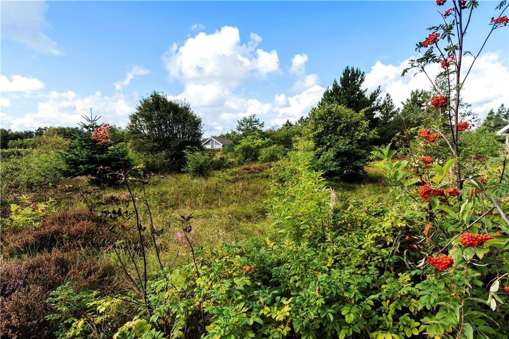 Sommerhuset ligger på en dejligt stor naturgrund, hvor træer, buske og lilla lyng får lov til at vokse frit. Til de yngste familiemedlemmer er der både sandkasse og gynge på grunden, mens hele familien kan nyde godt af det indbydende terrassemiljø, der er delvist overdækket og ugeneret takket være træer og plankeværk.