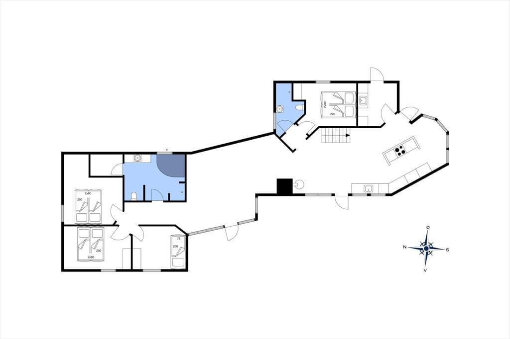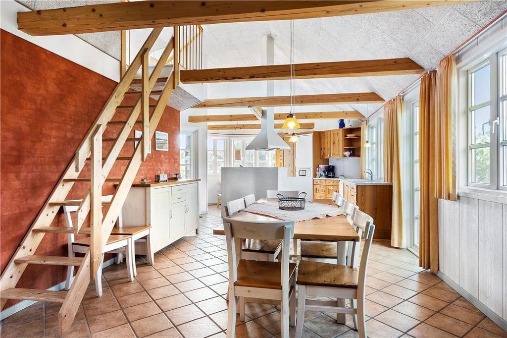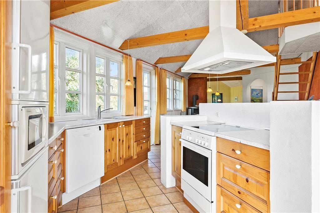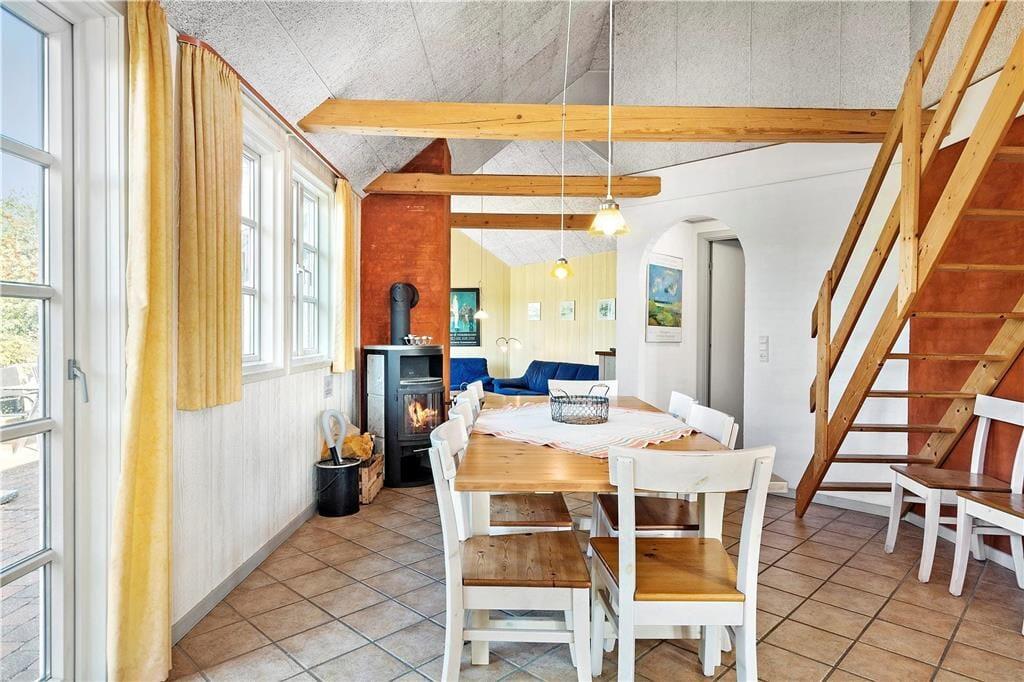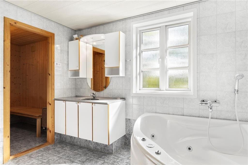 Lyset strømmer ind gennem stuens store sprossevinduer, der samtidig åbenbarer udsigten til grundens grønne beplantning. Både lysindfald og udsigt bidrager til den behagelige atmosfære inden døre, der også påvirkes positivt af opholdsrummets gode loftshøjde og pæne møblement. Stuen ligger i åben forbindelse med et lyst og indbydende køkken-alrum, og midt i det hele står en brændeovn klar til at sprede hygge og varme, hvis det er koldt udenfor. En blæsende efterårsdag er det skønt at slappe af med et spabad og en tur i saunaen – for eksempel efter en gåtur langs Rømøs østkyst. Både spa og sauna er at finde på det ene af husets to badeværelser, der begge er udstyret med gulvvarme og bruseniche. Et bryggers med vaskesøjle hører også med til planløsningen foruden fire gode soveværelser med i alt syv sengepladser.