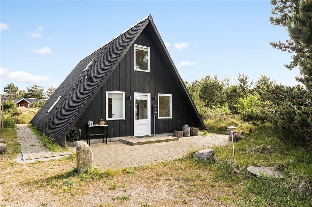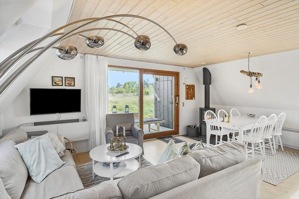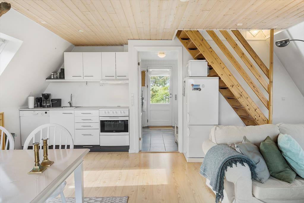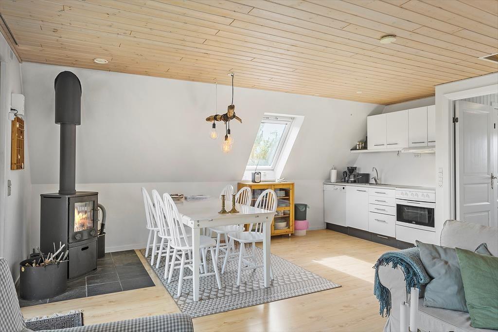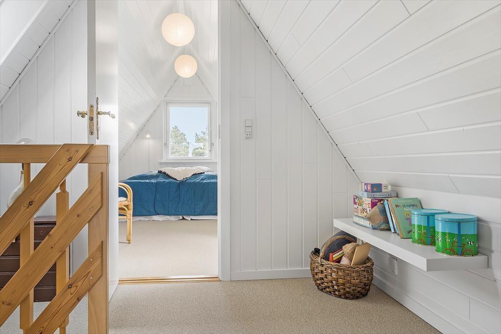 Sommerhuset er et klassisk A-hus, hvis tagflade går helt ned til jorden. Den karakteristiske arkitektur har også betydning for sommerhusets indretning, for de skrå vægge giver rummene et charmerende udtryk og er med til at understrege hyggestemningen inden døre. Der er for øvrigt vinduer på skråvæggene såvel som i gavlen, så inden døre kan I nyde det gode lysindfald og udsigten til de grønne omgivelser. Størstedelen af stueplan er dedikeret til en dejlig stue med integreret køkkenafdeling, hvor alt lige fra madlavning og måltider til sofaafslapning nær brændeovnen kommer til at foregå. Et soveværelse med dobbeltseng og et pænt badeværelse med vaskemaskine ligger også i stueplan, mens førstesalen byder på yderligere to soveværelser.