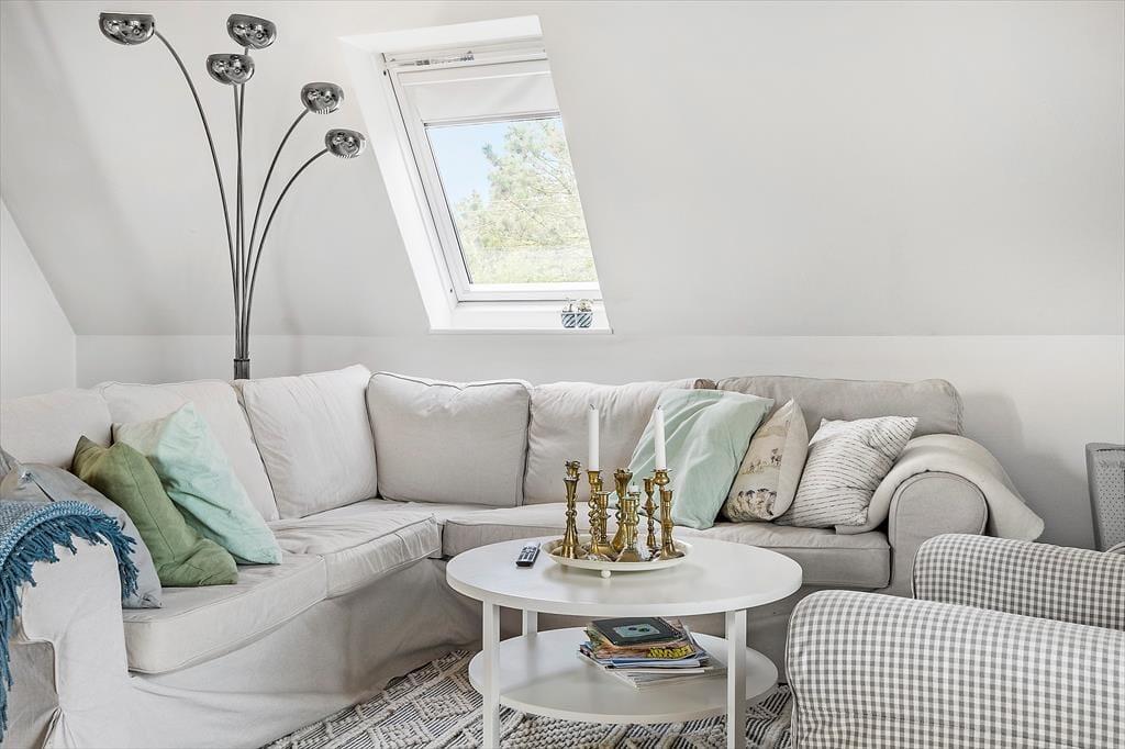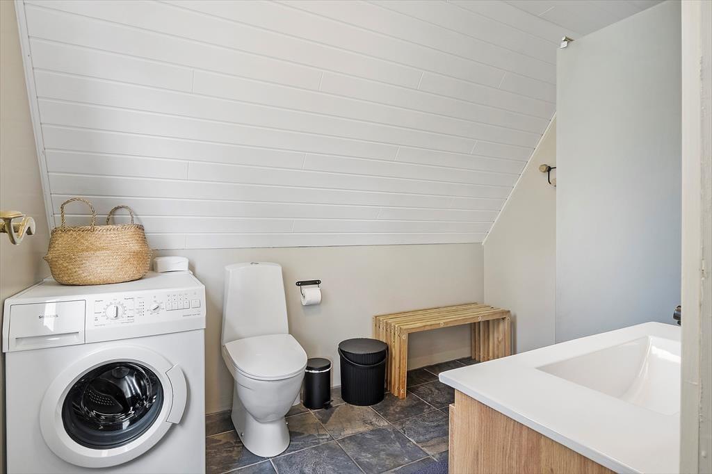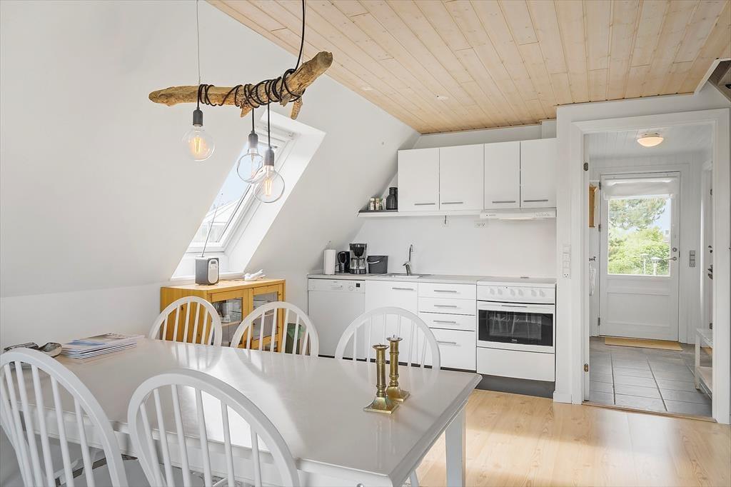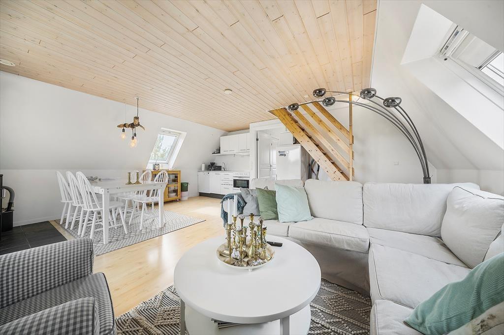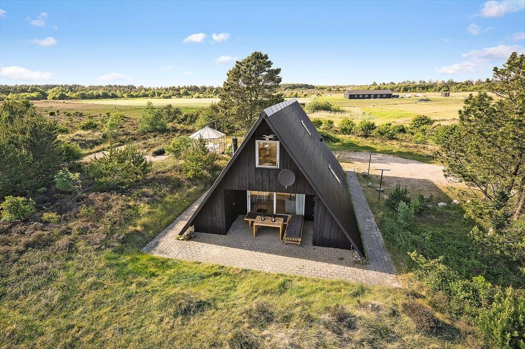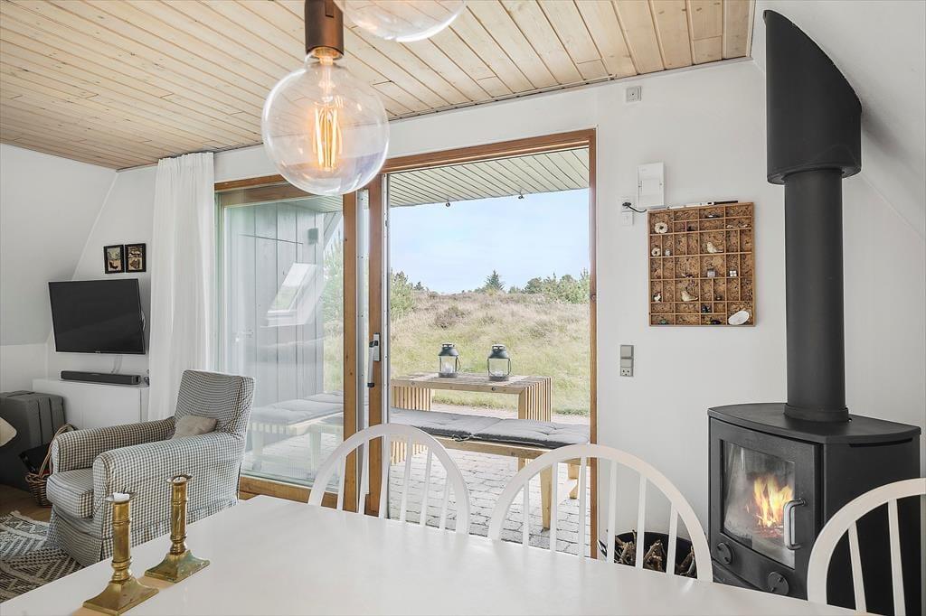 Sommerhuset er et klassisk A-hus, hvis tagflade går helt ned til jorden. Den karakteristiske arkitektur har også betydning for sommerhusets indretning, for de skrå vægge giver rummene et charmerende udtryk og er med til at understrege hyggestemningen inden døre. Der er for øvrigt vinduer på skråvæggene såvel som i gavlen, så inden døre kan I nyde det gode lysindfald og udsigten til de grønne omgivelser. Størstedelen af stueplan er dedikeret til en dejlig stue med integreret køkkenafdeling, hvor alt lige fra madlavning og måltider til sofaafslapning nær brændeovnen kommer til at foregå. Et soveværelse med dobbeltseng og et pænt badeværelse med vaskemaskine ligger også i stueplan, mens førstesalen byder på yderligere to soveværelser.