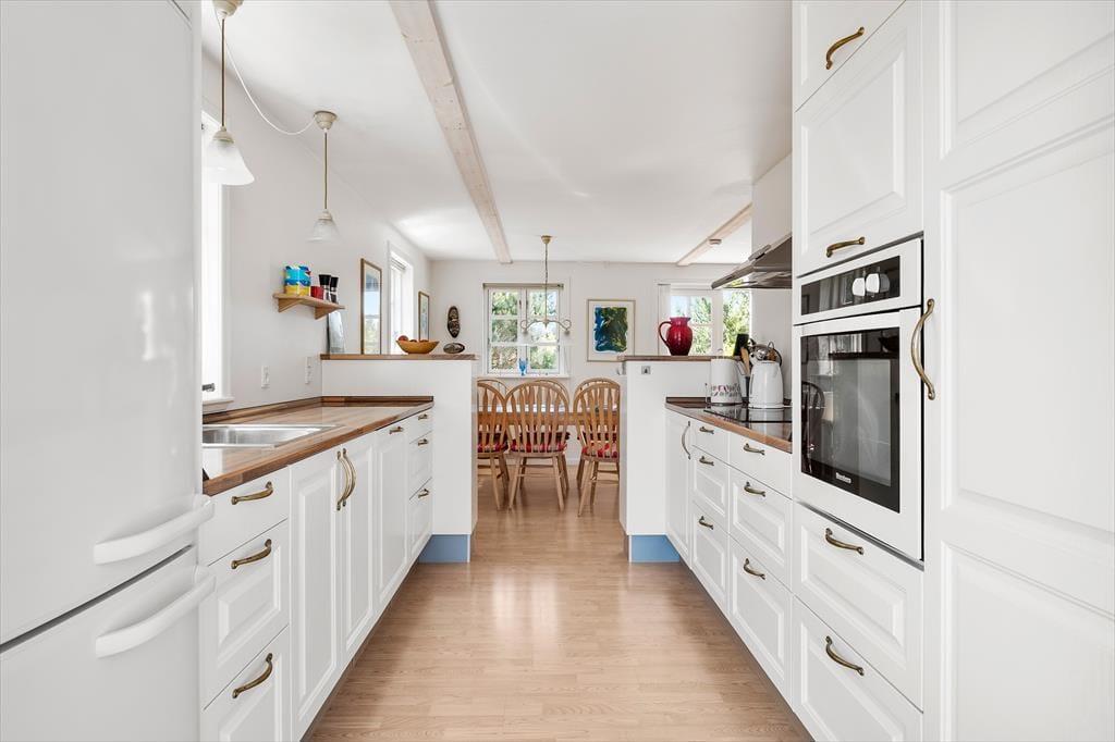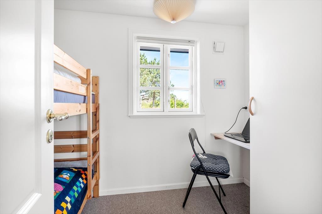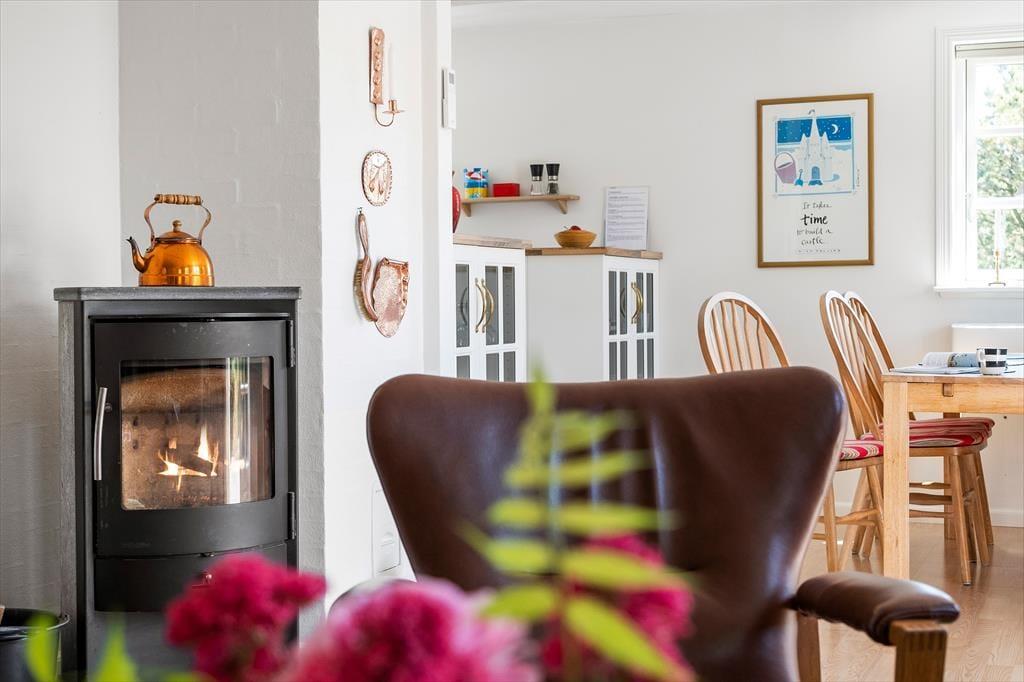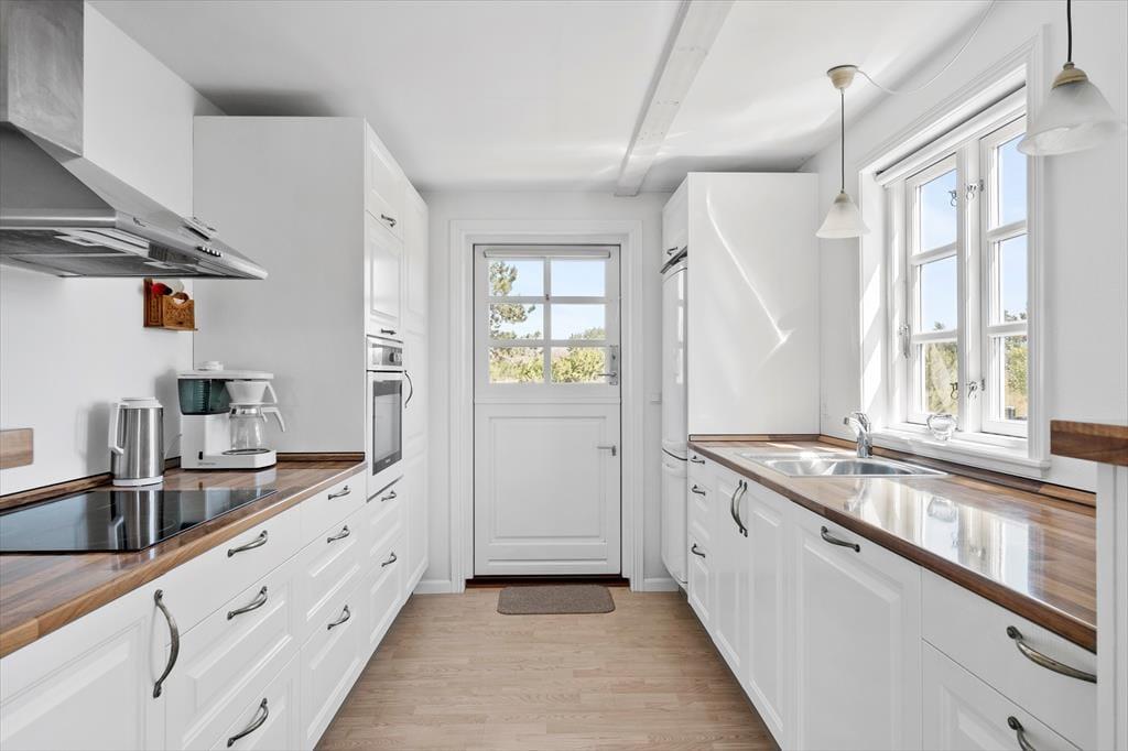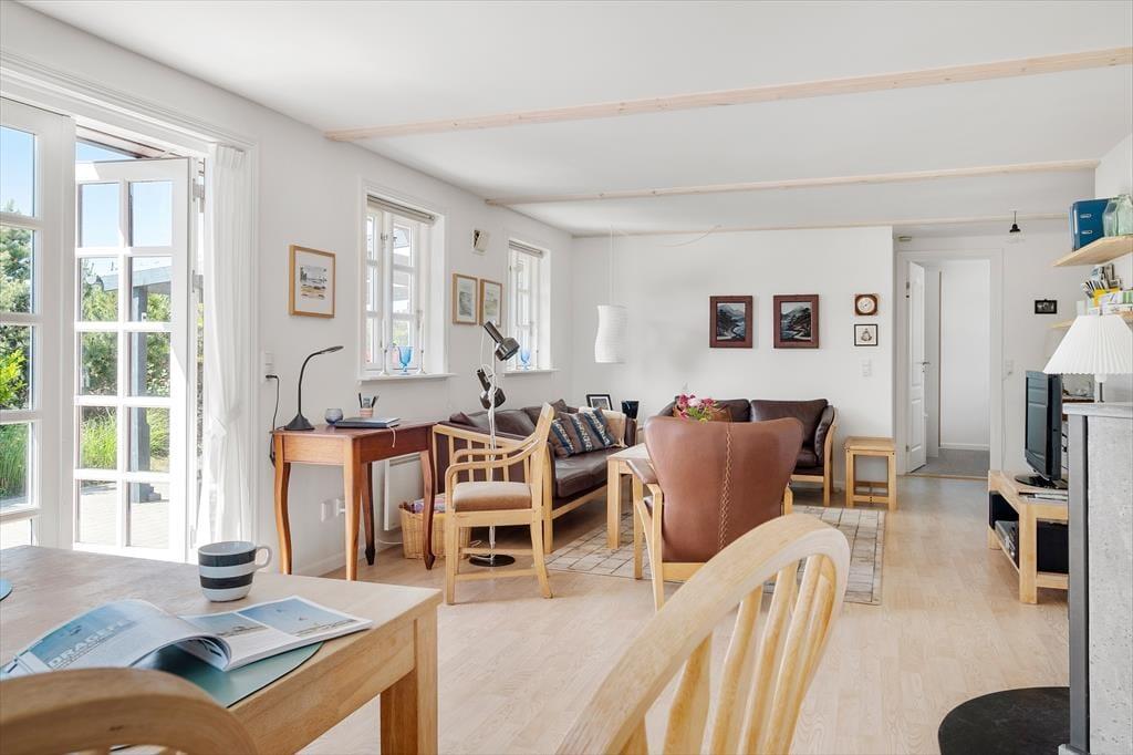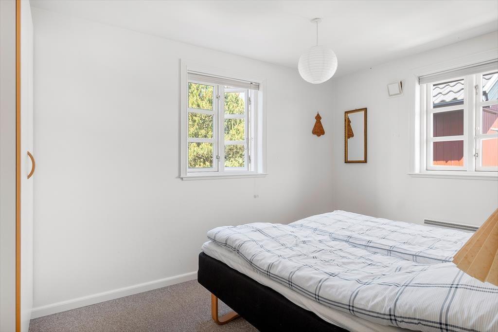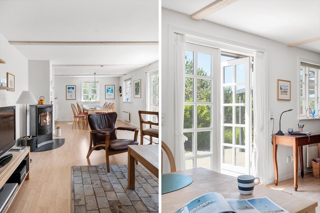 Sommerhusets rødmalede træfacade giver en flot kontrast til de grønne naturomgivelser, og inden døre er atmosfæren lys og let med hvid som gennemgående farve. Planløsningen passer godt til seks personer, for der er tre gode soveværelser, hvoraf to er med dobbeltseng, og det tredje med køjeseng. Ved entréen ligger badeværelset, der byder på en bruseniche, vaskemaskine og gulvvarme, og endelig er køkken og stue forenet, så de tilsammen fungerer som et herligt opholdsrum med god plads til feriens måltider, afslapning og sociale stunder. Centralt i rummet står en brændeovn, og med tv, radio og wi-fi-forbindelse har du mulighed for at hygge dig med film, musik og anden digital underholdning.