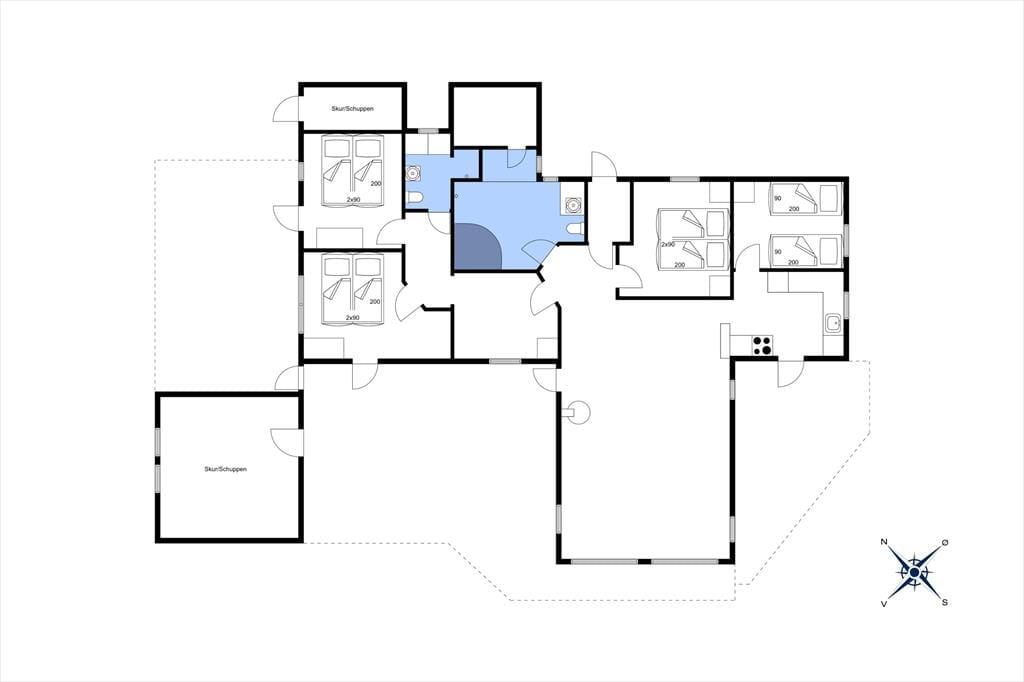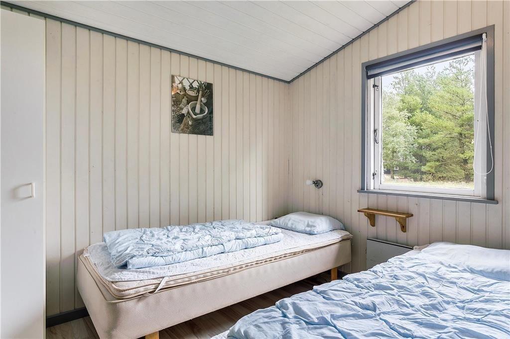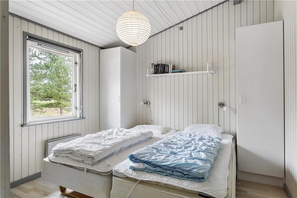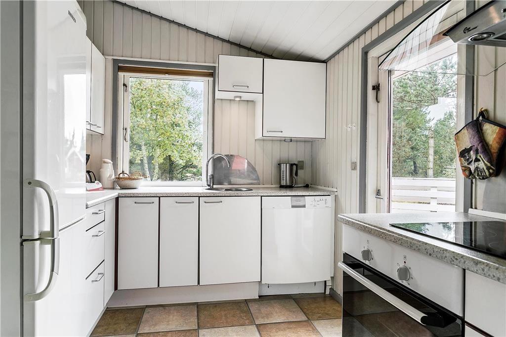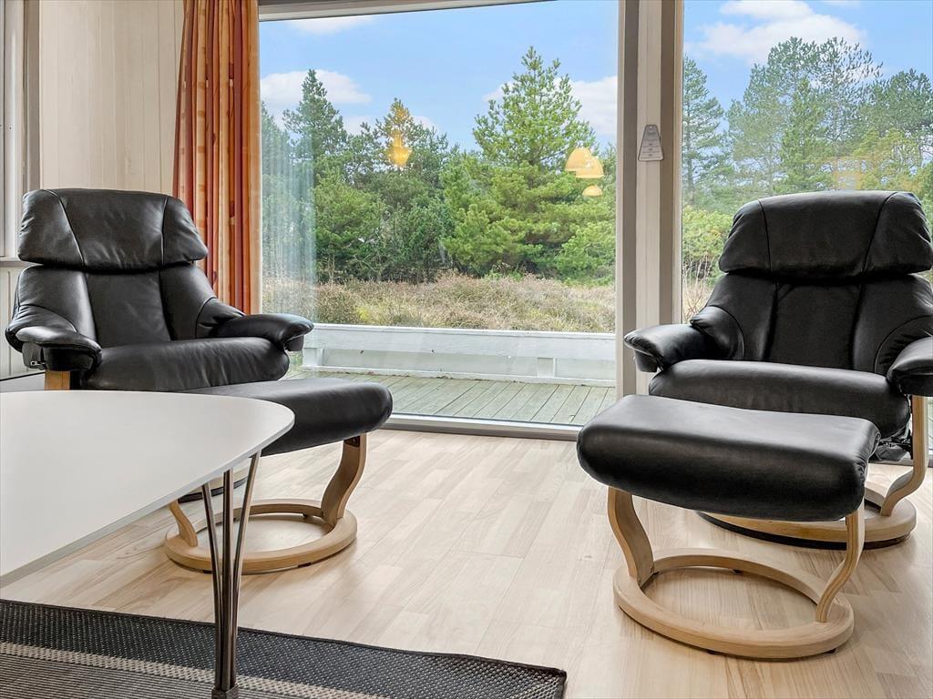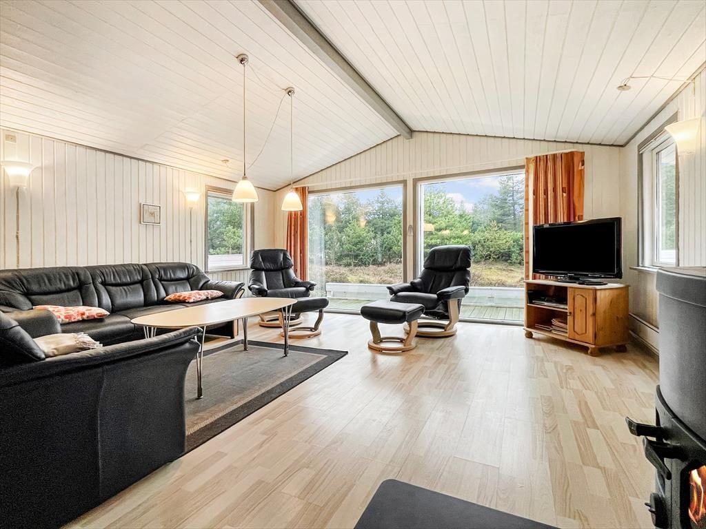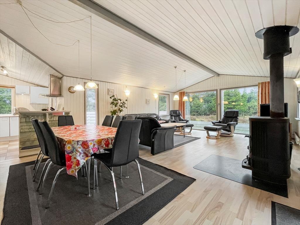 Du har udsigt til lilla lyng og grønne fyrretræer, når du hygger dig inden døre i sommerhuset – ikke mindst i stuen, hvor store vinduespartier inviterer de flotte naturomgivelser og sollyset indenfor. I stuen er en brændeovn med til at skrue op for den hyggelige stemning, og der er desuden varmepumpe, hvis vejret er køligt. Et flot køkken er integreret med stuen, så selvom der skal laves mad, kan du stadig følge med i ferieaktiviteterne, der foregår omkring spisebordet eller i sofaafdelingen. Inden døre i sommerhuset er der hele 125 m² at gøre godt med, så foruden opholdsafdelingen kan du brede dig på fire gode soveværelser og to badeværelser, hvoraf det ene er udstyret med sauna og spabad til to personer.