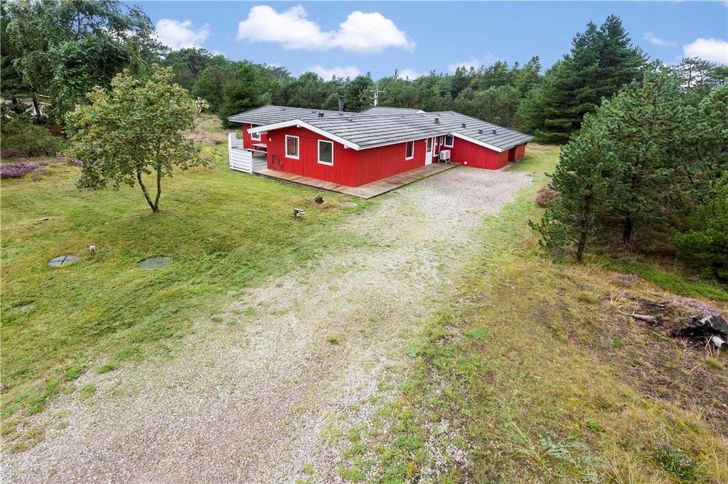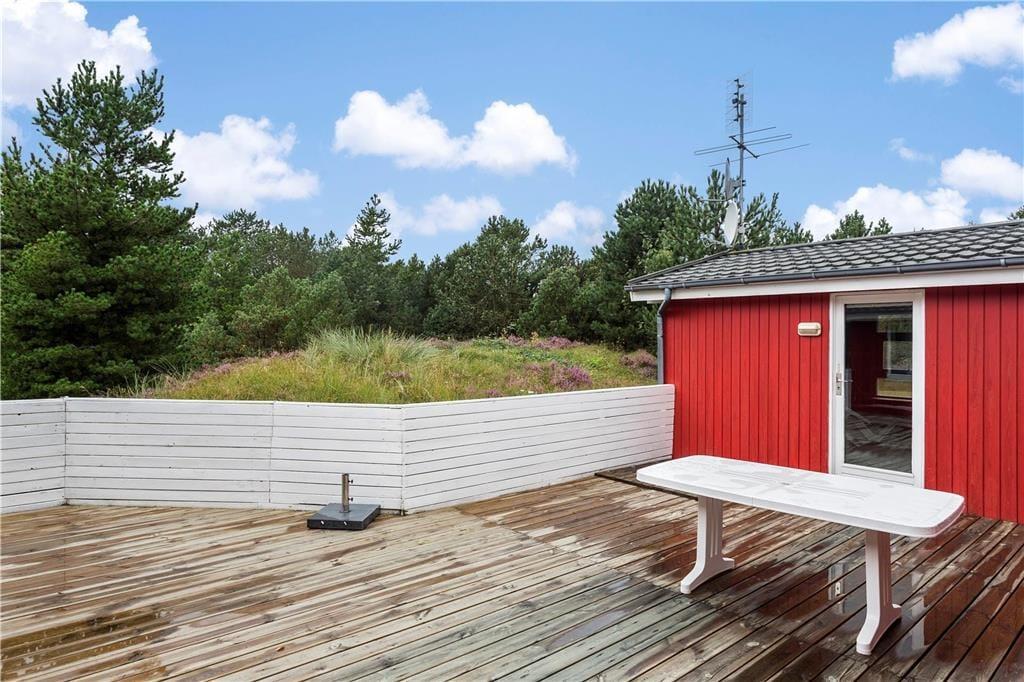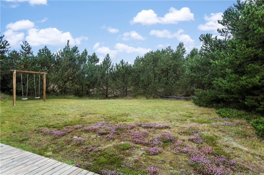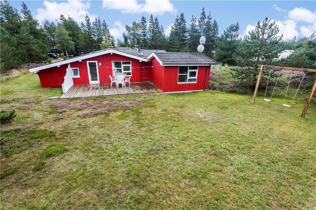 Tre terrasseområder ligger ved sommerhuset, så der er flere valgmuligheder, når du vil finde en solrig opholdsplads. En af terrasserne er helt lukket, hvilket hundeejere formentlig vil sætte pris på. På den 2640 m² store grund er der et areal med græsplæne, sandkasse og gynger, hvor du kan lege og boltre dig, og derudover får den naturlige beplantning lov til at vokse frit.