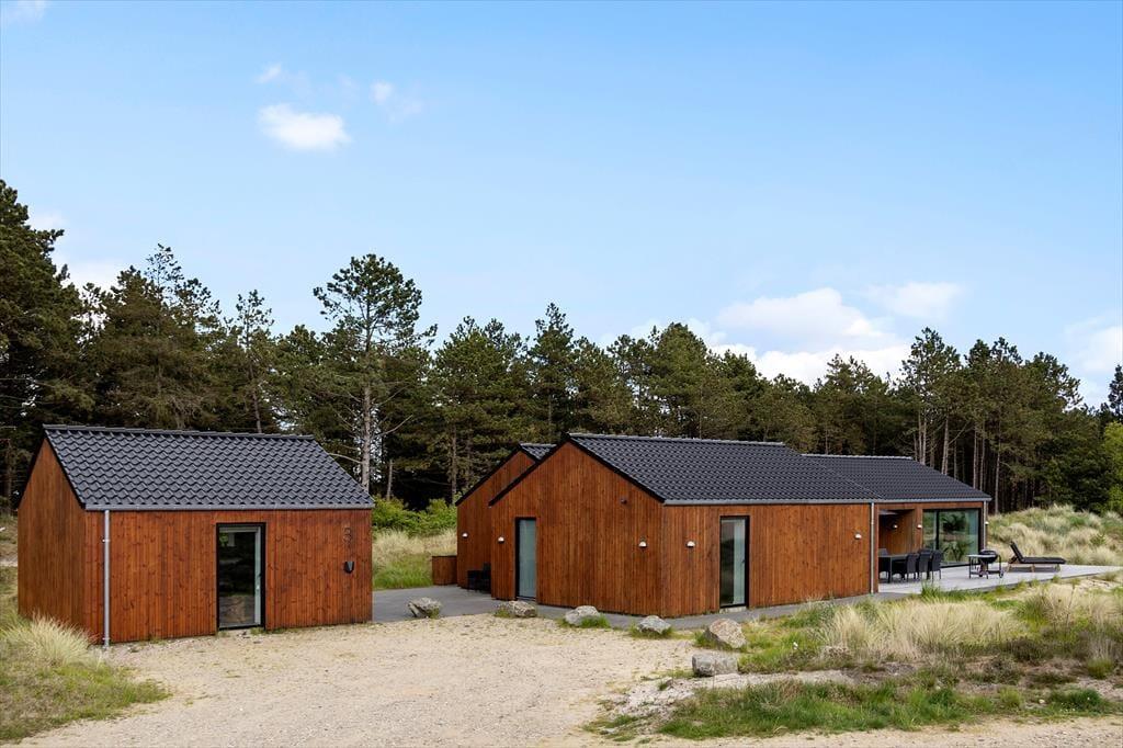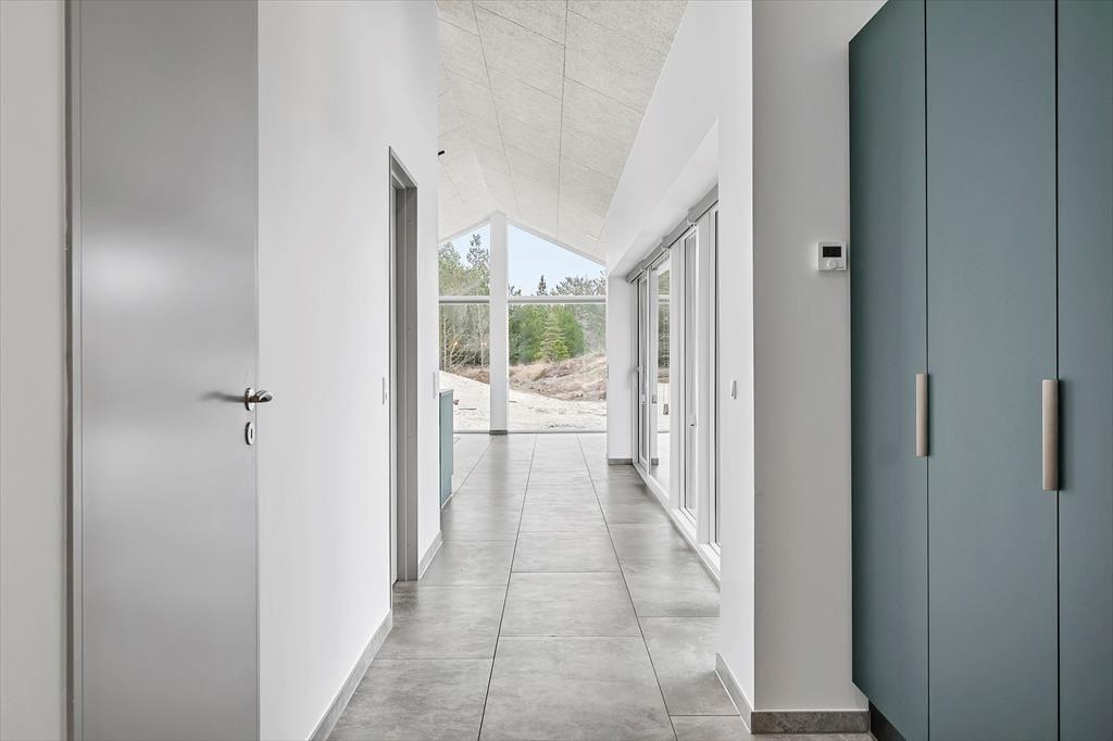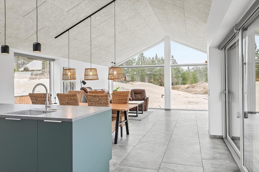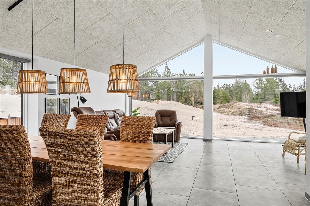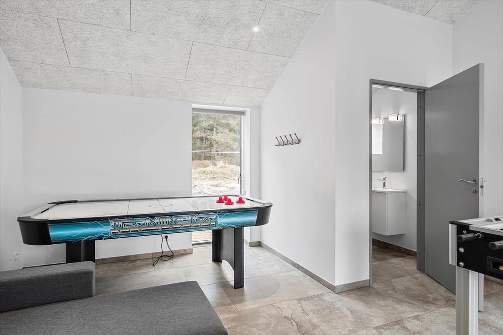 Sidste hånd blev lagt på indretningen i foråret 2023, og her blev der gjort brug af lækre materialer og moderne design, der passer smukt ind i de lyse og luftige rum. Akustiklofterne går helt til kip, og flotte, brede fliser pryder gulvene, mens store vinduespartier byder sollyset velkommen og giver udsigt til grundens fyrretræer. I stuen kan I streame film og serier på fladskærms-tv’et, hvis I trænger til at slappe af, og spisepladsen er et skønt samlingspunkt, når maden står klar i det åbne køkken. Efter måltidet kan I eventuelt rykke over i annekset, der er udstyret med blandt andet bordfodbold og airhockey. Annekset er også indrettet med en sovesofa og et gæstetoilet, så det fungerer som et godt supplement til sommerhusets stilfulde badeværelse og de tre dobbeltværelser.
