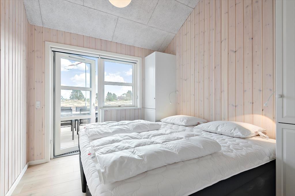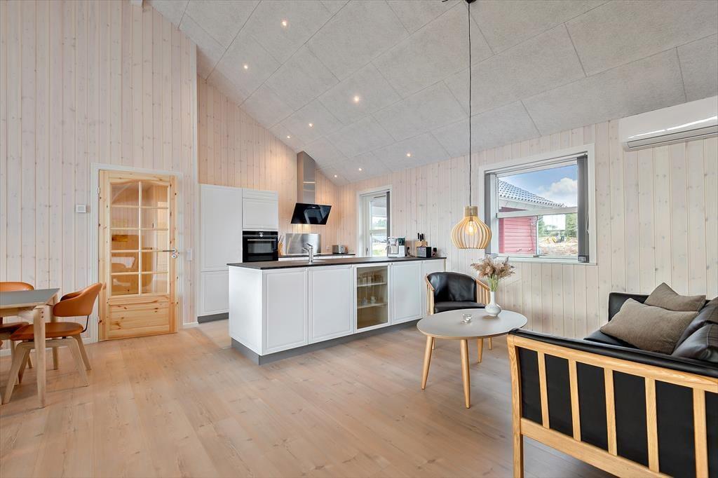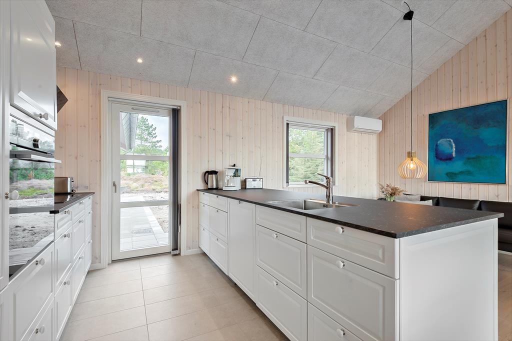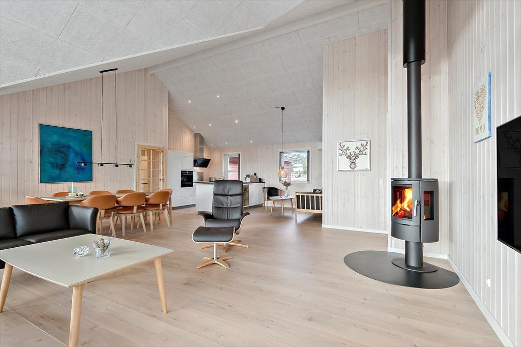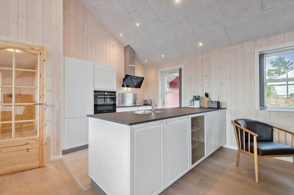 Med rød træfacade og hvide vinduesrammer kan huset passende kaldes for en nyfortolkning af et klassisk, dansk sommerhus. Inden døre er der dog højt til loftet, et skønt lysindfald og hele 150 m2 at brede sig på, og møblementet viser tydeligt, at der er tale om en moderne feriebolig af høj kvalitet. Husets fire soveværelser er ligeligt fordelt i begge af huset, og det er også her, I finder de to badeværelser. Det ene er med sauna og det andet med spabad, så I kan nemt flette en wellnessstund eller to ind i ferieprogrammet. En rummelig entré med vaskefaciliteter er også del af planløsningen, og endelig er der husets hjerte, som er et stort og skønt opholdsrum med lækkert køkken, brændeovn, fladskærm med Chromecast og andre dejlige detaljer.