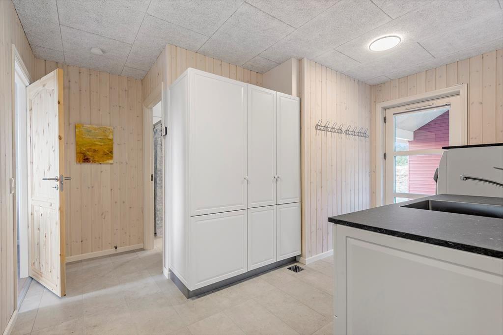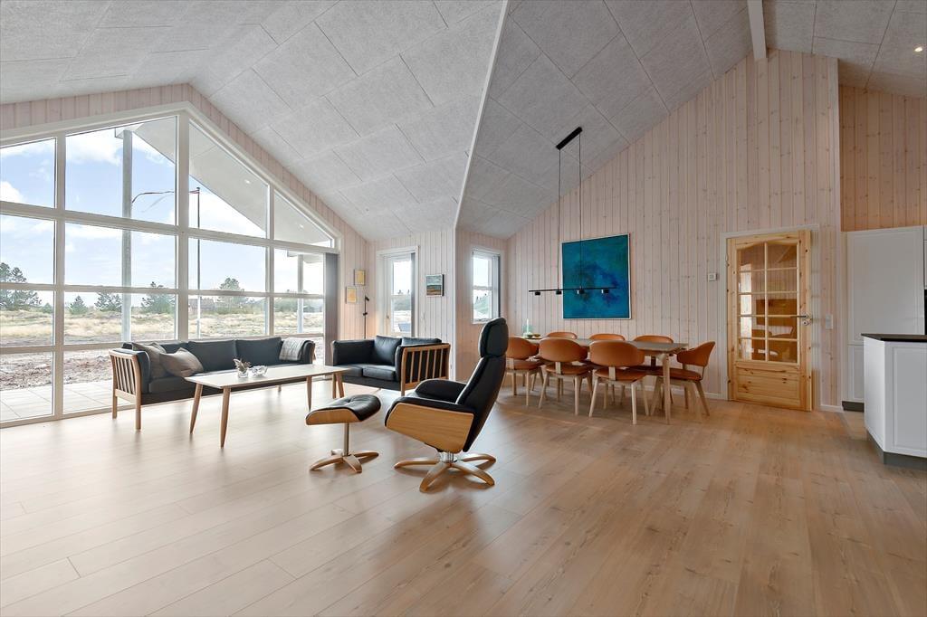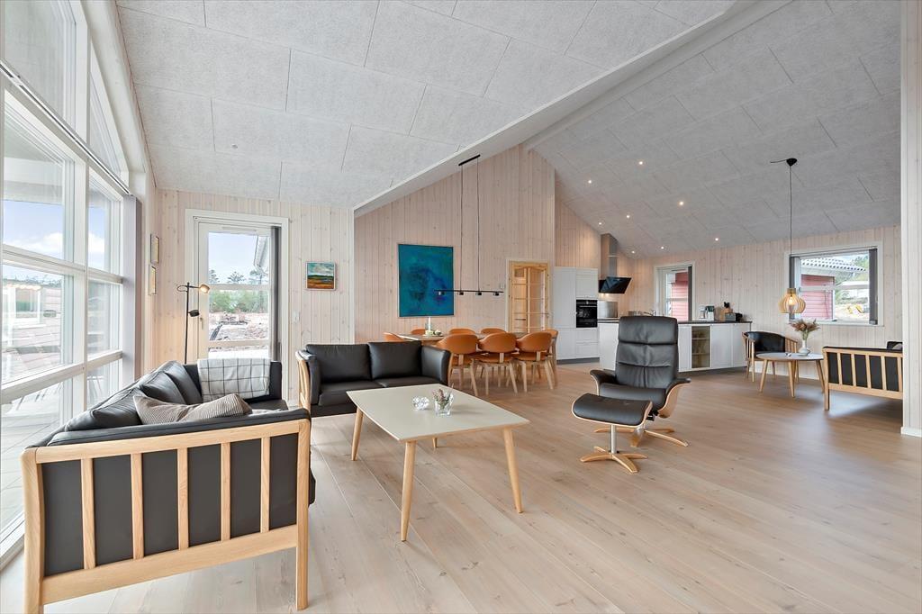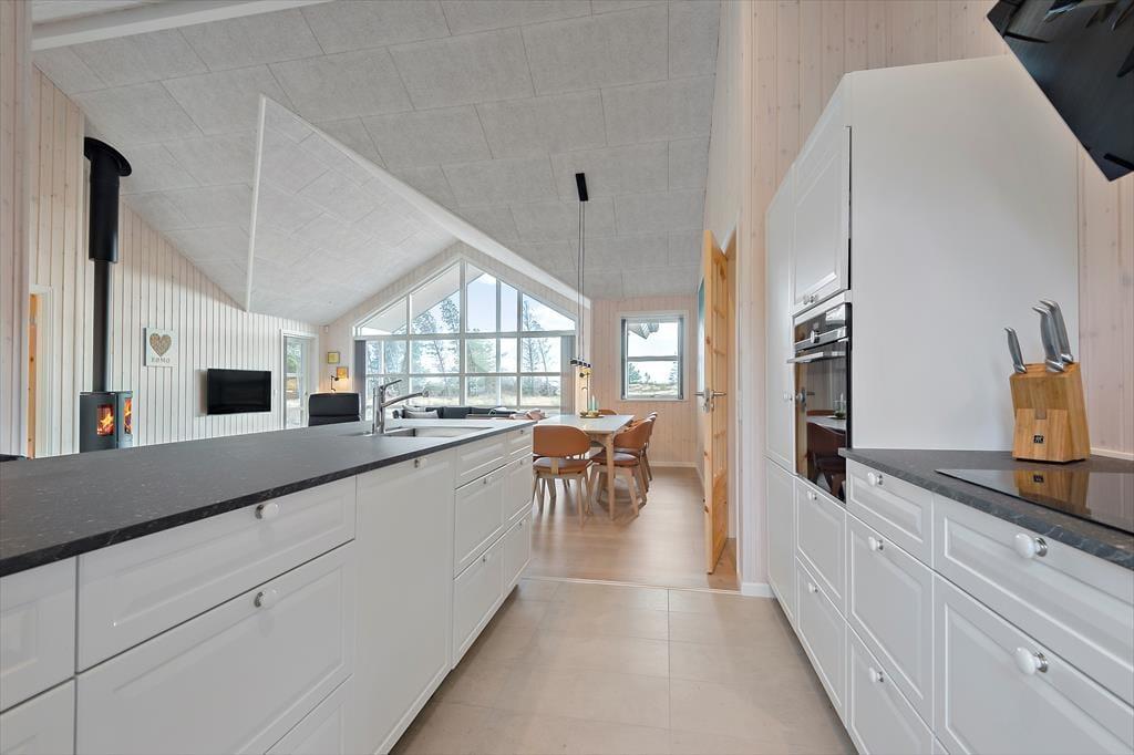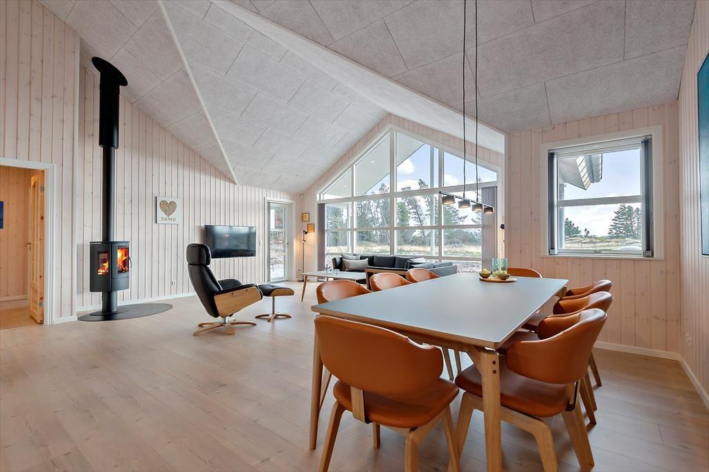 Med rød træfacade og hvide vinduesrammer kan huset passende kaldes for en nyfortolkning af et klassisk, dansk sommerhus. Inden døre er der dog højt til loftet, et skønt lysindfald og hele 150 m2 at brede sig på, og møblementet viser tydeligt, at der er tale om en moderne feriebolig af høj kvalitet. Husets fire soveværelser er ligeligt fordelt i begge af huset, og det er også her, I finder de to badeværelser. Det ene er med sauna og det andet med spabad, så I kan nemt flette en wellnessstund eller to ind i ferieprogrammet. En rummelig entré med vaskefaciliteter er også del af planløsningen, og endelig er der husets hjerte, som er et stort og skønt opholdsrum med lækkert køkken, brændeovn, fladskærm med Chromecast og andre dejlige detaljer.