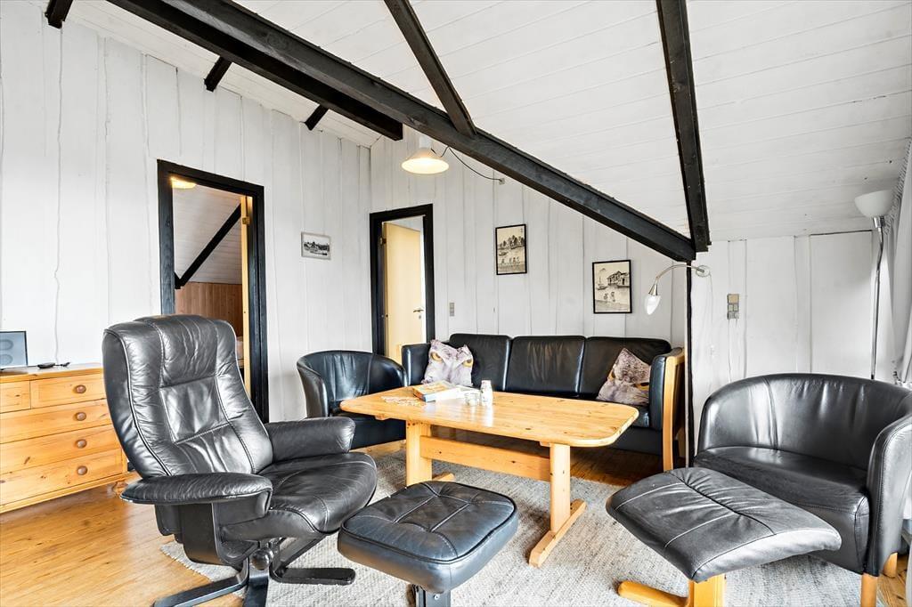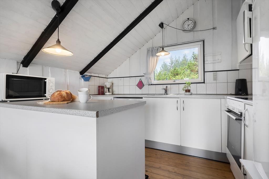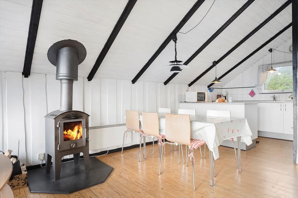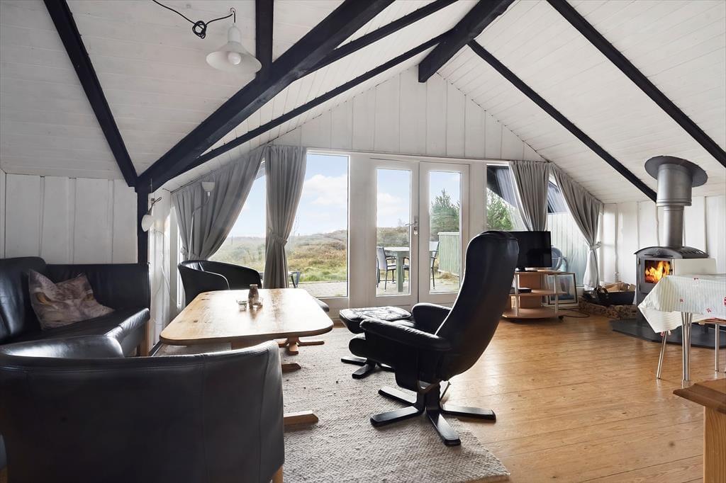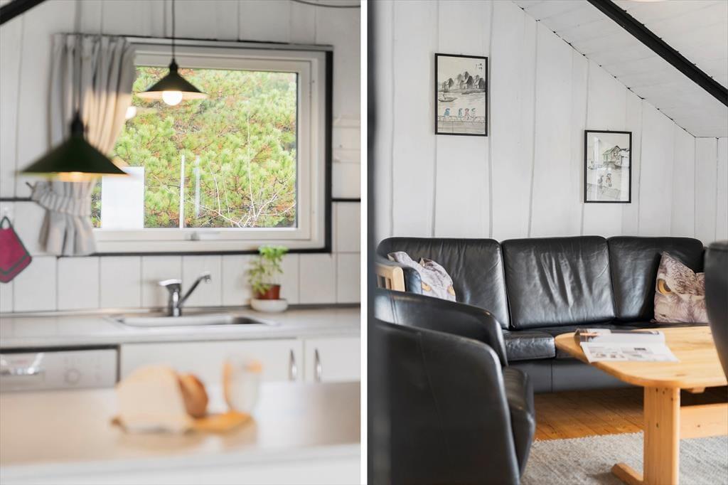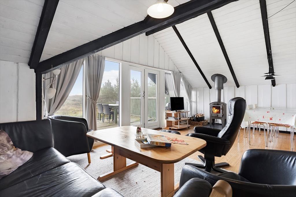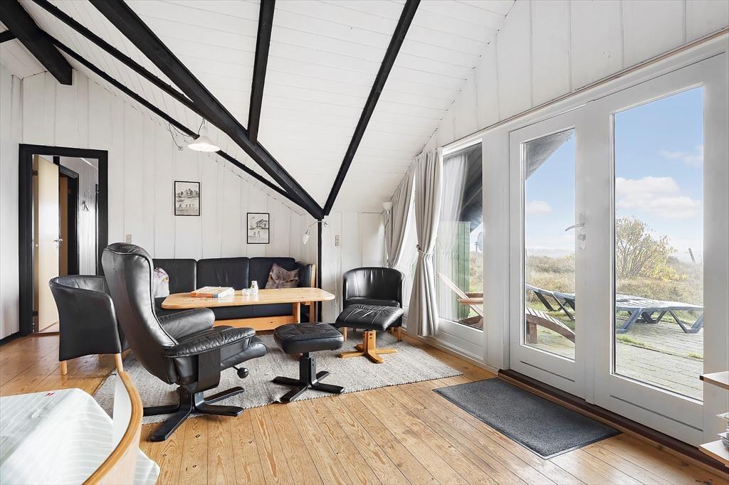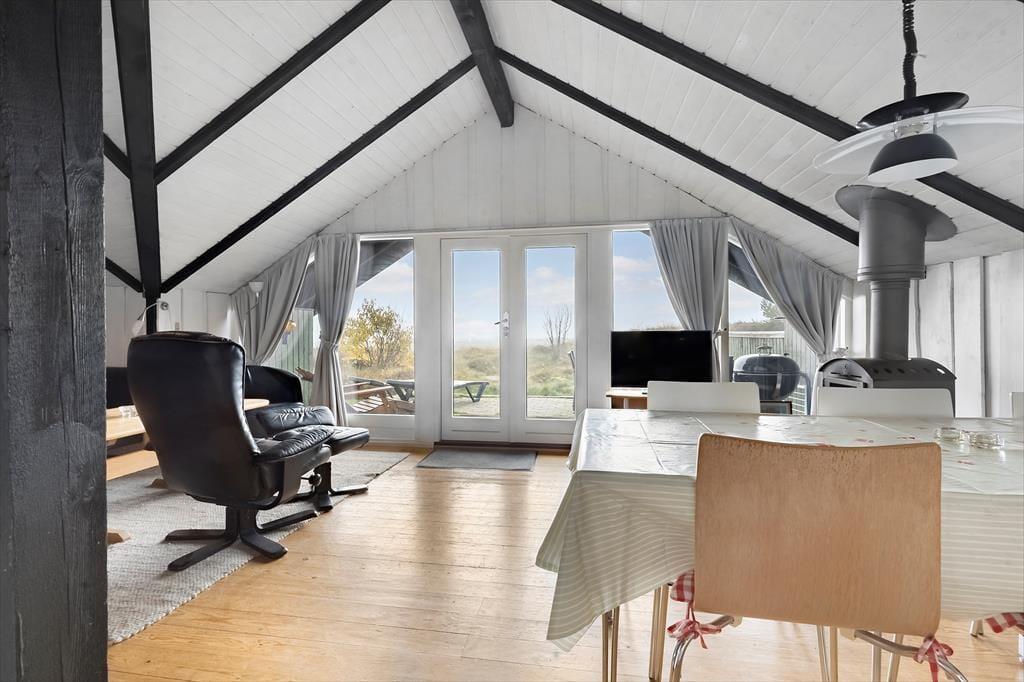 Indendørs mødes du af en lys og enkel indretning, der inviterer til afslapning og hygge. De lyse vægge og store vinduespartier lader solens stråler strømme ind og bringer naturen helt tæt på. I stuen kan du sidde i sofaen med en varm kop kaffe og følge tidevandets skiftende mønstre over Vadehavet – en udsigt, der ikke findes mange andre stedet på Rømø. Du kan stå tidligt op og opleve en solopgang, som maler himlen i orange, rosa og guld, direkte fra første parket. Køkkenet er funktionelt og veludstyret, så du kan tilberede både hurtige måltider og lækre ferieretter, mens du holder kontakten til resten af familien i stuen. Den åbne planløsning skaber en let og hyggelig stemning, hvor man kan samles, snakke og nyde feriens rolige rytme.