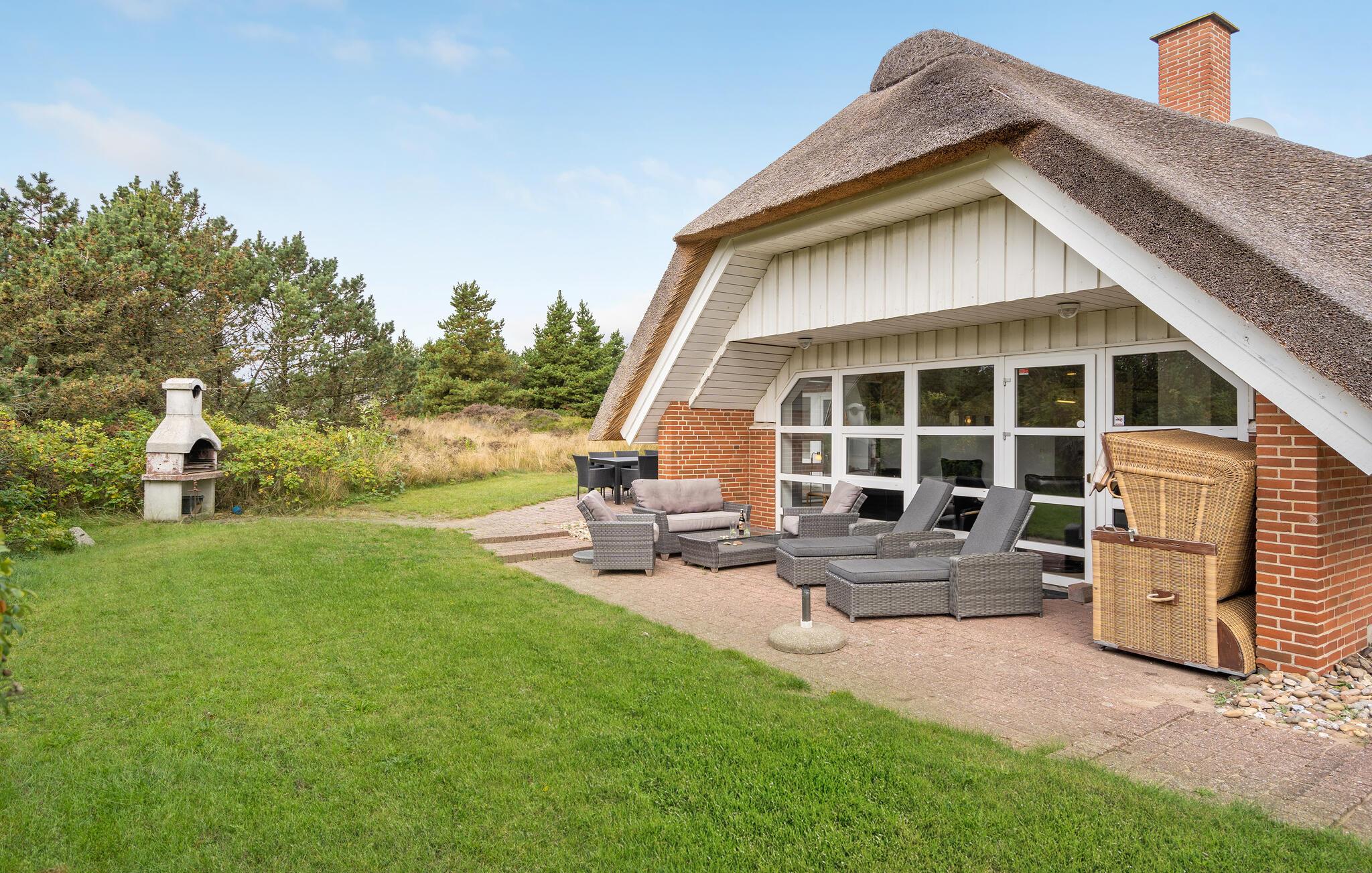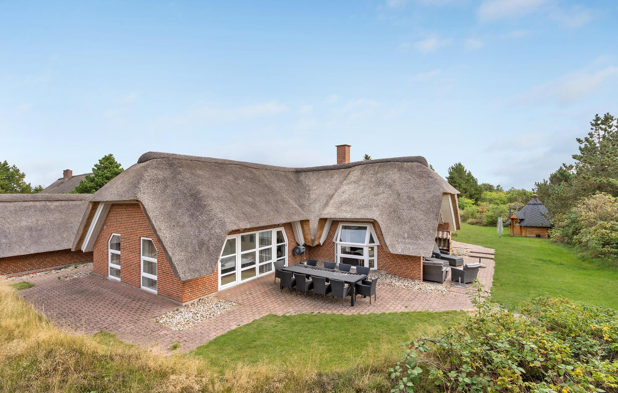 På en flot naturgrund ligger dette skønne, stråtækte murstenshus. På hemsen kan børnene hygge sig med bl.a. tv. Til de yngre familiemedlemmer er der også en veludstyret legeplads på grunden. Den helt store attraktion i huset er den skønne poolafdeling der foruden den lækre swimmingpool indeholder et 5-personers spabad, en velgørende sauna samt et badeværelse. Fra køkkenet og spisebordet er der udsyn til poolrummet. Den hyggelige stue med fritliggende bjælker er indrettet med flotte møbler i afstemte farver, og Smart-tv'et sørger for at I kan følge med i yndlingsserien under ferien. Træpilleovnen spreder hygge på kølige aftener, og træpillerne stilles gratis til rådighed.